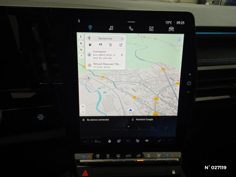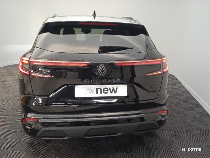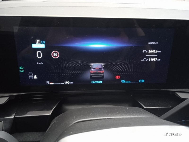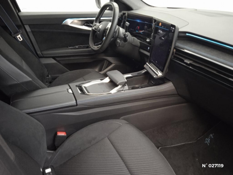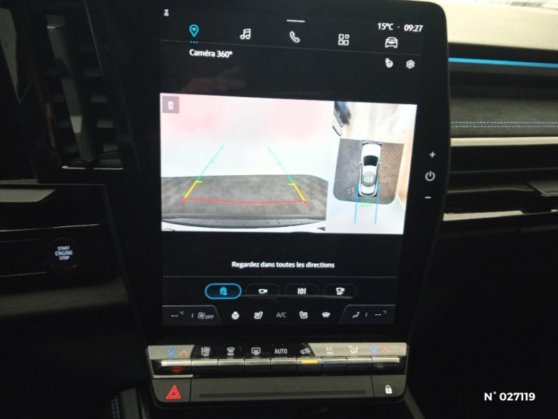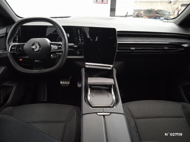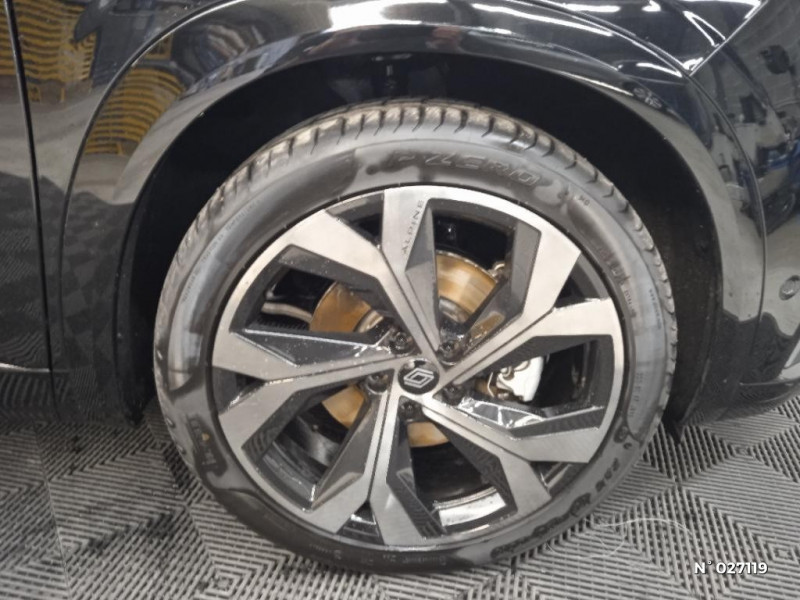 Miroir de surveillance enfants / Lumière d'ambiance personnalisable / Pare-brise chauffant / Rétroviseur intérieur électrochrome sans cadre / Rétroviseurs extérieurs électriques à mémoire, dégivrants, rabattables automatiquement / Siège conducteur électrique avec réglage lombaire et fonction massage, siège passager électrique / Ciel de toit gris anthracite / Barres de toit longitudinales / Commutation automatique des feux de route/croisement / Multi-sense / Carte Renault accès et démarrage mains libres / Volant chauffant / Airbags latéraux, milieu AV et rideaux / Alerte de distance de sécurité / Freinage actif d'urgence urbain (piéton + cycliste + intersection) / Kit de gonflage / Sièges avec système ISOFIX / Avertisseur d'angle mort et prévention sortie de voie en cas de dépassement / Frein de parking électrique avec fonction Auto-Hold / Caméra 3D vision 360° / Easy park assist et aides au parking avant, arrière et latérale / Feux AV full LED Adaptative Vision / Appuie-têtes AV grand confort / Banquette AR coulissante 1/3-2/3 avec accoudoir central / Console centrale avec repose main coulissant / Faux plancher de coffre / Hayon motorisé main libre / Navigation Google Maps / Tableau de bord full numérique 12,3'' / Alerte franchissement de ligne et assistant maintien dans la voie / Avertisseur de sortie de stationnement en marche AR avec freinage d'urgence automatique / Pré-équipement alarme / Sortie sécurisée des occupants / Active driver assist régulateur de vitesse adaptatif intelligent + centrage dans la voie / Clignotants AR dynamiques / Feux AR à LED avec effet 3D / Jantes alliage 20" Daytona diamantées noir / Pack Design esprit Alpine extérieur / Pack Design esprit Alpine intérieur / Sellerie mixte tissu carbone / alcantara avec surpiqures bleu / Seuil de portes / Volant cuir & Alcantara et surpiqures bleu/blanc/rouge / Eclairage d'accompagnement au sol avec projection logo / Système Multimédia openR link 12" : navigation, services Google, audio Arkamys Auditorium / Conduite hybride prédictive / 2 prises USB à l'AV et à l'AR