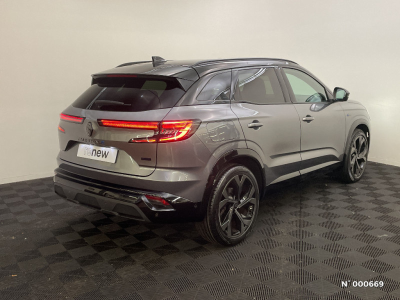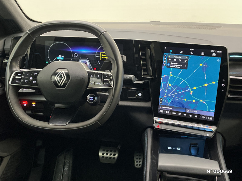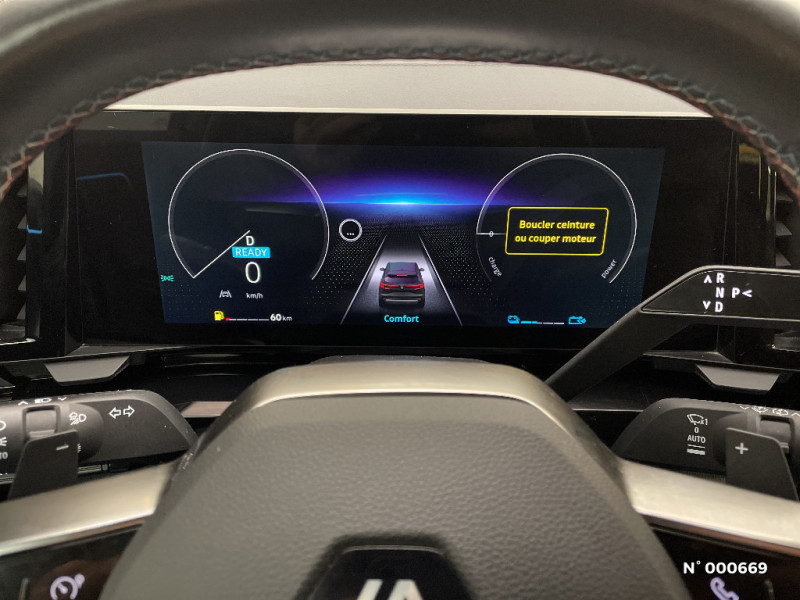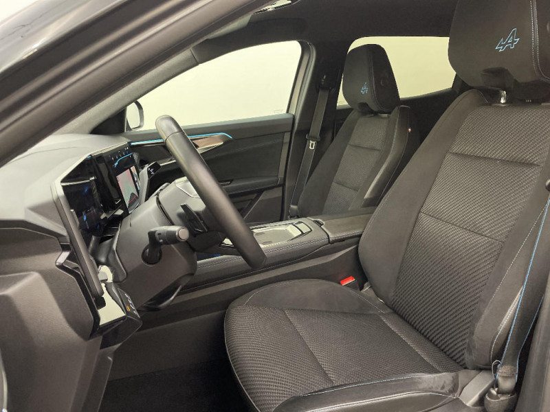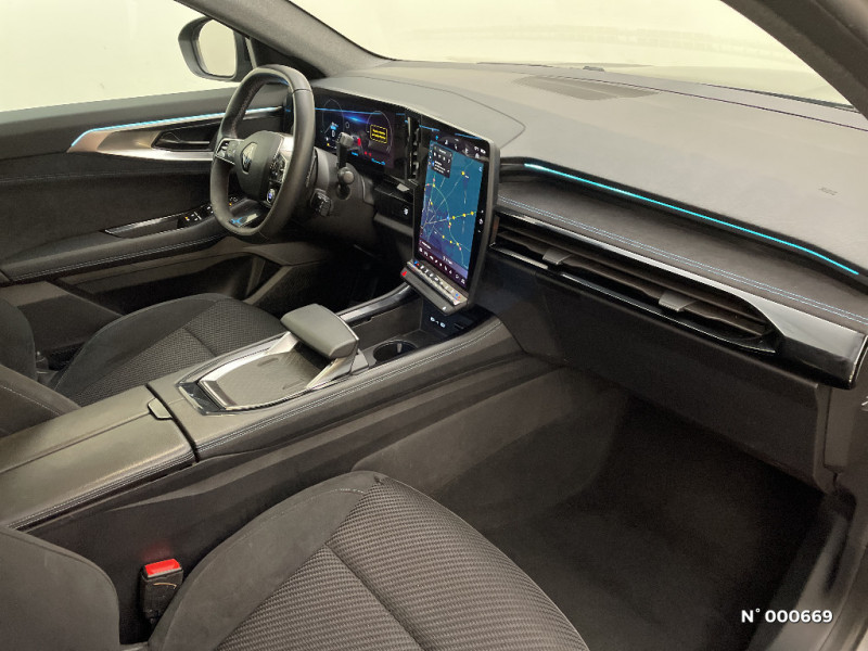 Appuie-têtes AV grand confort / Banquette AR coulissante 1/3-2/3 avec accoudoir central / Console centrale avec repose main coulissant / Rétroviseur intérieur électrochrome sans cadre / Rétroviseurs extérieurs électriques à mémoire, dégivrants, rabattables automatiquement / Siège conducteur électrique avec réglage lombaire et fonction massage, siège passager électrique / Faux plancher de coffre / Hayon motorisé main libre / Miroir de surveillance enfants / Lumière d'ambiance personnalisable / Pare-brise chauffant / Multi-sense / Carte Renault accès et démarrage mains libres / Barres de toit longitudinales / Peinture opaque / Commutation automatique des feux de route/croisement / Volant chauffant / Airbags latéraux, milieu AV et rideaux / Alerte de distance de sécurité / Freinage actif d'urgence urbain (piéton + cycliste + intersection) / Kit de gonflage / Sièges avec système ISOFIX / Avertisseur d'angle mort et prévention sortie de voie en cas de dépassement / Active driver assist / Notice d'utilisation digitale embarqué dans le système multimédia du véhicule / Caméra 3D vision 360° / Easy park assist et aides au parking avant, arrière et latérale / Feux AV full LED Adaptative Vision / Ciel de toit gris anthracite / Clignotants AR dynamiques / Feux AR à LED avec effet 3D / Jantes alliage 20" Daytona diamantées noir / Pack Design esprit Alpine extérieur / Pack Design esprit Alpine intérieur / Sellerie mixte tissu carbone / alcantara avec surpiqures bleu / Seuil de portes / Volant cuir & Alcantara et surpiqures bleu/blanc/rouge / 2 prises USB à l'AV et à l'AR / Navigation Google Maps / Système multimédia OpenR Link avec écran tactile 12" et services Google / Tableau de bord full numérique 12,3'' / Alerte franchissement de ligne et assistant maintien dans la voie / Avertisseur de sortie de stationnement en marche AR avec freinage d'urgence automatique / Pré-équipement alarme / Sortie sécurisée des occupants / Classe energetique 1 / Active driver assist régulateur de vitesse adaptatif intelligent + centrage dans la voie / Conduite hybride prédictive / Eclairage d'accompagnement au sol avec projection logo / Système Multimédia openR link 12" : navigation, services Google, audio Arkamys Auditorium