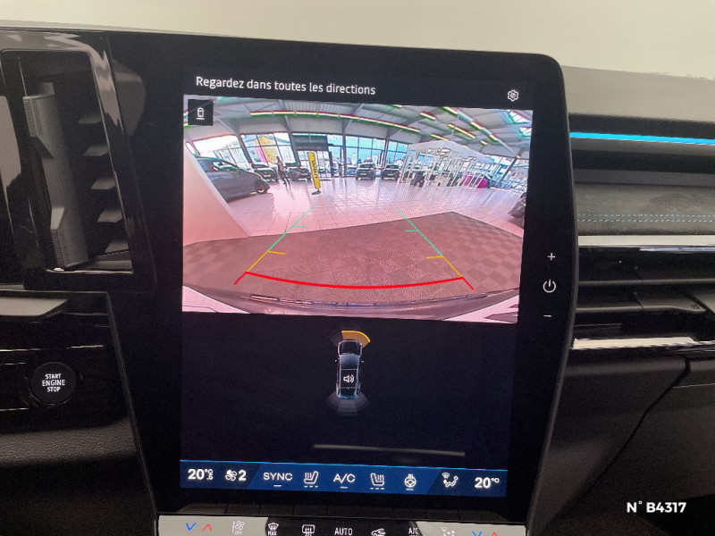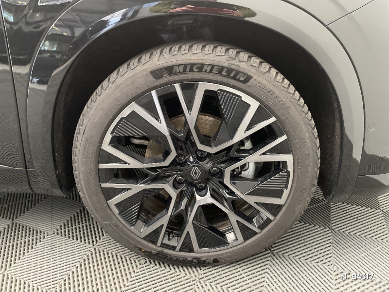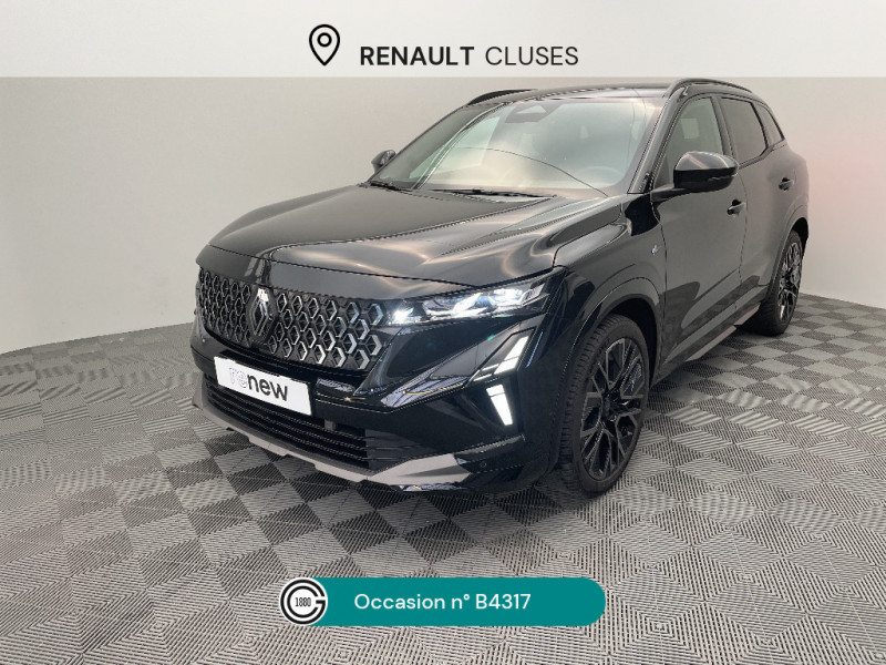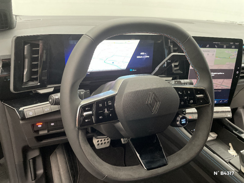Sellerie mixte tissu carbone Alcantara® avec surpiqûres bleu, blanc, rouge / Seuil de portes / Active driver assist régulateur de vitesse adaptatif intelligent + centrage dans la voie / Aide au parking AV/AR et latéral / Airbags latéraux, milieu AV et rideaux / Barres de toit longitudinales / Boîte de vitesse hybride multimode 6 rapports / Alerte de distance de sécurité / Alerte détection de fatigue / Alerte franchissement de ligne et assistant maintien dans la voie / Avertisseur d'angle mort et prévention sortie de voie en cas de dépassement / Avertisseur de sortie de stationnement en marche AR avec freinage d'urgence automatique / Banquette AR coulissante 1/3-2/3 avec accoudoir central / Carte Renault accès et démarrage mains libres / Ciel de toit gris anthracite / Clignotants AR dynamiques / Console centrale avec repose main coulissant / Détection intelligente des limitations de vitesse et prévention survitesse / Faux plancher de coffre / Feux AR à LED avec effet 3D / Feux LED adaptive vision (avec fonction antibrouillard intégrée) / Frein de parking électrique avec fonction Auto-Hold / Hayon motorisé main libre / Jantes alliage 20" Altitude diamanté noir avec vernis fumé gris / Kit de gonflage / Lumière d'ambiance personnalisable / Maintenance connectée, incluse pendant 8 ans / Mise à jour système (via firmware over the air FOTA), inclus pendant 5 ans / Multi-sense / My Safety switch (raccourci vers configuration personnalisée des aides à la conduite) / Navigation Google Maps / Notice d'utilisation digitale embarqué dans le système multimédia du véhicule / Pack connected driving, inclus pendant 5 ans / Pack contrôle à distance (via l¿application My Renault), inclus pendant 5 ans / Pack Design esprit Alpine extérieur / Pack Design esprit Alpine intérieur / Prédisposition éthylotest / Pré-équipement alarme / Rétroviseur intérieur électrochrome sans cadre / Siège conducteur électrique avec réglage lombaire et fonction massage, siège passager électrique / Sortie sécurisée des occupants / Système de reconnaissance du conducteur / Système ISOFIX sur siège passager & 2 places rang 2 / Système Multimédia openR link 12" : navigation, services Google, audio Arkamys Auditorium / Tableau de bord full numérique 12,3'' / Volant chauffant / 2 prises USB à l'AV et à l'AR