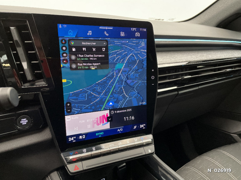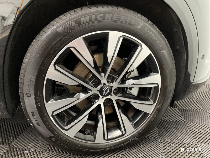 Alerte franchissement de ligne et assistant maintien dans la voie / Pré-équipement alarme / Système Multimédia openR link 12" : navigation, services Google, audio Arkamys Auditorium / Sellerie mixte / tissu dégradé de gris / textile enduit grainé / Alerte détection de fatigue / Prédisposition éthylotest / Détection intelligente des limitations de vitesse et prévention survitesse / My Safety switch (raccourci vers configuration personnalisée des aides à la conduite) / Boîte de vitesse automatique 4 rapports / Carte Renault accès et démarrage mains libres / Airbags latéraux, milieu AV et rideaux / Alerte de distance de sécurité / Kit de gonflage / Aide au parking AV/AR et latéral / Commutation automatique des feux de route/croisement / Multi-sense / Sièges avec système ISOFIX / Frein de parking électrique avec fonction Auto-Hold / Feux AV full LED Adaptative Vision / Banquette AR coulissante 1/3-2/3 avec accoudoir central / Console centrale avec repose main coulissant / Faux plancher de coffre / Miroir de surveillance enfants / Lumière d'ambiance personnalisable / Rétroviseur intérieur électrochrome sans cadre / Ciel de toit gris anthracite / Jantes alliage 19" Komah diamantées noir / 2 prises USB à l'AV et à l'AR / Navigation Google Maps / Tableau de bord full numérique 12,3''