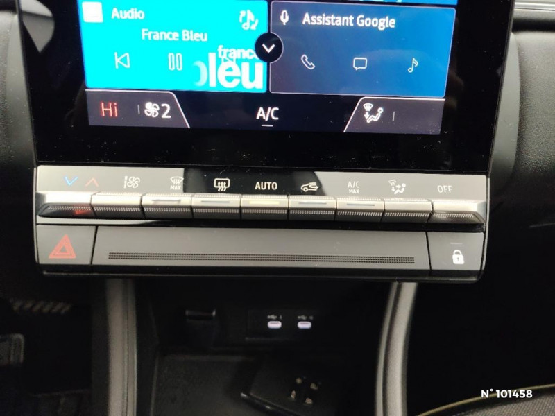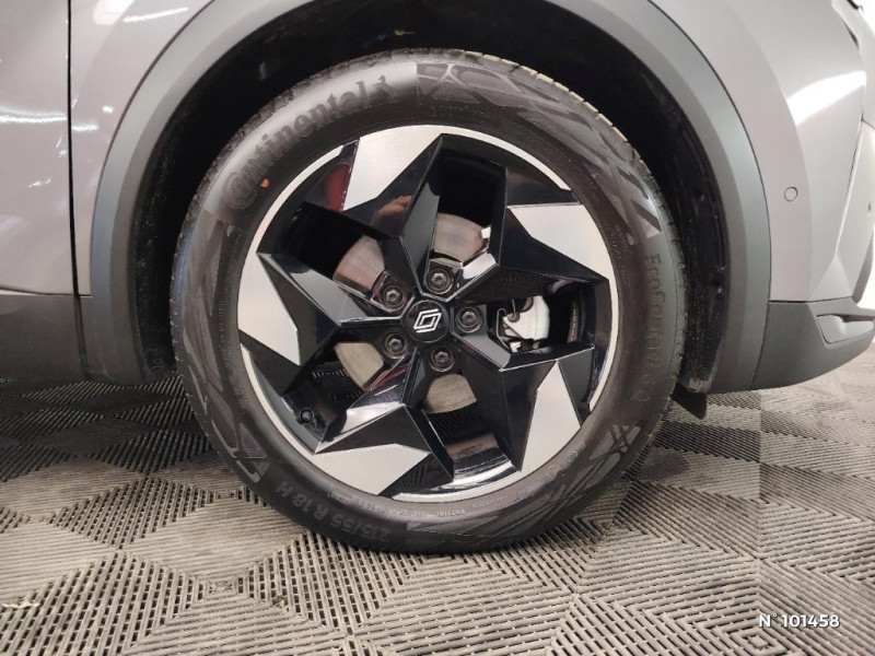 Poignées de portes ton caisse / Console centrale de rangement avec accoudoir / Répétiteurs latéraux de changement de direction / Harmonie noire / Condamnation centralisée des portes avec télécommande et condamnation des portes en roulant / Kit de gonflage et de réparation des pneumatiques / Alerte oubli des ceintures de sécurité aux 5 places / Alerte distance de sécurité - Information dans tableau de bord / Appel d'Urgence Renault / Système ISOFIX (i-Size) aux places latérales AR et passager AV / Antenne requin / Aide au parking AV/AR et latéral / Eclairage AV et AR Full LED Pure Vision / Renault Multi-sense / Liseuses AV à LED / Cartographie Standard / OpenR link 10,4??avec navigation et services Google et tableau de bord numérique 10" / Alerte sortie de voie / Sellerie Techno / Système multimédia openR link 10.4" avecGoogle intégré / Plancher de coffre mobile / Contrôle de la traction (TCS) / Boîte de vitesse automatique 4 rapports / Feux AR LED avec signature en forme de ''C'' et animation 3D / Coques de rétroviseurs noir/teinte caisse / Rétroviseur intérieur électrochrome / Ceinture centrale AR 3 points / Jantes Aluminium 18'' Black Hole / Peinture mono-ton / Indicateur de changement de vitesse / Hayon manuel / Frein de parking électrique avec fonction Auto-Hold / Sans pontets AR / Volant en tissus / Alerte détection de fatigue