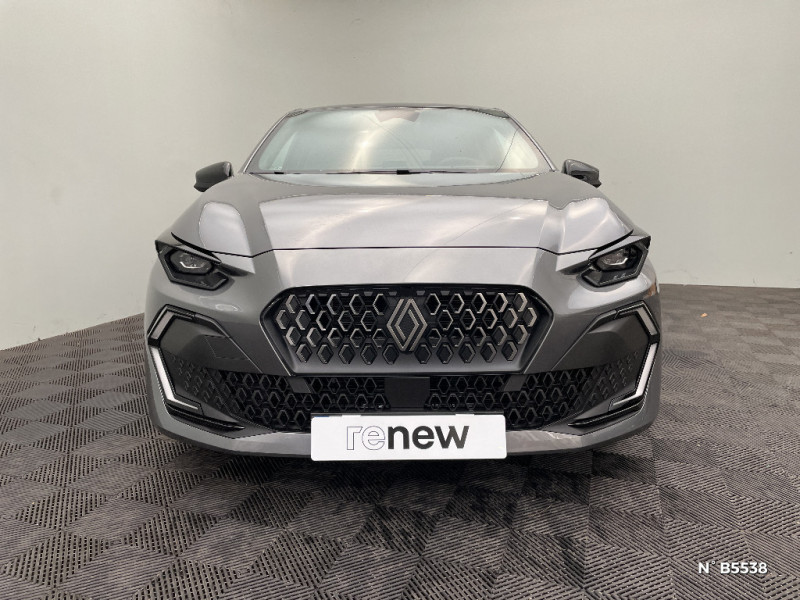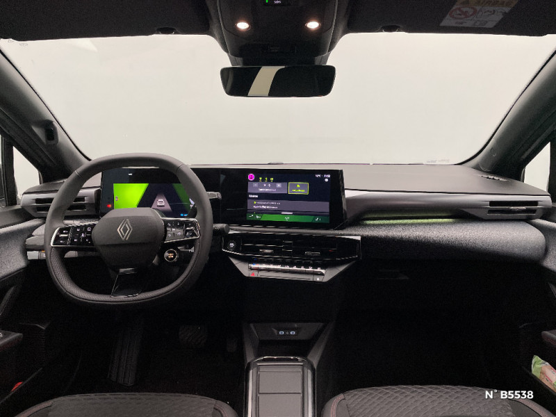 OpenR link 10,1'' : navigation, Google intégré, audio Arkamys Auditorium, 6 haut-parleurs / My Safety switch (raccourci vers configuration personnalisée des aides à la conduite) / Pack standard connectivity, via l'app My Renault / Réplication smartphone sans fil / Rétroviseur intérieur électrochrome avec mode jour/nuit automatique / Safety coach & safety score / Sans extension de connectivité / Sellerie textile 100% recyclé jacquard satin embossé noir, textile enduit, surpiqures rouges / Siège passager AV + 2 sièges AR avec technologie isofix® / Sièges AV réglables en profondeur et inclinaison / Tableau de bord avec écran d'instrumentation 10'' / Témoin et alerte de non-bouclage de ceinture de sécurité / Volant textile enduit grainé / Maintenance connectée, incluse pendant 8 ans / Mise à jour système à distance, inclus pendant 5 ans / Multi-sense : choix du mode de conduite / Alerte de vigilance conducteur avec détection de fatigue / Allumage automatique des phares avec commutation automatique des feux de route/ croisement / Antenne Requin / Avertisseur de distance de sécurité / Boîte de vitesse hybride multimode 6 rapports / Carte accès et démarrage mains-libres / Contrôle de la traction (TCS) / Détection intelligente des limitations de vitesse et prévention survitesse / Détections avec correction de trajectoire d¿urgence / Eclairage d'ambiance 3 zones / Harmonie noire / Jantes alliage diamantées noir 16'' dynamo / Kit anti-crevaison / Pack advanced connectivity