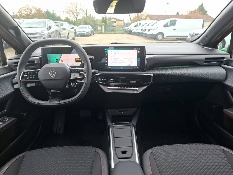 Alerte de vigilance conducteur avec détection de fatigue / Allumage automatique des phares avec commutation automatique des feux de route/ croisement / Antenne Requin / Avertisseur de distance de sécurité / Boîte de vitesse hybride multimode 6 rapports / Carte accès et démarrage mains-libres / Contrôle de la traction (TCS) / Détection intelligente des limitations de vitesse et prévention survitesse / Détections avec correction de trajectoire d'urgence / Eclairage d'ambiance 3 zones / Harmonie noire / Jantes alliage diamantées noir 16'' dynamo / Kit anti-crevaison / Maintenance connectée, incluse pendant 8 ans / Mise à jour système à distance, inclus pendant 5 ans / Multi-sense : choix du mode de conduite / My Safety switch (raccourci vers configuration personnalisée des aides à la conduite) / OpenR link 10,1'' : navigation, Google intégré, audio Arkamys Auditorium, 6 haut-parleurs / Pack advanced connectivity / Pack standard connectivity, via l'app My Renault / Réplication smartphone sans fil / Rétroviseur intérieur électrochrome avec mode jour/nuit automatique / Safety coach & safety score / Sans extension de connectivité / Sellerie textile 100% recyclé jacquard satin embossé noir, textile enduit, surpiqures rouges / Siège passager AV + 2 sièges AR avec technologie isofix® / Sièges AV réglables en profondeur et inclinaison / Tableau de bord avec écran d'instrumentation 10'' / Témoin et alerte de non-bouclage de ceinture de sécurité / Volant textile enduit grainé