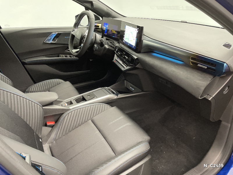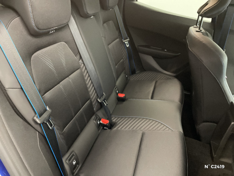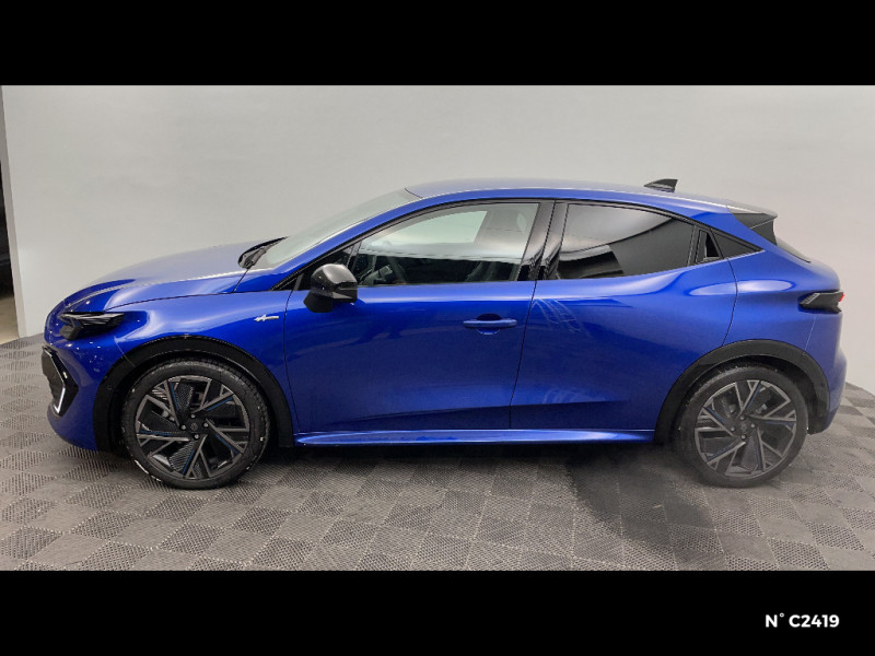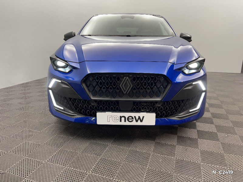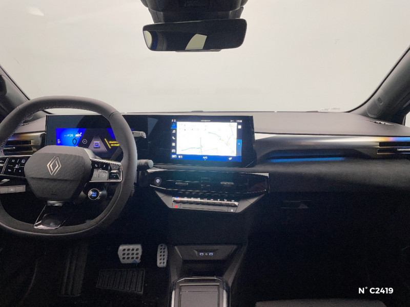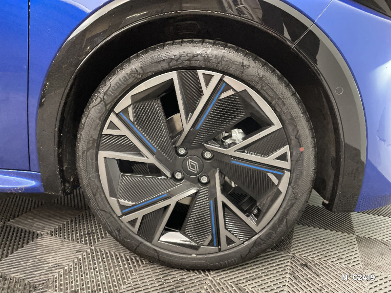 Alerte de vigilance conducteur avec détection de fatigue / Alerte sortie sécurisée des occupants / Allumage automatique des phares avec commutation automatique des feux de route/ croisement / Antenne Requin / Avertisseur d'angle mort et détection AR avec correction trajectoire d'urgence / Avertisseur de distance de sécurité / Avertisseur de sortie de stationnement en marche AR avec freinage d'urgence automatique / Boîte de vitesse hybride multimode 6 rapports / Carte accès et démarrage mains-libres / Conduite semi-autonome de niveau 1 avec centrage dans la voie / Contrôle de la traction (TCS) / Détection intelligente des limitations de vitesse et prévention survitesse / Sellerie textile 100% recyclé noir et textile enduit matelassé, Alcantara®, surpiqures bleues / Siège passager AV + 2 sièges AR avec technologie isofix® / Tableau de bord avec écran d'instrumentation 10'' / Témoin et alerte de non-bouclage de ceinture de sécurité / Safety coach & safety score / Rétroviseur intérieur électrochrome avec mode jour/nuit automatique / Détections avec correction de trajectoire d'urgence / Eclairage d'ambiance 3 zones / Harmonie / Jantes alliage 18'' diamantées cosmic / Kit anti-crevaison / Maintenance connectée, incluse pendant 8 ans / Mise à jour système à distance, inclus pendant 5 ans / Multi-sense : choix du mode de conduite / My Safety switch (raccourci vers configuration personnalisée des aides à la conduite) / OpenR link 10,1'' : navigation, Google intégré, audio Arkamys Auditorium, 6 haut-parleurs / Pack advanced connectivity / Pack standard connectivity, via l'app My Renault / Régulateur de vitesse adaptatif intelligent + centrage dans la voie / Réplication smartphone sans fil / Aide au parking AV/AR et latéral
