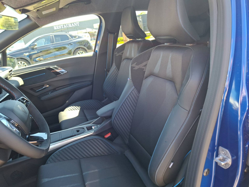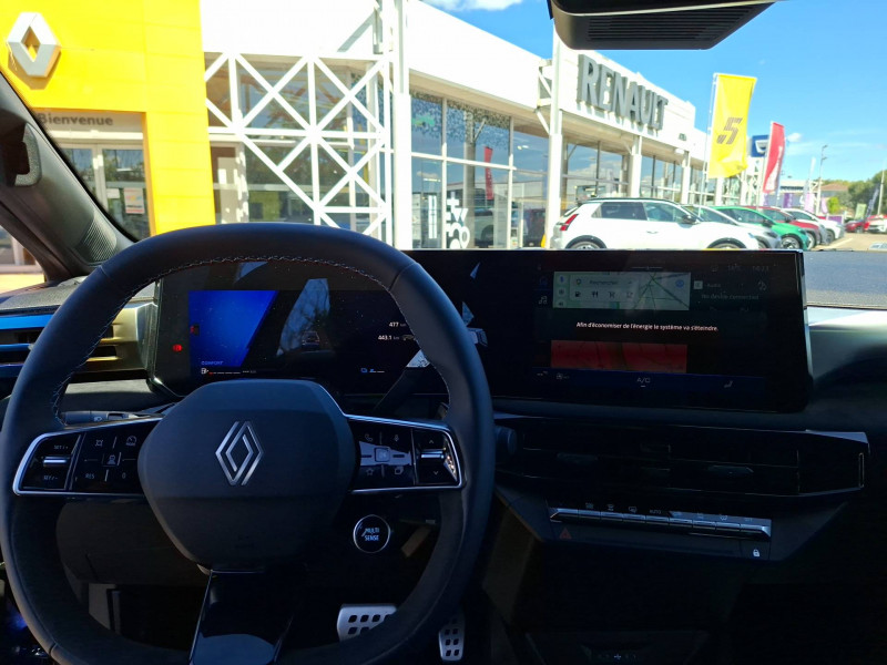 Aide au parking AV/AR et latéral / Alerte de vigilance conducteur avec détection de fatigue / Alerte sortie sécurisée des occupants / Allumage automatique des phares avec commutation automatique des feux de route/ croisement / Antenne Requin / Avertisseur d'angle mort et détection AR avec correction trajectoire d'urgence / Avertisseur de distance de sécurité / Avertisseur de sortie de stationnement en marche AR avec freinage d'urgence automatique / Boîte de vitesse hybride multimode 6 rapports / Carte accès et démarrage mains-libres / Conduite semi-autonome de niveau 1 avec centrage dans la voie / Contrôle de la traction (TCS) / Détection intelligente des limitations de vitesse et prévention survitesse / Détections avec correction de trajectoire d'urgence / Eclairage d'ambiance 3 zones / Harmonie / Jantes alliage 18'' diamantées cosmic / Kit anti-crevaison / Maintenance connectée, incluse pendant 8 ans / Mise à jour système à distance, inclus pendant 5 ans / Multi-sense : choix du mode de conduite / My Safety switch (raccourci vers configuration personnalisée des aides à la conduite) / OpenR link 10,1'' : navigation, Google intégré, audio Arkamys Auditorium, 6 haut-parleurs / Pack advanced connectivity / Pack standard connectivity, via l'app My Renault / Régulateur de vitesse adaptatif intelligent + centrage dans la voie / Réplication smartphone sans fil / Rétroviseur intérieur électrochrome avec mode jour/nuit automatique / Safety coach & safety score / Sans extension de connectivité / Sellerie textile 100% recyclé noir et textile enduit matelassé, Alcantara®, surpiqures bleues / Siège passager AV + 2 sièges AR avec technologie isofix® / Tableau de bord avec écran d'instrumentation 10'' / Témoin et alerte de non-bouclage de ceinture de sécurité