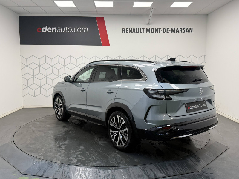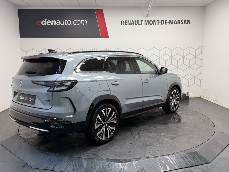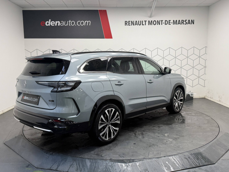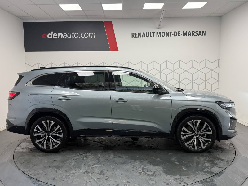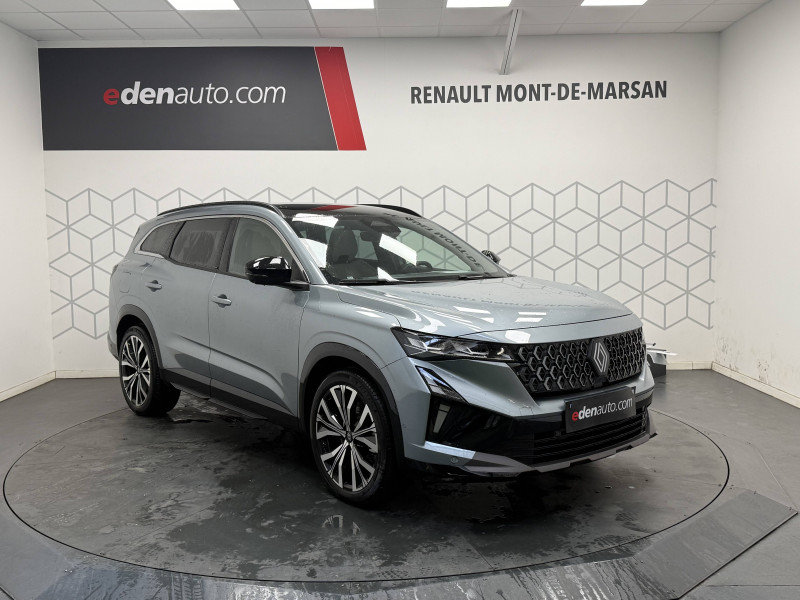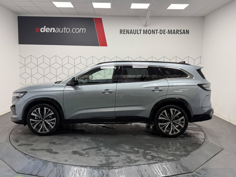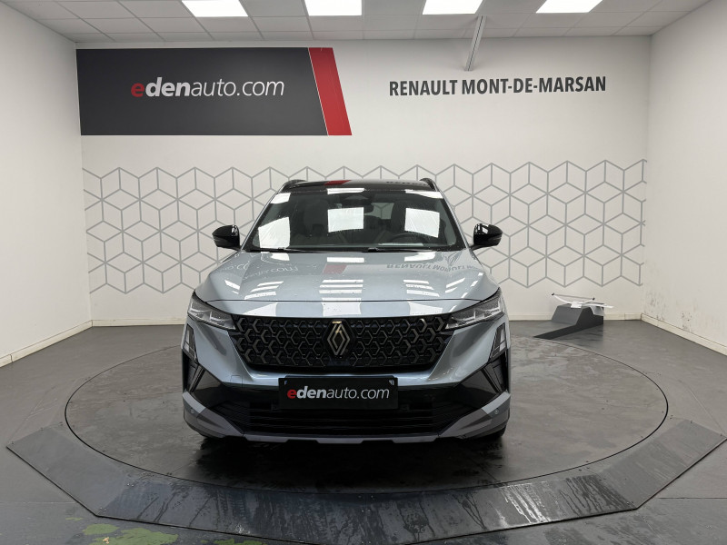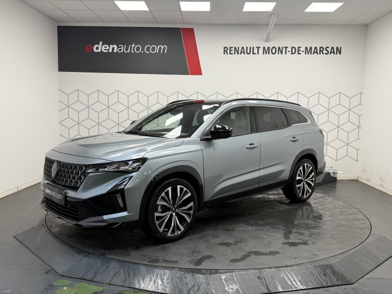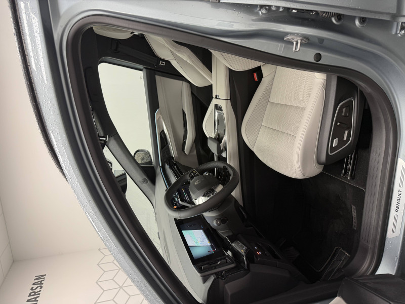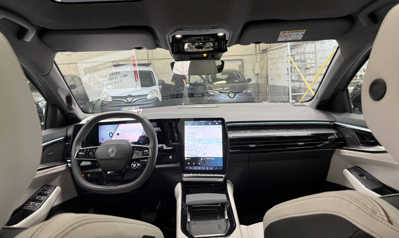 2 prises USB-C à l'AV et à l'AR / 4Control advanced / 5 places / Active driver assist régulateur de vitesse adaptatif intelligent + centrage dans la voie / Alerte de distance de sécurité / Alerte détection de fatigue / Alerte franchissement de ligne et assistant maintien dans la voie / Assistance de conduite avec une remorque / Avertisseur d'angle mort et prévention sortie de voie en cas de dépassement / Avertisseur de sortie de stationnement en marche AR avec freinage d'urgence automatique / Banquette AR coulissante 1/3-2/3 avec dossier 40/20/40 / Barres de toit longitudinales / Boîte de vitesse hybride multimode 6 rapports / Caméra 3D vision 360° / Carte Renault accès et démarrage mains libres / Ciel de toit gris anthracite / Clignotants AR dynamiques / Conduite prédictive (gestion de l'énergie de la batterie) / Console de toit avec porte-lunettes / Contrôle de la traction (TCS) / Détection intelligente des limitations de vitesse et prévention survitesse / Eclairage d'accompagnement au sol avec projection logo / Feux AR à LED avec effet 3D / Feux LED adaptive vision (avec fonction antibrouillard intégrée) / Frein de parking électrique avec fonction Auto-Hold / Hayon motorisé main libre / Intérieur Iconic gris / Jantes alliage 20" Effie diamantées noir / Lumière d'ambiance personnalisable / Maintenance connectée, incluse pendant 8 ans / Miroir de surveillance enfants / Mise à jour système (via firmware over the air FOTA), inclus pendant 5 ans / Multi-sense / My Safety switch (raccourci vers configuration personnalisée des aides à la conduite) / Notice d'utilisation digitale embarqué dans le système multimédia du véhicule / Pack connected driving, inclus pendant 5 ans / Pack contrôle à distance (via l'application My Renault), inclus pendant 5 ans / Parking mains-libres (inclus aides au parking AV, AR et latérale) / Prédisposition éthylotest / Rétroviseur intérieur électrochrome sans cadre / Rétroviseurs extérieurs électriques à mémoire, dégivrants, rabattables automatiquement / Sellerie mixte tissu gris / textile enduit grainé clair / Seuil de portes / Sièges AV électriques à mémoire avec réglage et massage lombaire conducteur / Sortie sécurisée des occupants / Système de reconnaissance du conducteur / Système ISOFIX sur siège passager & 2 places rang 2 / Système Multimédia openR link 12" : navigation, services Google, audio Arkamys Auditorium / Tableau de bord full numérique 12,3'' / Volant chauffant / Volume de coffre augmenté de 100 l (norme VDA)