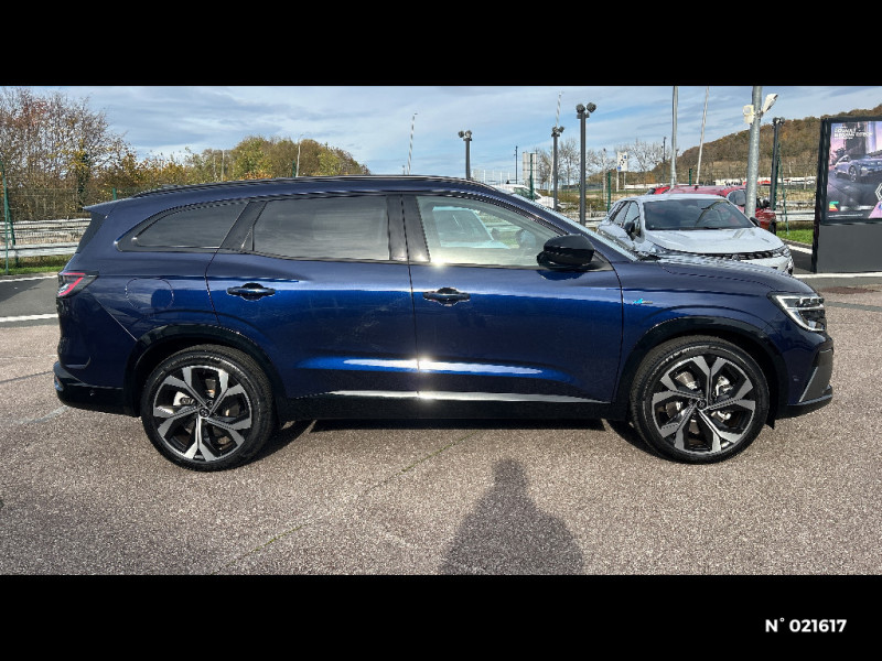 Barres de toit longitudinales / Aide au parking AV/AR et latéral / Commutation automatique des feux de route/croisement / Multi-sense / Carte Renault accès et démarrage mains libres / Alerte de distance de sécurité / Avertisseur d'angle mort et prévention sortie de voie en cas de dépassement / Frein de parking électrique avec fonction Auto-Hold / 4Control advanced / Feux AV full LED Adaptative Vision / Faux plancher de coffre / Hayon motorisé main libre / Miroir de surveillance enfants / Lumière d'ambiance personnalisable / Rétroviseur intérieur électrochrome sans cadre / Ciel de toit gris anthracite / Clignotants AR dynamiques / Feux AR à LED avec effet 3D / Jantes alliage 20" Daytona diamantées noir / Pack Design esprit Alpine intérieur / Sellerie mixte tissu carbone / alcantara avec surpiqures bleu / Seuil de portes / Tableau de bord full numérique 12,3'' / Alerte franchissement de ligne et assistant maintien dans la voie / Avertisseur de sortie de stationnement en marche AR avec freinage d'urgence automatique / Sortie sécurisée des occupants / Assistance de conduite avec une remorque / 7 places / Banquette AR coulissante 1/3-2/3 avec dossier 40/20/40 / Pack Design esprit Alpine avec calandre à damiers / Prises au rang 3 / Système Multimédia openR link 12" : navigation, services Google, audio Arkamys Auditorium / Système ISOFIX sur siège passager & 2 places rang 2 / Alerte détection de fatigue / Prédisposition éthylotest / Détection intelligente des limitations de vitesse et prévention survitesse / My Safety switch (raccourci vers configuration personnalisée des aides à la conduite) / Contrôle de la traction (TCS) / Boîte de vitesse automatique 4 rapports