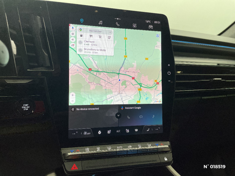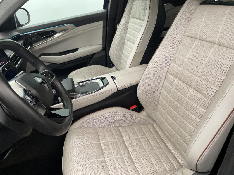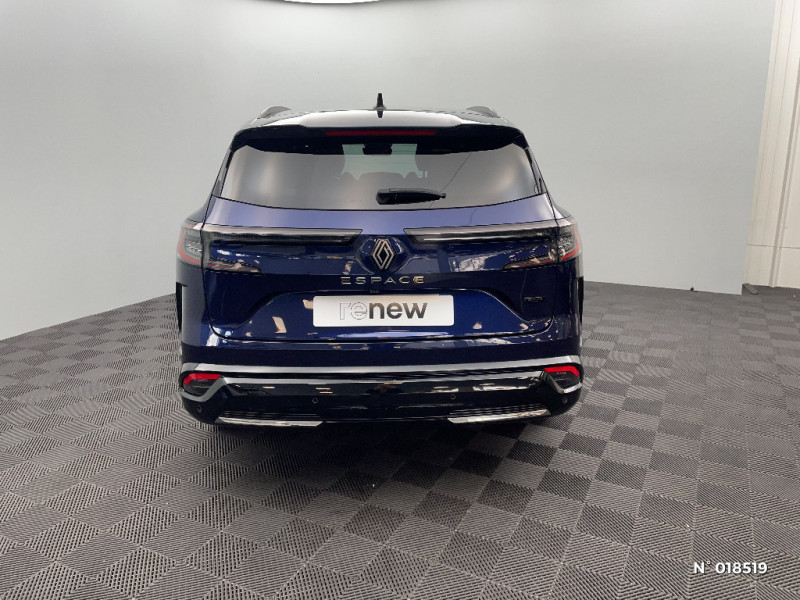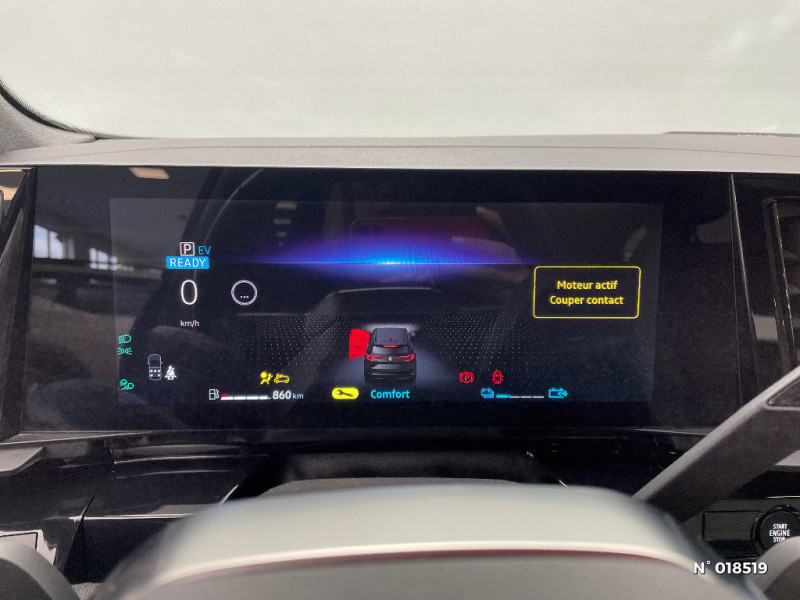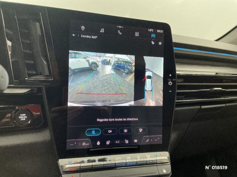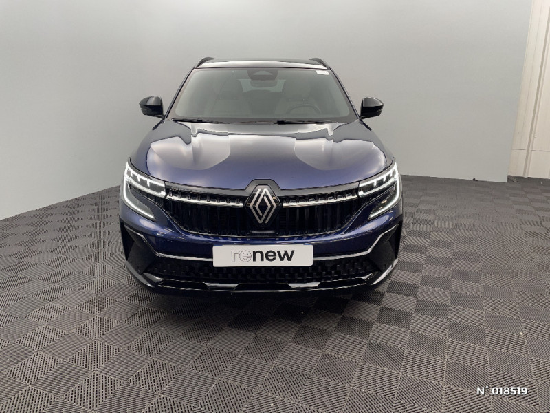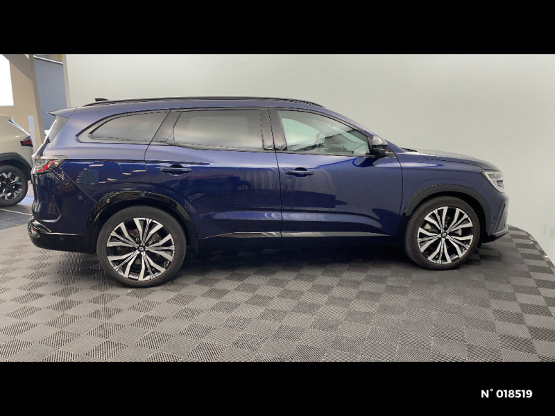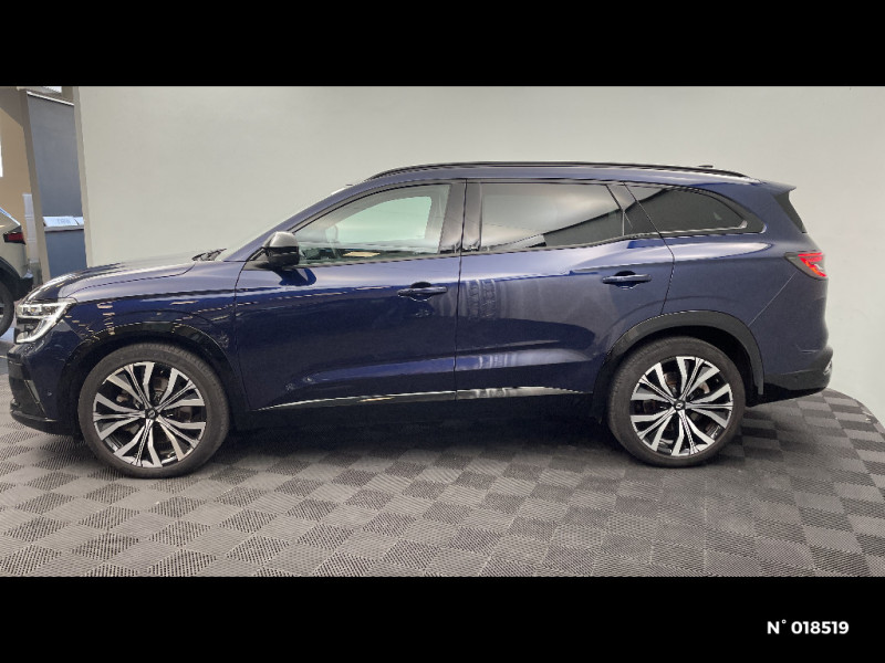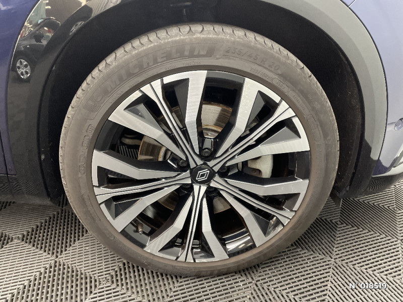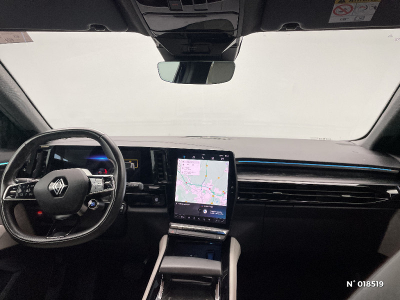 Eclairage d'accompagnement au sol avec projection logo / Sellerie cuir gris sable clair perforée avec surpiqures et joncs ambrés / Prises au rang 3 / Système Multimédia openR link 12" : navigation, services Google, audio Arkamys Auditorium / Système ISOFIX sur siège passager & 2 places rang 2 / Coussins grand confort sur appuie-tête AR gris sable clair / Tableau de bord full numérique 12,3'' / Alerte franchissement de ligne et assistant maintien dans la voie / Avertisseur de sortie de stationnement en marche AR avec freinage d'urgence automatique / Sortie sécurisée des occupants / Classe energetique 1 / Assistance de conduite avec une remorque / Parking mains-libres (inclus aides au parking AV, AR et latérale) / 7 places / Banquette AR coulissante 1/3-2/3 avec dossier 40/20/40 / Sièges AV électriques à mémoire avec réglage et massage lombaire conducteur / Volant chauffant / Alerte de distance de sécurité / Freinage actif d'urgence urbain (piéton + cycliste + intersection) / Avertisseur d'angle mort et prévention sortie de voie en cas de dépassement / 4Control advanced / Caméra 3D vision 360° / Feux AV full LED Adaptative Vision / Appuie-têtes AV grand confort / Faux plancher de coffre / Hayon motorisé main libre / Miroir de surveillance enfants / Lumière d'ambiance personnalisable / Pare-brise chauffant / Rétroviseur intérieur électrochrome sans cadre / Rétroviseurs extérieurs électriques à mémoire, dégivrants, rabattables automatiquement / Ciel de toit gris anthracite / Clignotants AR dynamiques / Feux AR à LED avec effet 3D / Jantes alliage 20" Effie diamantées noir / Seuil de portes / Barres de toit longitudinales / Commutation automatique des feux de route/croisement / Multi-sense / Carte Renault accès et démarrage mains libres