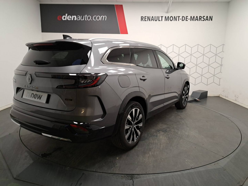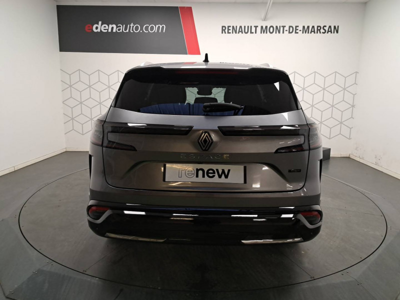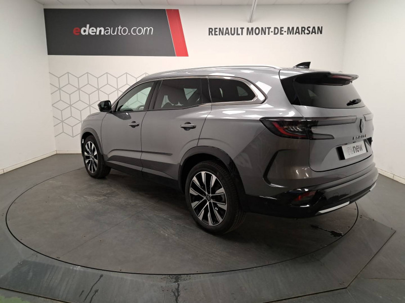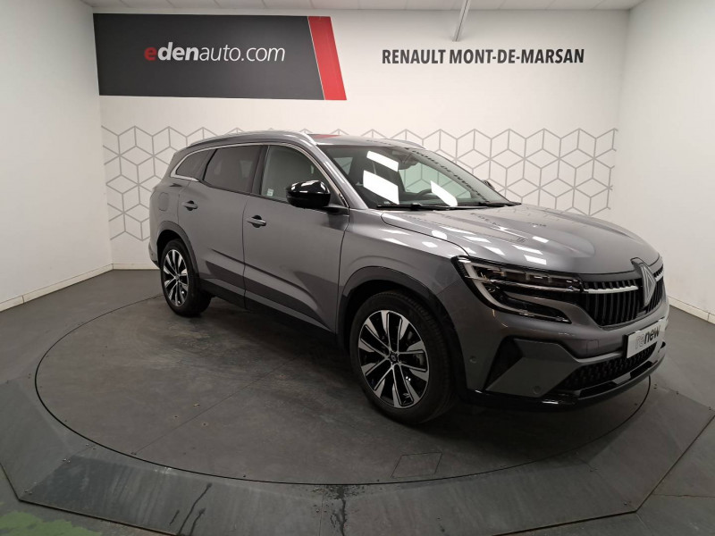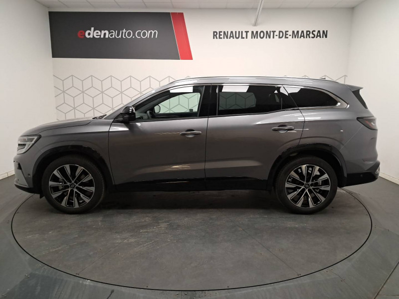 7 places / Aide au parking AV/AR et latéral / Alerte de distance de sécurité / Alerte détection de fatigue / Alerte franchissement de ligne et assistant maintien dans la voie / Assistance de conduite avec une remorque / Avertisseur d'angle mort et prévention sortie de voie en cas de dépassement / Avertisseur de sortie de stationnement en marche AR avec freinage d'urgence automatique / Banquette AR coulissante 1/3-2/3 avec dossier 40/20/40 / Barres de toit longitudinales / Boîte de vitesse automatique 4 rapports / Carte Renault accès et démarrage mains libres / Ciel de toit gris anthracite / Commutation automatique des feux de route/croisement / Contrôle de la traction (TCS) / Détection intelligente des limitations de vitesse et prévention survitesse / Faux plancher de coffre / Feux AV full LED Adaptative Vision / Frein de parking électrique avec fonction Auto-Hold / Jantes alliage 19" Komah diamantées noir / Lumière d'ambiance personnalisable / Miroir de surveillance enfants / Multi-sense / My Safety switch (raccourci vers configuration personnalisée des aides à la conduite) / Prédisposition éthylotest / Prises au rang 3 / Rétroviseur intérieur électrochrome sans cadre / Sellerie mixte tissu gris / textile enduit grainé noir / Sortie sécurisée des occupants / Système ISOFIX sur siège passager & 2 places rang 2 / Système Multimédia openR link 12" : navigation, services Google, audio Arkamys Auditorium / Tableau de bord full numérique 12,3''