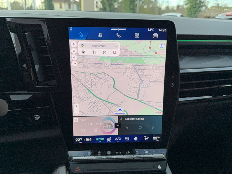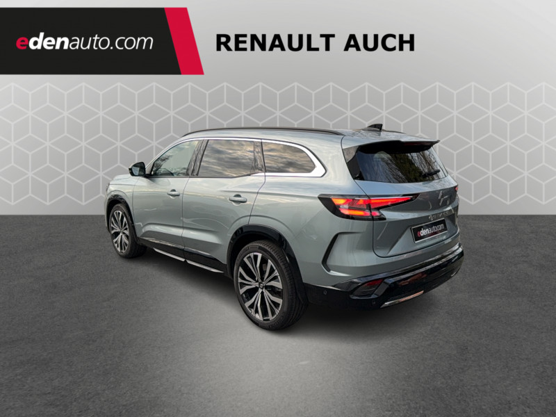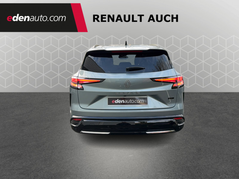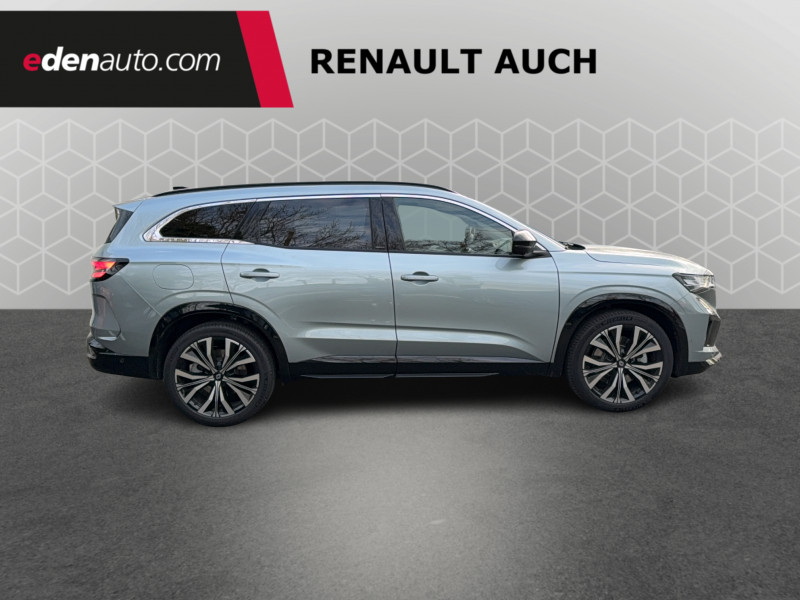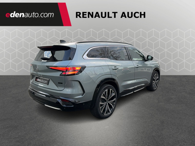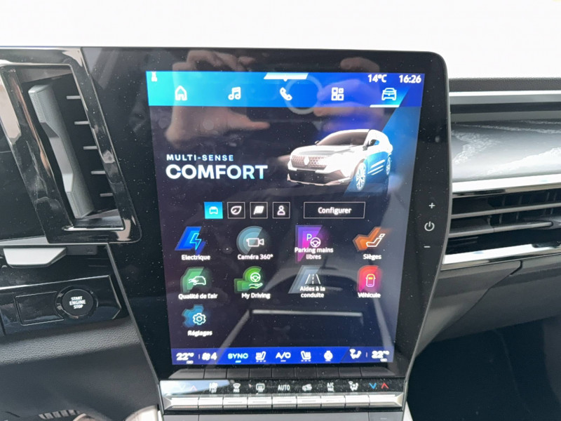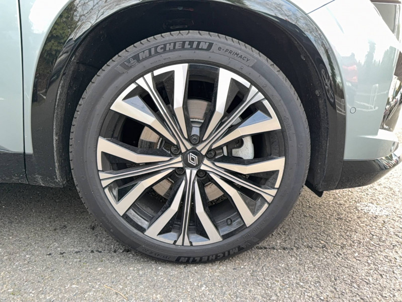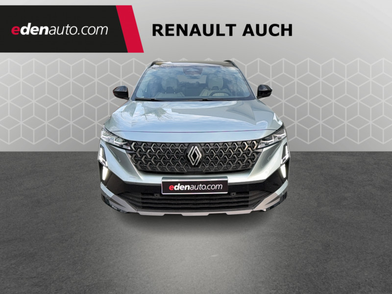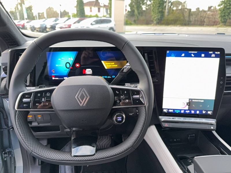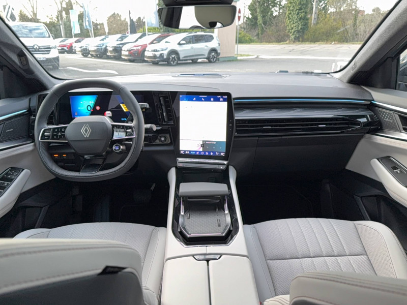 2 prises USB-C à l'AV et à l'AR / 4Control advanced / 5 places / Active driver assist régulateur de vitesse adaptatif intelligent + centrage dans la voie / Alerte de distance de sécurité / Alerte détection de fatigue / Alerte franchissement de ligne et assistant maintien dans la voie / Assistance de conduite avec une remorque / Avertisseur d'angle mort et prévention sortie de voie en cas de dépassement / Avertisseur de sortie de stationnement en marche AR avec freinage d'urgence automatique / Banquette AR coulissante 1/3-2/3 avec dossier 40/20/40 / Barres de toit longitudinales / Boîte de vitesse hybride multimode 6 rapports / Caméra 3D vision 360° / Carte Renault accès et démarrage mains libres / Ciel de toit gris anthracite / Clignotants AR dynamiques / Conduite prédictive (gestion de l'énergie de la batterie) / Console de toit avec porte-lunettes / Contrôle de la traction (TCS) / Détection intelligente des limitations de vitesse et prévention survitesse / Eclairage d'accompagnement au sol avec projection logo / Feux AR à LED avec effet 3D / Feux LED adaptive vision (avec fonction antibrouillard intégrée) / Frein de parking électrique avec fonction Auto-Hold / Hayon motorisé main libre / Intérieur Iconic gris / Jantes alliage 20" Effie diamantées noir / Lumière d'ambiance personnalisable / Maintenance connectée, incluse pendant 8 ans / Miroir de surveillance enfants / Mise à jour système (via firmware over the air FOTA), inclus pendant 5 ans / Multi-sense / My Safety switch (raccourci vers configuration personnalisée des aides à la conduite) / Notice d'utilisation digitale embarqué dans le système multimédia du véhicule / Pack connected driving, inclus pendant 5 ans / Pack contrôle à distance (via l'application My Renault), inclus pendant 5 ans / Parking mains-libres (inclus aides au parking AV, AR et latérale) / Prédisposition éthylotest / Rétroviseur intérieur électrochrome sans cadre / Rétroviseurs extérieurs électriques à mémoire, dégivrants, rabattables automatiquement / Sellerie mixte tissu gris / textile enduit grainé clair / Seuil de portes / Sièges AV électriques à mémoire avec réglage et massage lombaire conducteur / Sortie sécurisée des occupants / Système de reconnaissance du conducteur / Système ISOFIX sur siège passager & 2 places rang 2 / Système Multimédia openR link 12" : navigation, services Google, audio Arkamys Auditorium / Tableau de bord full numérique 12,3'' / Volant chauffant / Volume de coffre augmenté de 100 l (norme VDA)