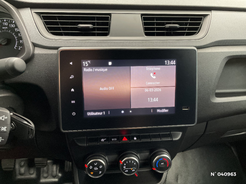 Sellerie tissu INTI Black structure / Radio DAB Connect R&GO / Critère technique 03 / Cloison complète vitrée / Siège passager standard / Roues tôlées 15" / Sans protection de plancher / Boucliers AV/AR, rétroviseurs et baguettes latérales noir grainé / Contrôle dynamique de trajectoire (ESP) avec aide au démarrage en côte / ABS + EBV (répartiteur électronique de freinage) / Peinture opaque / Ceintures de sécurité avant 3 points avec double prétensionneur et limiteur d'effort / Radio DAB Connect R&GO (Bluetooth, USB) / Siège sans Isofix / Lève-vitre conducteur impulsionnel / Enjoliveur CARTEN / Noir titane