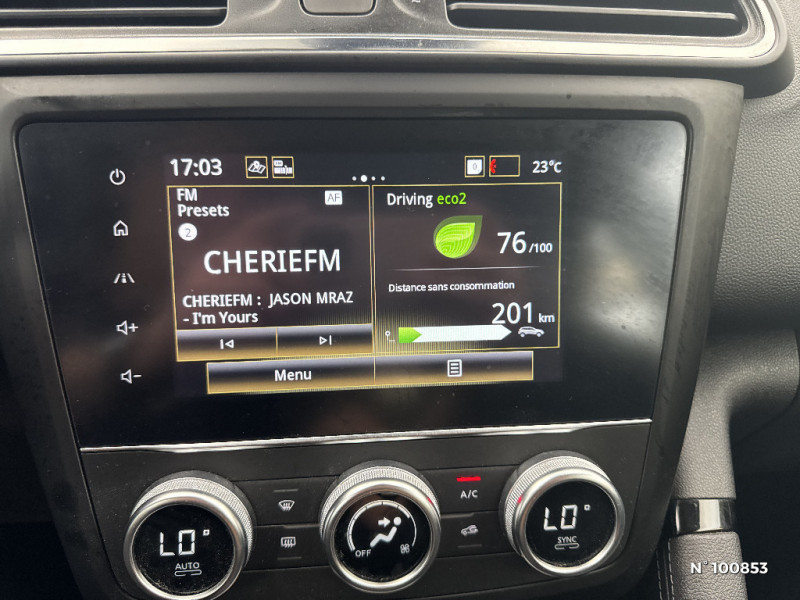 Essuie-vitre et allumage des phares automatiques / Pare-soleil conducteur et passager avec miroir éclairés / Indicateur de changement de vitesse / Badge Renault mains libres / Sellerie Tissu carbone foncé / Alerte d'oubli de ceinture de sécurité / ESC avec ASR / Kit de réparation / Projecteurs AV avec guides de lumière intégrés / Banquette AR rabattable 1/3 - 2/3 avec fonction "Easy Break" / Sièges AV réglables en hauteur + mise en tablette du siège passager / Harmonie Carbone foncé / Compatible Android Auto et Apple CarPlay / Eclairage du vide poche central / R-Link 2 avec radio digitale, navigation et écran tactile 7'' / Joncs chromés sur les protections inférieures de portes / Ciel de toit Gris Clair / Barres de toit longitudinales aspect chrome / Cartographie Europe / Rétroviseurs extérieurs ton carrosserie / Système Ecomode