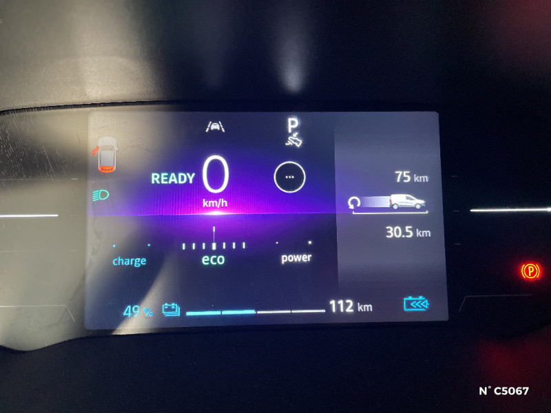 Tableau de bord digital 7" / Tapis habitacle en caoutchouc / Aide au maintien dans la voie / Alerte sonore de survitesse ( reconnaissance panneau limitation vitesse) / Alerte vigilance conducteur / Boîte de vitesses Automate à fonction continue / Câble de recharge(6m) mode 3 / Charge 11kW / Clé 3 boutons rétractable / Cloison complète fixe / Console rangement central avec accoudoir / Contrôle de traction (TCS) / Contrôle dynamique de trajectoire (ESP) avec aide au démarrage en côte / Déconnexion de l'airbag passager / EASY LINK écran 8" sans navigation / Eclairage LED dans la zone de chargement / Enjoliveur carten 16" / Feux de jour LED C-Shape intégrés aux projecteurs AV / Habillage latéral mi hauteur en isorel / Intérieur noir titan / Kit de gonflage / Lève-vitres AV électriques, impulsionnel à la descente et remontée côté conducteur / Panneau latéral gauche tolé / Peinture opaque / Poignées de portes Noir Grainé / Portes AR 180° tôlées / Prédisposition ethylotest / Prise 12V en zone de chargement / Rack de rangement au-dessus des places AV (Capucine) / Siège passager rabattable et repliable formant plancher plat