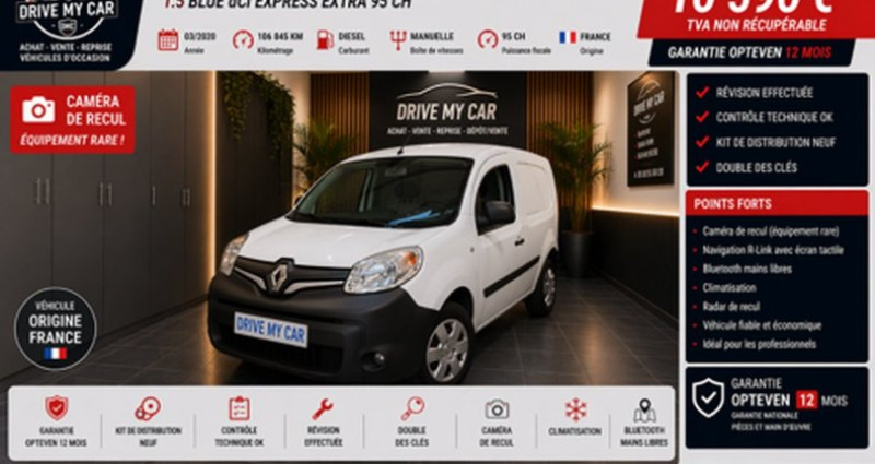 ? Renault Kangoo 1.5 Blue dCi 95 ch Express Extra - Série Spéciale (2020) ? Prix du véhicule : 10 590 € TTC (hors frais de carte grise) ? Disponible chez Drive My Car Découvrez ce Renault Kangoo Express Extra Série Spéciale, un utilitaire fiable et polyvalent, idéal pour les professionnels à la recherche d’un véhicule pratique, économique et fonctionnel. Équipé du moteur 1.5 Blue dCi 95 ch et d’une boîte manuelle, ce Kangoo offre une excellente efficacité énergétique, une grande capacité de chargement et un confort de conduite optimal pour vos déplacements quotidiens. Sa couleur blanche lui confère une allure sobre et professionnelle. Garantie 12 Mois pièces et mains d'œuvre Opteven Medium+ / Possibilité d'extension de garantie jusqu'à 48 mois supplémentaire ? Caractéristiques principales : • Année : 10/03/2020 • Kilométrage : 106 845 Kms • Motorisation : Diesel - 1.5 Blue dCi 95 ch • Transmission : Boîte manuelle • Finition : Express Extra - Série Spéciale • Couleur : Blanc • Nombre de portes : 3 portes ? Équipements et options : • Système multimédia avec écran tactile • Bluetooth / USB • Régulateur / limiteur de vitesse • Climatisation • Aide au stationnement arrière • Radar de recul • Porte latérale coulissante • Cloison de séparation • Ordinateur de bord • Volant multifonction ? Entretien et état : • Véhicule entièrement révisé et contrôlé ? Points forts : • Grand volume de chargement • Faible consommation • Idéal pour les professionnels et artisans • Robuste et économique à l’usage ? Pour plus d’informations ou un essai, contactez-nous dès aujourd’hui ! Véhicule visible sur rendez-vous uniquement Cylindrée : 1461 cm3 NB. Places : 2