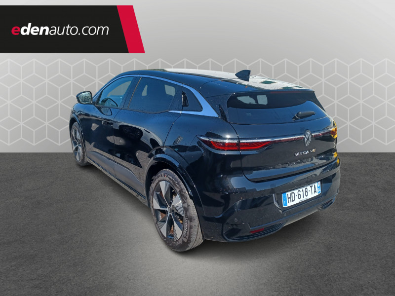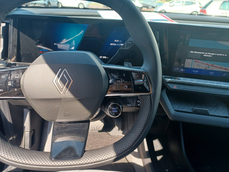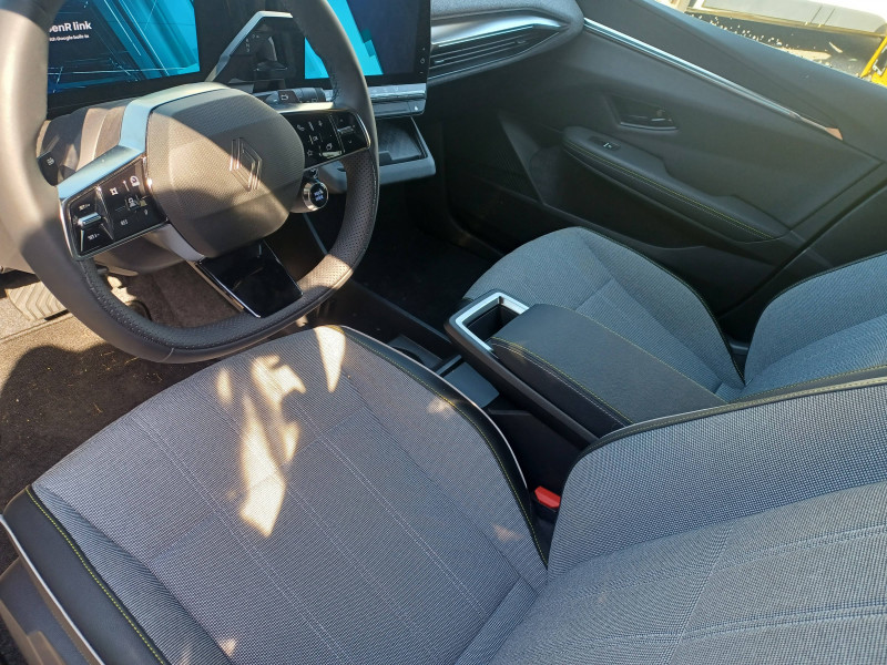 4 Ports USB (2 AV et 2 AR) / Adaptation intelligente de la vitesse / Airbags latéraux, milieu AV et rideaux / Alerte de distance de sécurité / Alerte détection de fatigue / Alerte d'oubli de ceinture de sécurité / Alerte et prévention sortie de voie (dont urgence) / Antenne Requin / Boîte de vitesse automatisée à variation continue / Bouclier AV sport avec lame F1 / Câble pour borne de recharge (mode 3 type 2 triphasé, 5m) / Carte Renault accès et démarrage mains libres / Changement d'intensité du freinage régénératif par palettes / Chargeur AC 11 kW triphasé (compatible V2G/V2L) / Commutation automatique des feux de route/croisement / Console de rangement haute avec accoudoir central coulissant / Détection de la pression des pneumatiques / Direction assistée avec assistance variable / Freinage automatique d'urgence en ville pour deux roues et piétons / Gestion automatique des feux diurnes et des essuie-glaces / Jantes alliage diamantées en noir brillant 18" oston / Kit de réparation pour pneumatiques / Maintenance connectée, incluse pendant 8 ans / Mise à jour système (via firmware over the air FOTA), incluspendant 5 ans / Multi-sense / Notice d'utilisation digitale embarqué dans le système multimédia du véhicule / Pack connected driving, inclus pendant 5 ans / Pack contrôle à distance (via l'application My Renault), inclus pendant 5 ans / Planche de bord en tissu recyclé gris chiné / Poignées de portes affleurantes / Pompe à chaleur / Projecteurs full LED directionnels avec fonction antibrouillard / Réplication smartphone / Rétroviseur jour/nuit automatique / Sellerie tissu recyclé gris chiné/textile refined noir titane et surpiqûres jaunes / Sièges avec système ISOFIX / Signature lumineuse AV / Système d'optimisation de la température batterie (charge rapide DC) / Système multimédia openR link 9": services Google, préconditionnement batterie pour charge DC, audio Arkamys Auditorium / Tableau de bord full numérique / Volant en textile refined biosourcé