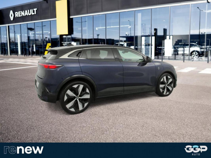 Réplication smartphone / Commutation automatique des feux de route/croisement / Rétroviseur jour/nuit automatique / Changement de mode de conduite via palettes au volant / Multi-sense / Peinture mono-ton / Bouclier AV Sport avec lame F1 ton caisse / Tableau de bord full numérique / Carte Renault accès et démarrage mains libres / Console de rangement haute avec accoudoir / Volant chauffant / Ambiance interieure E3 / Antenne Requin / Bouclier AV sport avec lame F1 / Poignées de portes affleurantes / Projecteurs full LED directionnels avec fonction antibrouillard / Sellerie mixte simili cuir / textile recyclé ELZA REC gris chiné / Signature lumineuse AV / Tissus velours / Vitres et lunette AR surteintées / Système Multimédia openR link 12 : navigation / services Google / audio Arkamys Auditorium 6 HP / milieu AV et rideaux / Alerte de distance de sécurité / Alerte d'oubli de ceinture de sécurité / Bandeau full LED AR avec effet 3D moiré / Détection de fatigue / Kit de gonflage / Sièges avec système ISOFIX / Chargeur courant continu 130kW et courant alternatif 22kW / Pompe à chaleur / Jantes alliage diamantées 20 Soren / Câble pour borne de recharge / rabattables électriquement avec mémoire / Alerte et prévention sortie de voie / Système d?optimisation de la température batterie / Gestion automatique des feux diurnes et des essuie-glaces / Changement d'intensité du freinage régénératif par palettes / Sellerie tissu recyclé gris chiné/textile enduit grainé recyclé noir titane/surpiqures jaunes