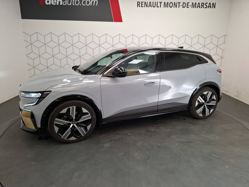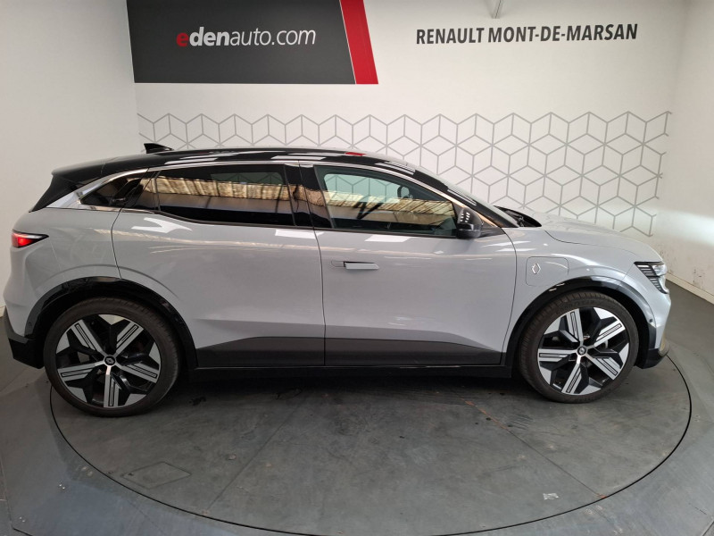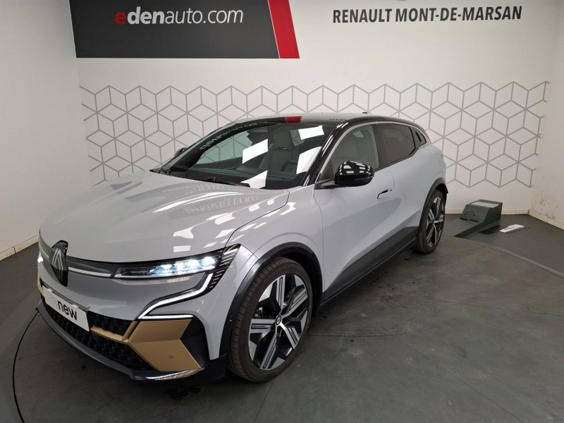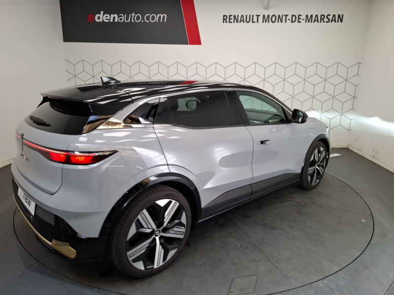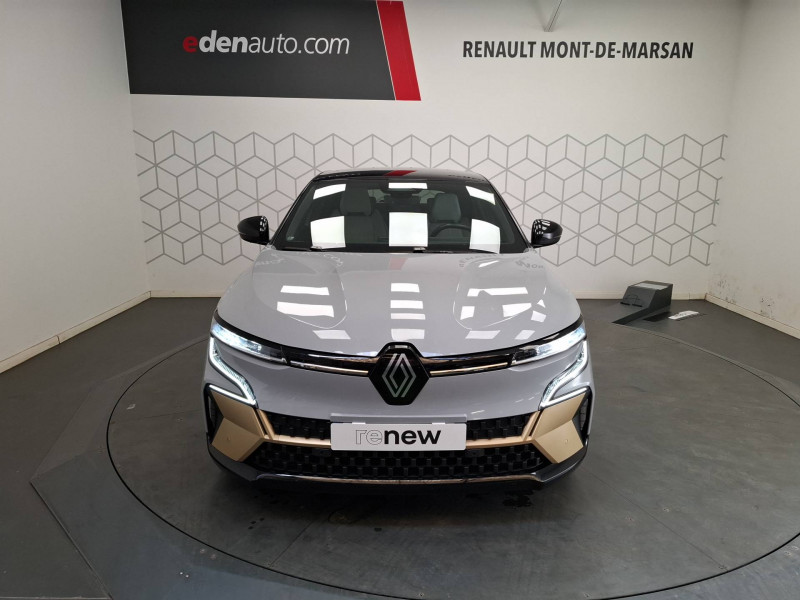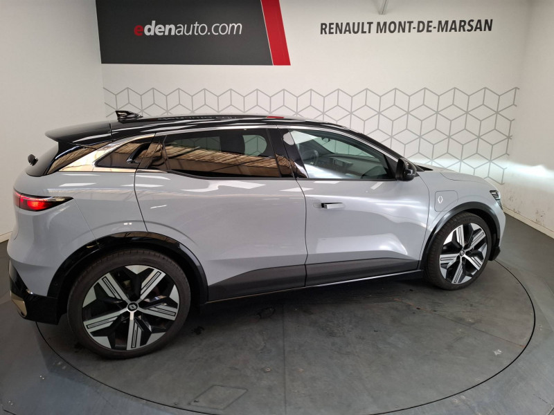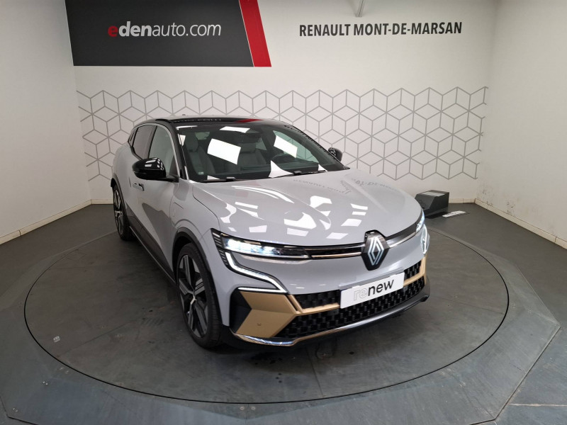4 Ports USB (2 AV et 2 AR) / Airbags latéraux, milieu AV et rideaux / Alerte de distance de sécurité / Alerte d'oubli de ceinture de sécurité / Alerte et assistant maintien de voie / Ambiance interieure E4 / Antenne Requin / Bandeau full LED AR avec effet 3D "moiré" / Bouclier AV sport avec lame F1 / Câble pour borne de recharge (mode 3 type 2 monophasé, 5m) / Carte Renault accès et démarrage mains libres / Changement de mode de conduite via palettes au volant / Chargeur courant continu 130kW et courant alternatif 7kW (super) / Commutation automatique des feux de route/croisement / Commutation automatique des feux et détecteur de pluie / Console de rangement haute avec accoudoir / Détection de fatigue / Freinage actif d'urgence urbain (piéton + cycliste + intersection) / Jantes alliage diamantées 20" Enos / Kit de gonflage / Lame F1 Gold / Multi-sense / Notice d'utilisation digitale embarqué dans le système multimédia du véhicule / Poignées de portes affleurantes / Projecteurs full LED directionnels avec fonction antibrouillard / Purificateur d'air / Radars AV, AR et latéraux / Réplication smartphone / Rétroviseur jour/nuit automatique / Sellerie Cuir Riviera Noir Titane / Siège AV réglables électriquement et massant, 6 positions + lombaire / Sièges avec système ISOFIX / Signature lumineuse AV / Système Multimédia openR link 12" : navigation, services Google, audio premium Harman Kardon 9HP / Tableau de bord full numérique / Volant chauffant