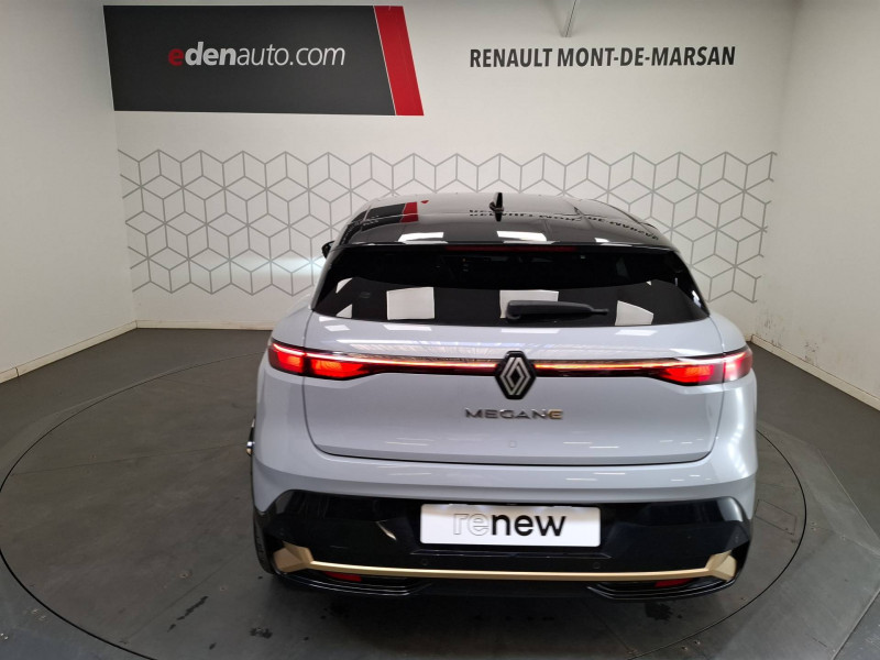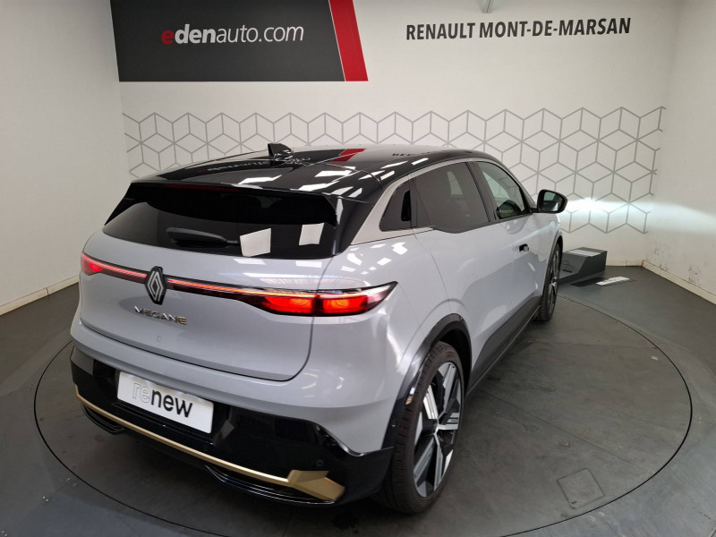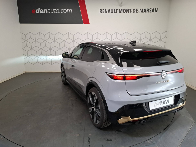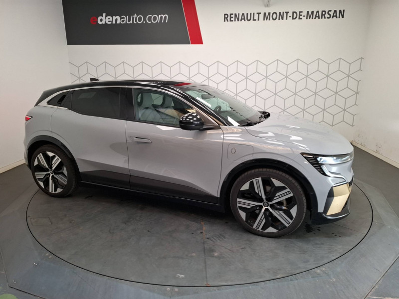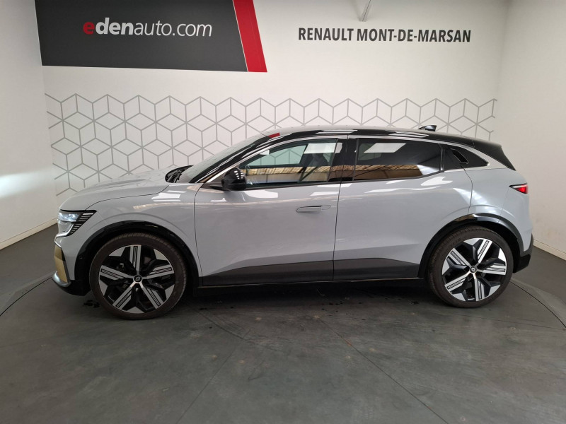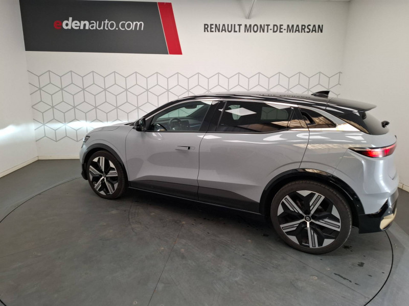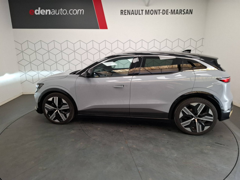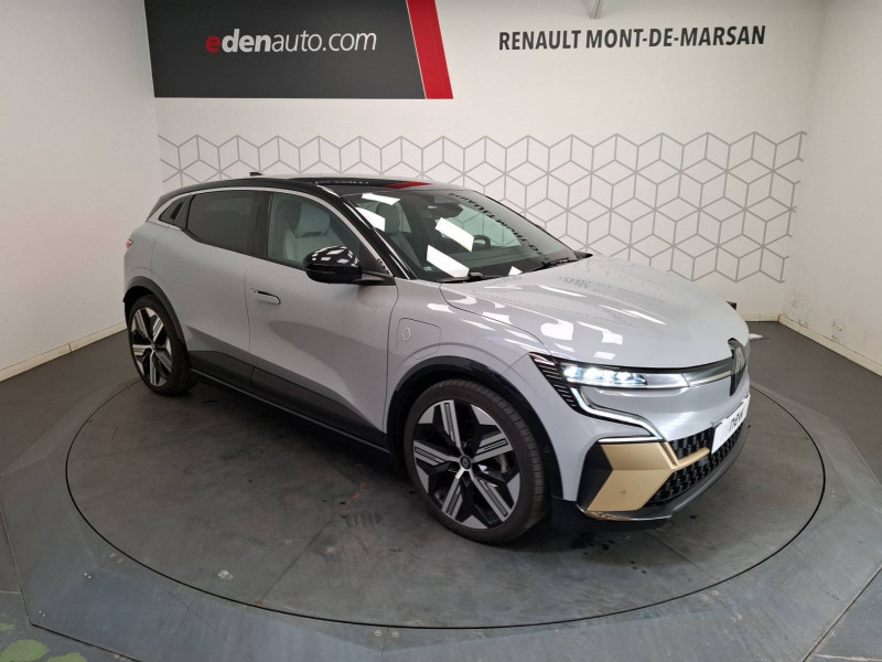 4 Ports USB (2 AV et 2 AR) / Airbags latéraux, milieu AV et rideaux / Alerte de distance de sécurité / Alerte d'oubli de ceinture de sécurité / Alerte et assistant maintien de voie / Ambiance interieure E4 / Antenne Requin / Bandeau full LED AR avec effet 3D "moiré" / Bouclier AV sport avec lame F1 / Câble pour borne de recharge (mode 3 type 2 monophasé, 5m) / Carte Renault accès et démarrage mains libres / Changement de mode de conduite via palettes au volant / Chargeur courant continu 130kW et courant alternatif 7kW (super) / Commutation automatique des feux de route/croisement / Commutation automatique des feux et détecteur de pluie / Console de rangement haute avec accoudoir / Détection de fatigue / Freinage actif d'urgence urbain (piéton + cycliste + intersection) / Jantes alliage diamantées 20" Enos / Kit de gonflage / Lame F1 Gold / Multi-sense / Notice d'utilisation digitale embarqué dans le système multimédia du véhicule / Poignées de portes affleurantes / Projecteurs full LED directionnels avec fonction antibrouillard / Purificateur d'air / Radars AV, AR et latéraux / Réplication smartphone / Rétroviseur jour/nuit automatique / Sellerie Cuir Riviera Noir Titane / Siège AV réglables électriquement et massant, 6 positions + lombaire / Sièges avec système ISOFIX / Signature lumineuse AV / Système Multimédia openR link 12" : navigation, services Google, audio premium Harman Kardon 9HP / Tableau de bord full numérique / Volant chauffant