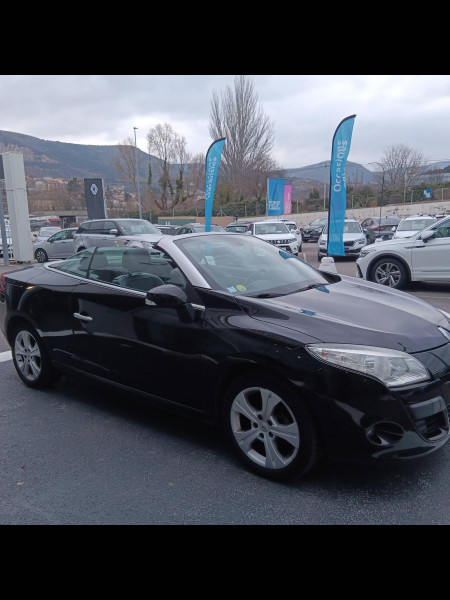 3ème feu stop à LED / Allumage automatique des feux de croisement et de l'essuie vitre / Arceaux de sécurité pyrotechniques automatiques / Climatisation régulée bi-zone 3 modes d'automatismes / Essuie-vitre AV à détection de pluie et à cadencement automatique / Toit ouvrant verre panoramique rétractable dans le coffre (fonctionnement entièrement automatique) / Volant et pommeau cuir / Airbags anti-sous marinage dans assises des sièges AV / Airbags frontaux conducteur et passager adapatifs (airbag passager déconnectable) / Airbags latéraux bi-chambre tête / bassin / thorax / Appuis-tête AV nouvelle génération anti "coup du lapin" / Bornier audio numérique "Plug & Music" / Boucliers AV et AR ton carrosserie / Carte de démarrage Renault "Mains libres" / Ceintures AR à 3 points avec limiteurs d'effort / Console centrale avec accoudoir / Coques de rétroviseurs noir grand brillant / Direction à assistance variable électrique / Eclairage d'accompagnement extérieur / Emplacement porte-canettes sur console centrale / Filtre d' habitacle / Grand toit en verre escamotable, encadré de montants noir grand brillant / Indicateur de température extérieure / Kit de réparation et bac de rangement dans le coffre / Kit fumeur / Lève-vitres électriques AV/AR à impulsion avec dispositif antipincement + fonctionnalité "Grand Air" d'ouverture simultanée de toutes les vitres / Montants de pare-brise et ceinture d'habitacle en finition chrome satiné / Pare-soleil conducteur et passager avec miroir de courtoisie / Planche de bord carbone très foncé intégrant une baguette peinte chrome satinéà motif "Cube 3D" / Poignées de portes chromées / Projecteurs double optiques halogènes / RadioSat 3D, Sound by Arkamys Bluetooth, CD MP3, avec bornier audio intégré en planche de bord / Recyclage de l'air / Rétroviseurs extérieurs électriques et dégivrants, asphérique côté conducteur / Système de fixation ISOFIX 2 points pour siège enfant aux places passager AV et AR / Système Easy Entry d'accès aux places AR / Trappe à carburant à ouverture intégrée / Témoin lumineux et sonore d'oubli de ceintures conducteur et passagers AV / Vitre anti-turbulances fixe, située entre les appuis-têtes AR / Vitres AV avec système "Short Drop"