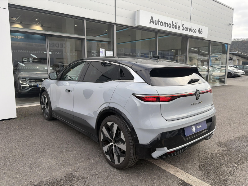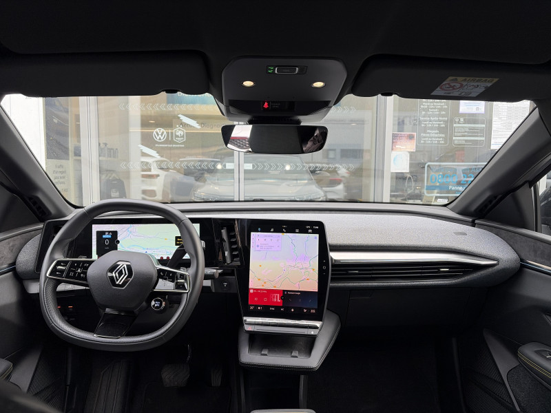 Bandeau full LED AR avec effet 3D "moiré" / Commutation automatique des feux de route/croisement / Gestion automatique des feux diurnes et des essuie-glaces / Jantes alliage diamantées 20" Soren / Projecteurs full LED directionnels avec fonction antibrouillard / Rétroviseur jour/nuit automatique / Système Multimédia openR link 12" : navigation, services Google, audio Arkamys Auditorium 6 HP / 4 Ports USB (2 AV et 2 AR) / Airbags latéraux, milieu AV et rideaux / Alerte d'oubli de ceinture de sécurité / Alerte de distance de sécurité / Alerte et prévention sortie de voie (dont urgence) / Ambiance interieure E3 / Antenne Requin / Bouclier AV sport avec lame F1 / Bouclier AV Sport avec lame F1 ton caisse / Carte Renault accès et démarrage mains libres / Changement d'intensité du freinage régénératif par palettes / Chargeur courant continu 130kW et courant alternatif 22kW (optimal) / Console de rangement haute avec accoudoir / Câble pour borne de recharge (mode 3 type 2 triphasé, 5m) / Détection de fatigue / Freinage actif d'urgence urbain (piéton + cycliste + intersection) / Kit de gonflage / Multi-sense / Poignées de portes affleurantes / Pompe à chaleur / Réplication smartphone / Signature lumineuse AV / Sièges avec système ISOFIX / Système d'optimisation de la température batterie (charge rapide DC) / Tableau de bord full numérique / Volant chauffant