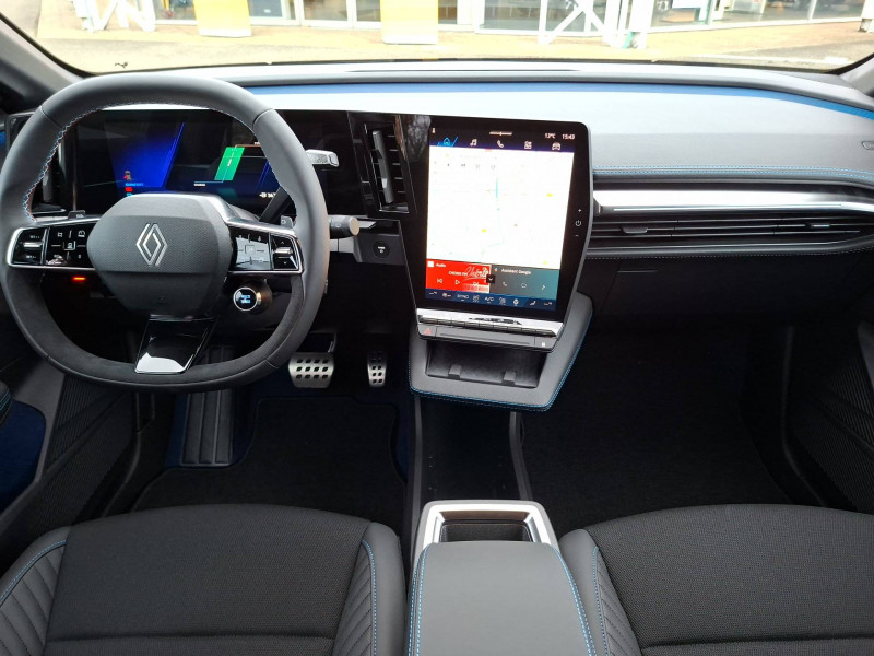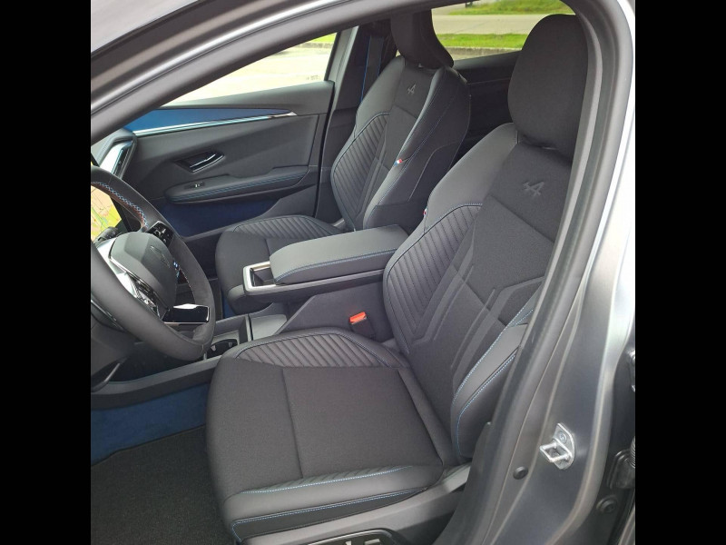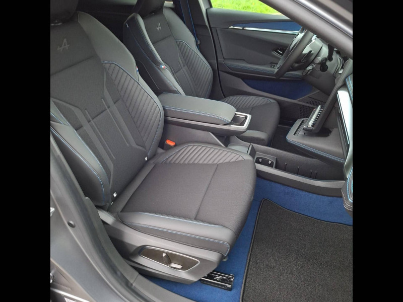 4 Ports USB (2 AV et 2 AR) / Adaptation intelligente de la vitesse / Airbags latéraux, milieu AV et rideaux / Alerte de distance de sécurité / Alerte détection de fatigue / Alerte d'oubli de ceinture de sécurité / Alerte et prévention sortie de voie (dont urgence) / Antenne Requin / Avertisseur d'angle mort et prévention sortie de voie en cas de dépassement / Bandeau full LED AR avec effet 3D "moiré" / Boîte de vitesse automatisée à variation continue / Bouclier AV sport avec lame F1 / Câble pour borne de recharge (mode 3 type 2 triphasé, 5m) / Caméra de recul digitale haute définition / Carte Renault accès et démarrage mains libres / Changement d'intensité du freinage régénératif par palettes / Chargeur AC 11 kW triphasé (compatible V2G/V2L) / Commutation automatique des feux de route/croisement / Console de rangement haute avec accoudoir central coulissant / Détection de la pression des pneumatiques / Direction assistée avec assistance variable / Finition extérieure esprit Alpine / Freinage automatique d'urgence en ville pour deux roues et piétons / Gestion automatique des feux diurnes et des essuie-glaces / Jantes alliage diamantées en noir verni fumé 20" speedway / Kit de réparation pour pneumatiques / Lame f1 gris schiste satin / Maintenance connectée, incluse pendant 8 ans / Mise à jour système (via firmware over the air FOTA), inclus pendant 5 ans / Moquette couleur bleu esprit Alpine / Multi-sense / Notice d'utilisation digitale embarqué dans le système multimédia du véhicule / Pack connected driving, inclus pendant 5 ans / Pack contrôle à distance (via l'application My Renault), inclus pendant 5 ans / Planche de bord en tissu recyclé gris chiné / Poignées de portes affleurantes / Pompe à chaleur / Projecteurs full LED directionnels avec fonction antibrouillard / Radars AV, AR et latéraux / Réplication smartphone / Rétroviseur jour/nuit automatique / Sellerie maille embossée recyclée / textile refined matelassé noir titane et surpiqûres bleu Alpine / Sièges avec système ISOFIX / Sièges AV électriques avec réglage lombaire + siège conducteur massant / Sièges typés sport, volant Alpine, planche de bord spécifique, pièces décor bleues / Signature lumineuse AV / Système d'optimisation de la température batterie (charge rapide DC) / Système Multimédia openR link 12" : Google intégré, préconditionnement batterie pour charge DC, audio Arkamys Auditorium / Tableau de bord full numérique / Volant chauffant / Volant en textile refined biosourcé