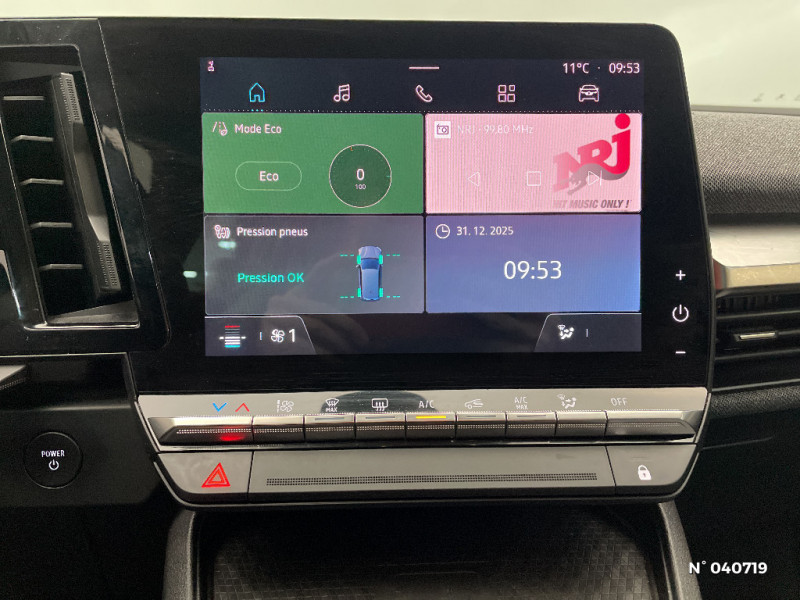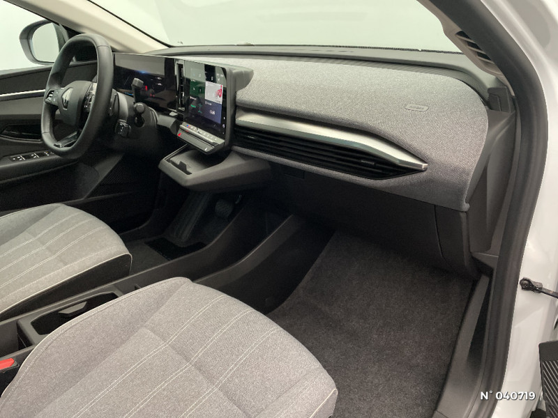 Volant non chauffant / Ambiance interieure Noir / Bouclier AV sport avec lame F1 / Eclairage d'accueil portes AV / Poignées de portes affleurantes / Signature lumineuse AV / Tapis couleur standard / Tissus velours / Système Multimédia openR link 9" avec audio Arkamys Classic 4 HP / Airbags latéraux, milieu AV et rideaux / Alerte de distance de sécurité / Alerte et assistant maintien de voie / Alerte d'oubli de ceinture de sécurité / Détection de fatigue / Freinage actif d'urgence urbain (piéton + cycliste + intersection) / Kit de gonflage / Sièges avec système ISOFIX / Câble de recharge pour Wallbox (mode 3 type 2, 5m) / Chargeur courant continu 130kW et courant alternatif 7kW (super) / Classe energetique A / Notice d'utilisation digitale embarqué dans le système multimédia du véhicule / Câble pour borne de recharge (mode 3 type 2 monophasé, 5m) / Réplication smartphone / Changement de mode de conduite via palettes au volant / Commutation automatique des feux et essuie-glaces manuels / Peinture mono-ton / Bouclier AV Sport avec lame F1 ton caisse / Rétroviseur manuel / Tableau de bord full numérique / Carte Renault accès et démarrage mains libres