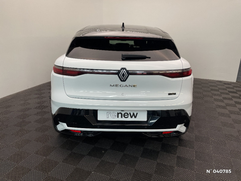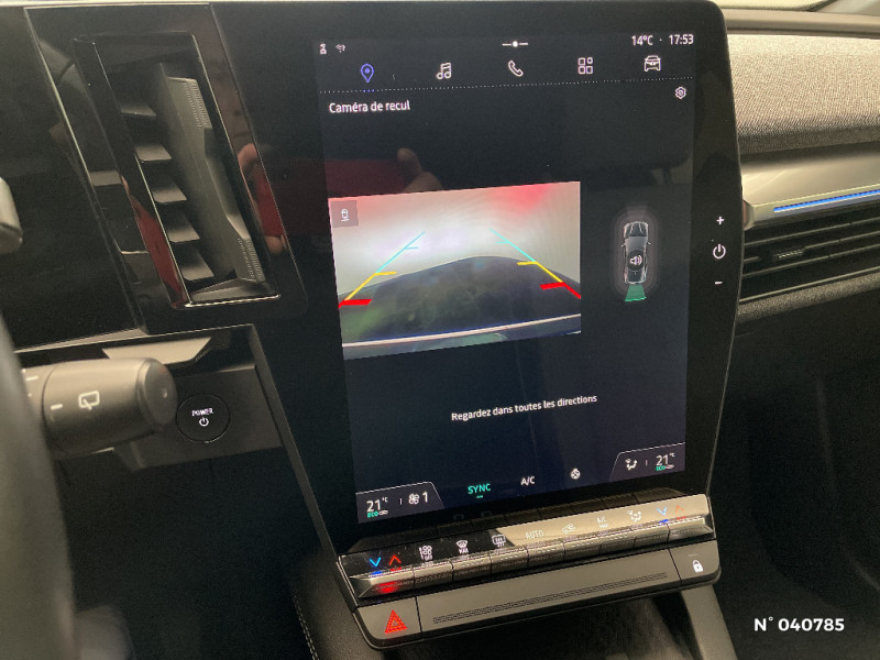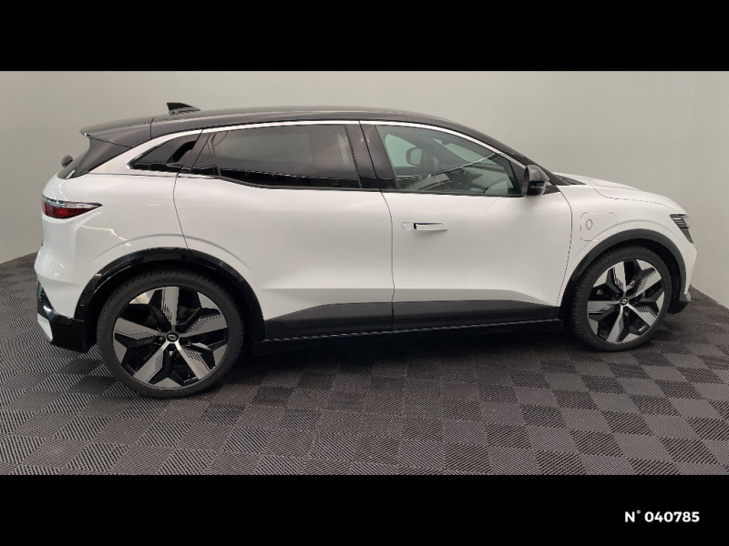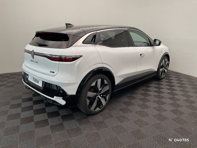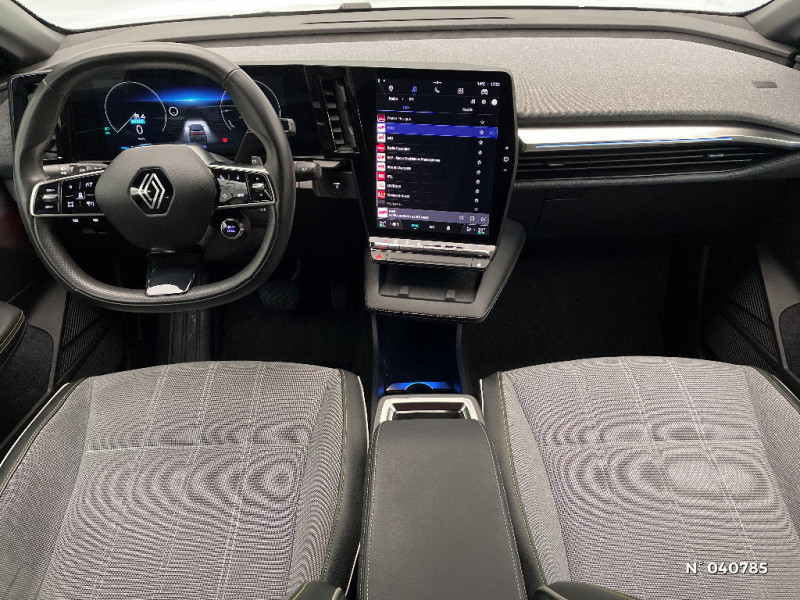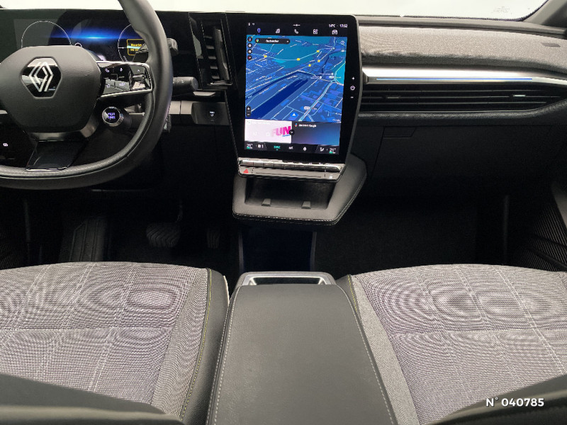 Réplication smartphone / Commutation automatique des feux de route/croisement / Rétroviseur jour/nuit automatique / Multi-sense / Bouclier AV Sport avec lame F1 ton caisse / Tableau de bord full numérique / 4 Ports USB (2 AV et 2 AR) / Carte Renault accès et démarrage mains libres / Chargeur courant alternatif 7kW & courant continu 130 kW (pic max) / Système d'optimisation de la température batterie (charge rapide DC) / Gestion automatique des feux diurnes et des essuie-glaces / Volant enduit grainé / Changement d'intensité du freinage régénératif par palettes / Chargeur courant alternatif 7kW & courant continu 85 (standard) / 130 kW (super charge) (pic max) / Sellerie tissu recyclé gris chiné/textile enduit grainé recyclé noir titane/surpiqures jaunes / Console de rangement haute avec accoudoir central coulissant / Alerte détection de fatigue / Freinage automatique d'urgence en ville pour deux roues et piétons / Adaptation intelligente de la vitesse / Ambiance interieure E3 / Antenne Requin / Bouclier AV sport avec lame F1 / Poignées de portes affleurantes / Projecteurs full LED directionnels avec fonction antibrouillard / Signature lumineuse AV / Tissus velours / Système Multimédia openR link 12" : navigation, services Google, audio Arkamys Auditorium 6 HP / Airbags latéraux, milieu AV et rideaux / Alerte de distance de sécurité / Alerte d'oubli de ceinture de sécurité / Bandeau full LED AR avec effet 3D "moiré" / Détection de fatigue / Freinage actif d'urgence urbain (piéton + cycliste + intersection) / Kit de gonflage / Sièges avec système ISOFIX / Pompe à chaleur / Jantes alliage diamantées 20" Soren / Câble pour borne de recharge (mode 3 type 2 monophasé, 5m) / Alerte et prévention sortie de voie (dont urgence) / Console de rangement haute avec accoudoir