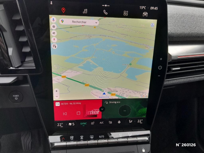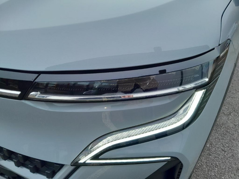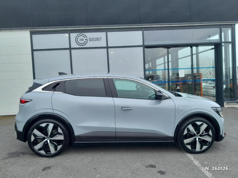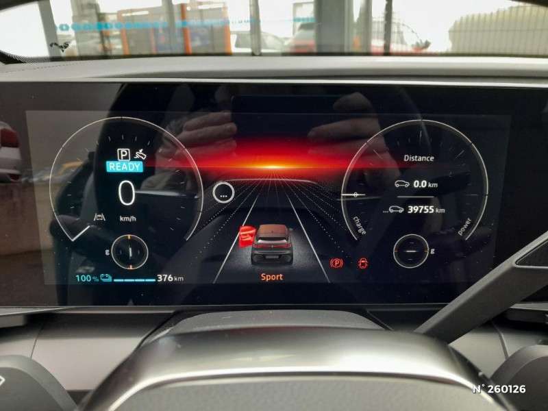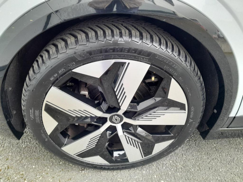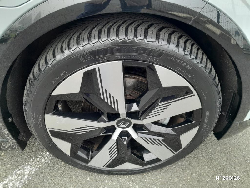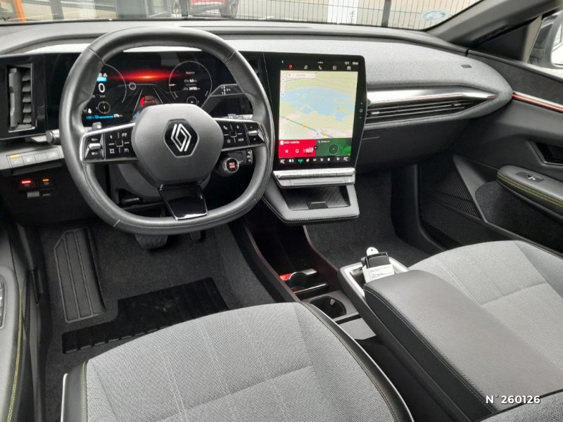 Réplication smartphone / Commutation automatique des feux de route/croisement / Rétroviseur jour/nuit automatique / Changement de mode de conduite via palettes au volant / Console de rangement haute avec accoudoir / Purificateur d'air / Siège AV réglables 6 positions conducteur + lombaire / Volant chauffant / Ambiance interieure E3 / Antenne Requin / Sellerie mixte simili cuir / textile recyclé ELZA REC gris chiné / Signature lumineuse AV / Système Multimédia openR link 12" : navigation, services Google, audio Arkamys Auditorium 6 HP / Airbags latéraux, milieu AV et rideaux / Alerte de distance de sécurité / Alerte et assistant maintien de voie / Alerte d'oubli de ceinture de sécurité / Bandeau full LED AR avec effet 3D "moiré" / Détection de fatigue / Freinage actif d'urgence urbain (piéton + cycliste + intersection) / Kit de gonflage / Sièges avec système ISOFIX / Chargeur courant continu 130kW et courant alternatif 7kW (super) / Notice d?utilisation digitale embarqué dans le système multimédia du véhicule / Jantes alliage diamantées 20" Soren / Câble pour borne de recharge (mode 3 type 2 monophasé, 5m) / Classe energetique 0 / Alerte et prévention sortie de voie (dont urgence) / Commutation automatique des feux et détecteur de pluie / Multi-sense / Peinture mono-ton / Bouclier AV Sport avec lame F1 ton caisse / Tableau de bord full numérique / 4 Ports USB (2 AV et 2 AR) / Peinture opaque / Bouclier AV sport avec lame F1 / Poignées de portes affleurantes / Projecteurs full LED directionnels avec fonction antibrouillard / Carte Renault accès et démarrage mains libres