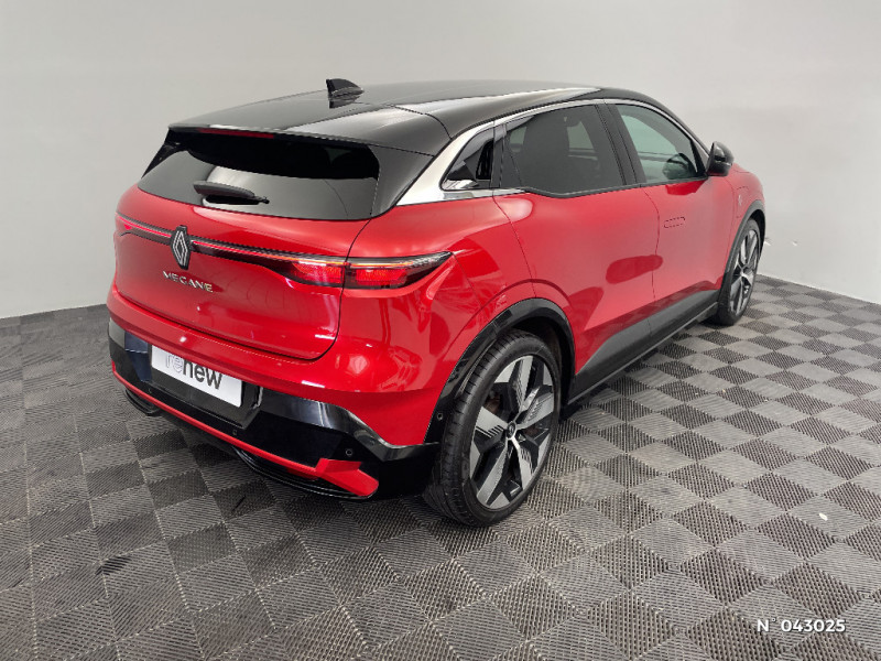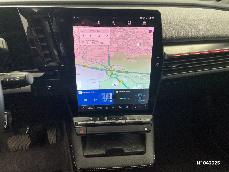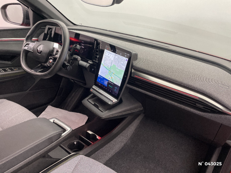 Console de rangement haute avec accoudoir / Purificateur d'air / Siège AV réglables 6 positions conducteur + lombaire / Volant chauffant / Ambiance interieure E3 / Antenne Requin / Bouclier AV sport avec lame F1 / Poignées de portes affleurantes / Projecteurs full LED directionnels avec fonction antibrouillard / Sellerie mixte simili cuir / textile recyclé ELZA REC gris chiné / Signature lumineuse AV / Système Multimédia openR link 12" : navigation, services Google, audio Arkamys Auditorium 6 HP / Airbags latéraux, milieu AV et rideaux / Alerte de distance de sécurité / Alerte et assistant maintien de voie / Alerte d'oubli de ceinture de sécurité / Bandeau full LED AR avec effet 3D "moiré" / Détection de fatigue / Freinage actif d'urgence urbain (piéton + cycliste + intersection) / Kit de gonflage / Sièges avec système ISOFIX / Chargeur courant continu 130kW et courant alternatif 7kW (super) / Pompe à chaleur / Notice d?utilisation digitale embarqué dans le système multimédia du véhicule / Jantes alliage diamantées 20" Soren / Câble pour borne de recharge (mode 3 type 2 monophasé, 5m) / Classe energetique 0 / Alerte et prévention sortie de voie (dont urgence) / Système d'optimisation de la température batterie (charge rapide DC) / Gestion automatique des feux diurnes et des essuie-glaces / Changement de mode de conduite via palettes au volant / Commutation automatique des feux et détecteur de pluie / Multi-sense / Peinture mono-ton / Bouclier AV Sport avec lame F1 ton caisse / Tableau de bord full numérique / Peinture opaque / Réplication smartphone / Commutation automatique des feux de route/croisement / Rétroviseur jour/nuit automatique / 4 Ports USB (2 AV et 2 AR) / Carte Renault accès et démarrage mains libres