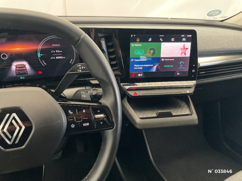 Chargeur courant continu 130kW et courant alternatif 7kW (super) / Classe energetique A / Notice d?utilisation digitale embarqué dans le système multimédia du véhicule / Détection de fatigue / Freinage actif d'urgence urbain (piéton + cycliste + intersection) / Kit de gonflage / Sièges avec système ISOFIX / Câble de recharge pour Wallbox (mode 3 type 2, 5m) / Réplication smartphone / Changement de mode de conduite via palettes au volant / Commutation automatique des feux et essuie-glaces manuels / Peinture mono-ton / Bouclier AV Sport avec lame F1 ton caisse / Câble pour borne de recharge (mode 3 type 2 monophasé, 5m) / Signature lumineuse AV / Tapis couleur standard / Système Multimédia openR link 9" avec audio Arkamys Classic 4 HP / Airbags latéraux, milieu AV et rideaux / Alerte de distance de sécurité / Alerte et assistant maintien de voie / Alerte d'oubli de ceinture de sécurité / Volant non chauffant / Ambiance interieure Noir / Bouclier AV sport avec lame F1 / Eclairage d'accueil portes AV / Poignées de portes affleurantes / Rétroviseur manuel / Tableau de bord full numérique / Carte Renault accès et démarrage mains libres