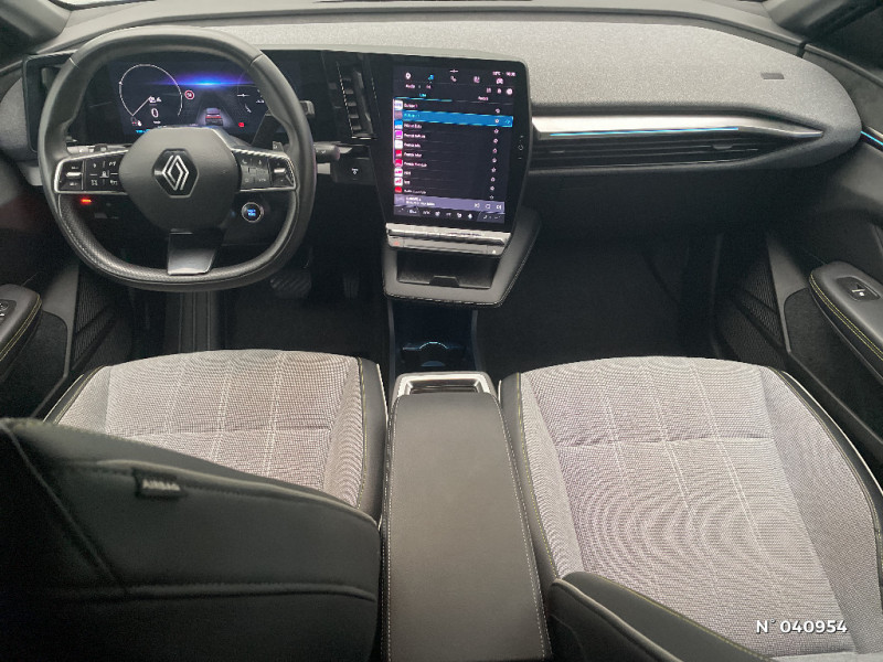 Multi-sense / Notice d'utilisation digitale embarqué dans le système multimédia du véhicule / Peinture Blanc Glacial / Peinture mono-ton / Poignées de portes affleurantes / Projecteurs full LED directionnels avec fonction antibrouillard / Purificateur d'air / Réplication smartphone / Rétroviseur jour/nuit automatique / Sellerie mixte textile enduit grainé / textile recyclé ELZA REC gris chiné / Siège AV réglables 6 positions conducteur + lombaire / Sièges avec système ISOFIX / Signature lumineuse AV / Système Multimédia openR link 12" : navigation, services Google, audio Arkamys Auditorium 6 HP / Tableau de bord full numérique / Tapis couleur standard / Tissus velours / Volant chauffant / 4 Ports USB (2 AV et 2 AR) / Airbags latéraux, milieu AV et rideaux / Alerte de distance de sécurité / Alerte d'oubli de ceinture de sécurité / Alerte et assistant maintien de voie / Ambiance interieure E3 / Antenne Requin / Bandeau full LED AR avec effet 3D "moiré" / Bouclier AV sport avec lame F1 / Bouclier AV Sport avec lame F1 ton caisse / Câble de recharge pour Wallbox (mode 3 type 2, 5m) / Câble pour borne de recharge (mode 3 type 2 triphasé, 5m) / Carte Renault accès et démarrage mains libres / Changement de mode de conduite via palettes au volant / Chargeur courant continu 130kW et courant alternatif 22kW (optimal) / Classe energetique A / Commutation automatique des feux de route/croisement / Commutation automatique des feux et détecteur de pluie / Console de rangement haute avec accoudoir / Détection de fatigue / Eclairage d'accueil portes AV / Freinage actif d'urgence urbain (piéton + cycliste + intersection) / Jantes alliage diamantées 20" Soren / Jantes alliage diamantées 20" Soren / Kit de gonflage