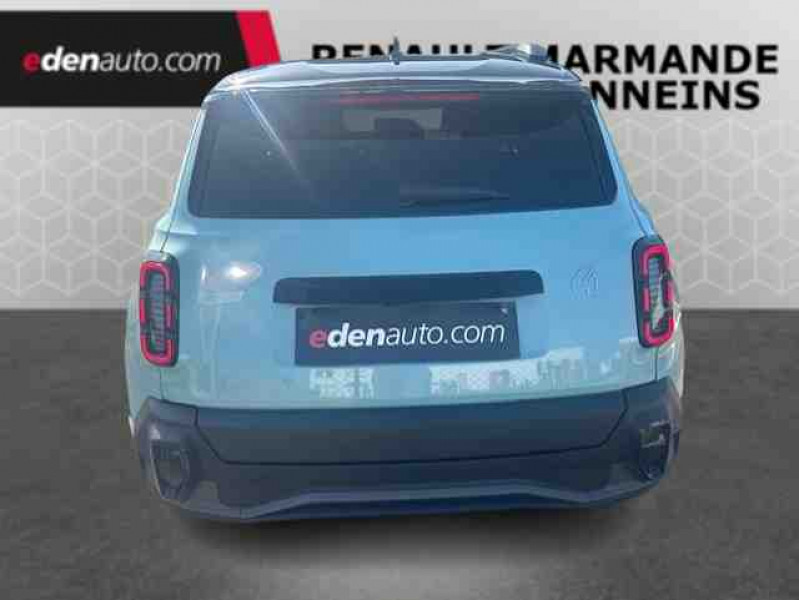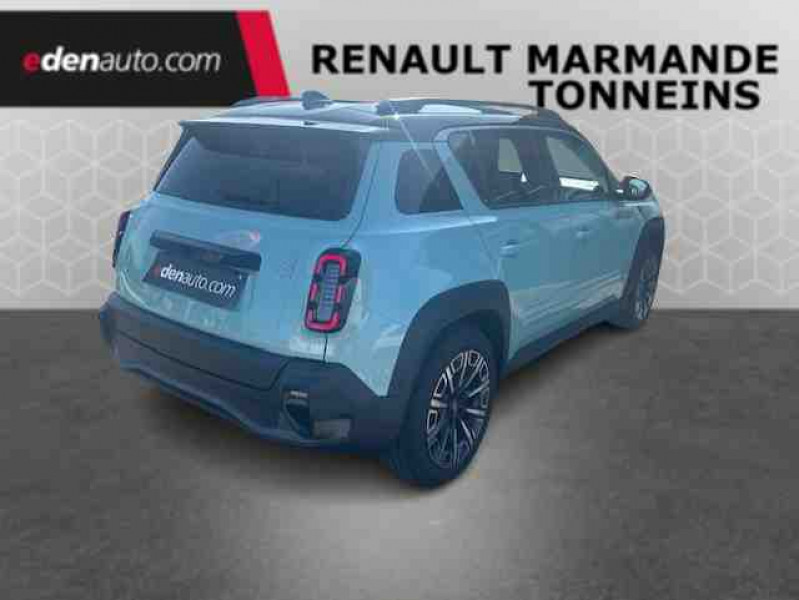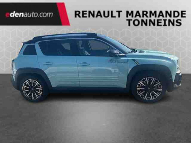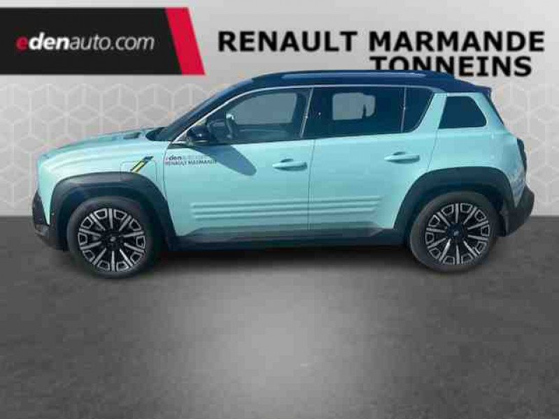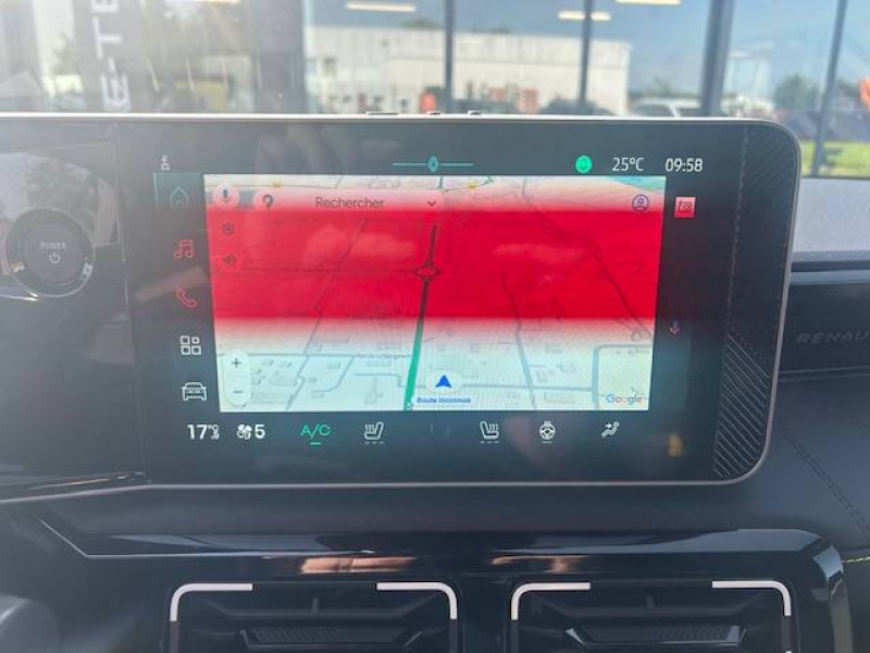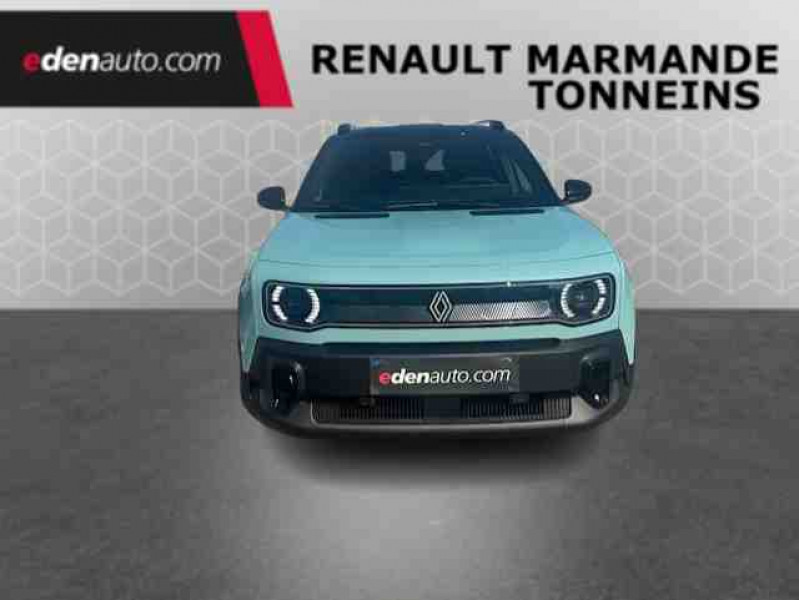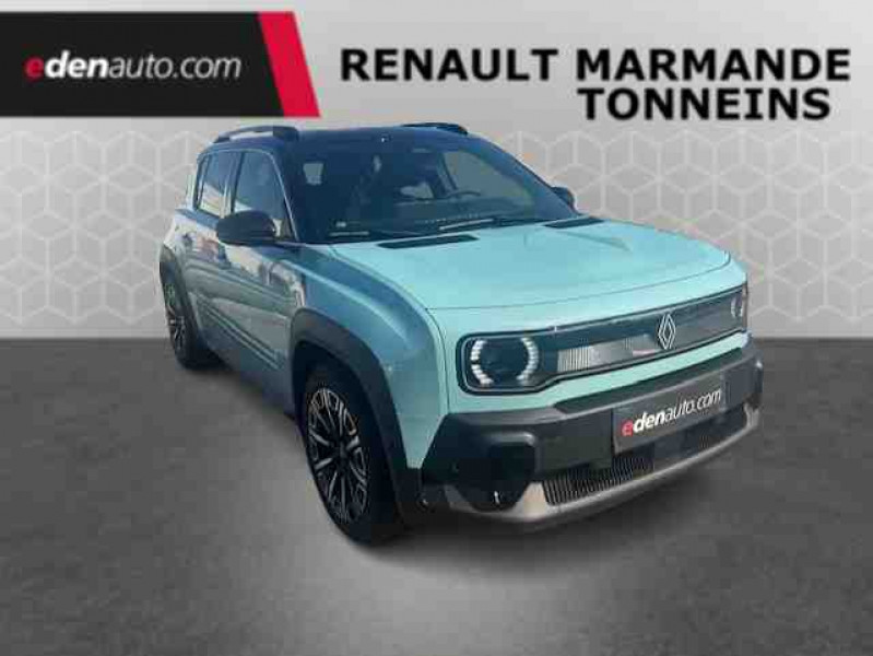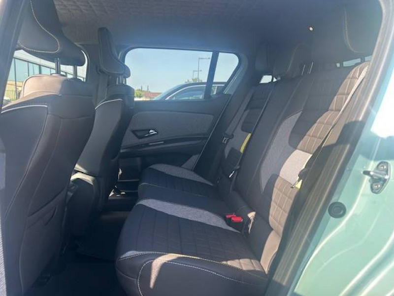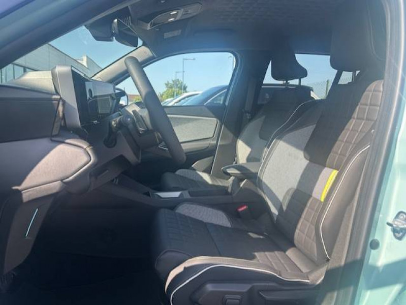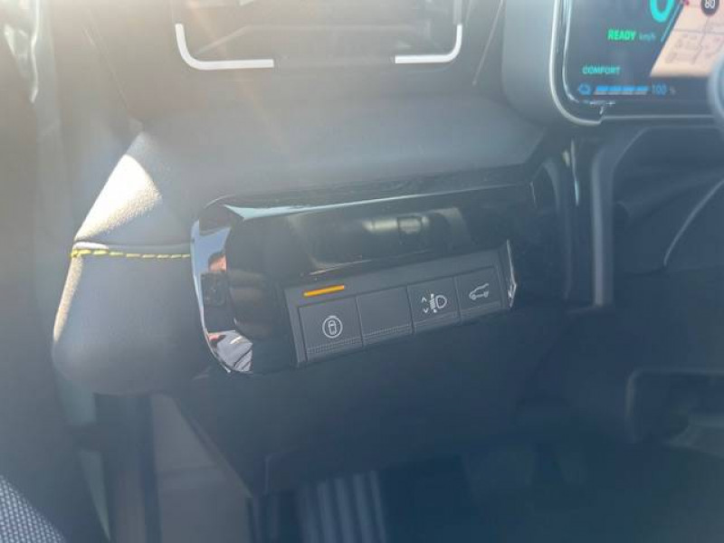 2 feux de recul / Active driver assist : conduite semi-autonome (adaptation au trafic, centrage dans la voie) / Adaptateur power to object (charge bidirectionnelle V2L) / Airbags frontaux (passager avec désactivation) et latéraux AV/AR / Alerte de distance de sécurité / Alerte de perte de vigilance / Alerte sortie sécurisée des occupants / Allumage automatique des phares avec commutation automatique des feux de route/ croisement / Antenne requin / Avertisseur d'angle mort et détection AR avec correction trajectoire d'urgence / Avertisseur de sortie de stationnement en marche AR avec freinage d'urgence automatique / Avertisseur de sortie de voie et détection AV avec correction trajectoire d'urgence / Banquette AR 3 places avec dossiers rabattables 60/40 / Barres de toit fixes longitudinales noires en aluminium / Boîte de vitesse Automate à fonction continue / Câble pour borne de recharge (mode 3 type 2 triphasé, 11kW, 6.5m) / Capot couleur carrosserie / Charge AC 11 kW triphasé + DC 100 kW (pic) + compatible charge bidirectionnelle Vehicle-to-Grid / Console de rangement fixe avec accoudoir / Contrôle de la traction (TCS) / Décors de portes AV 4EVER / Détection mains-libres à 360° (ouverture et verrouillage) / Eclairage d'ambiance 4 zones / Eclairage intérieur par LED / Freinage automatique d'urgence avec fonction intersection / Freinage automatique d'urgence urbain, inter-urbain (avecdétection voitures, piétons, cyclistes) / Frein de parking électrique avec fonction Auto-Hold / Garnitures de portières et pavillon Iconic / Gestion automatique des feux et des essuie-glaces / Gestion d'intensité du freinage régénératif par palettes au volant / Hayon motorisé main libre / Jantes alliage diamantées Noir 18'' parisienne / Jonc de toit métallisé satiné / Maintenance connectée, incluse pendant 8 ans / Mise à jour système (via firmware over the air FOTA), inclus pendant 5 ans / Mode confort, sport, éco et personnalisé / Multi-sense Personnalisation du mode de conduite / My Safety switch / Pack connected driving, inclus pendant 5 ans / Pack contrôle à distance (via l'application My Renault), inclus pendant 5 ans / Pack parking Aides au parking AV, AR et latéral, parking mains-libres / Pompe à chaleur / Régulateur de vitesse adaptatif Stop & Go (freinage et ré-accélération automatique dans le trafic) / Régulateur de vitesse intelligent : gestion automatique de la vitesse et des courbes / Reno, l'avatar officiel Renault / Réplication smartphone / Rétroviseur intérieur électrochrome avec mode jour/nuit automatique / Sellerie textile 100% recyclé pied-de-poule gris avec ruban jaune / textile refined noir matelassé / Siège conducteur avec réglage lombaire élec., sièges AV réglables 6 voies, passager rabattable / Siège passager AV + 2 sièges AR avec technologie isofix® / Système d'optimisation de la température batterie / Système multimédia openR link 10,1'' : navigation, Google intégré, précond. chargeDC, audio Arkamys Auditorium / Tableau de bord avec écran d'instrumentation 10'' / Témoin et alerte de non-bouclage de ceinture de sécurité / Volant chauffant