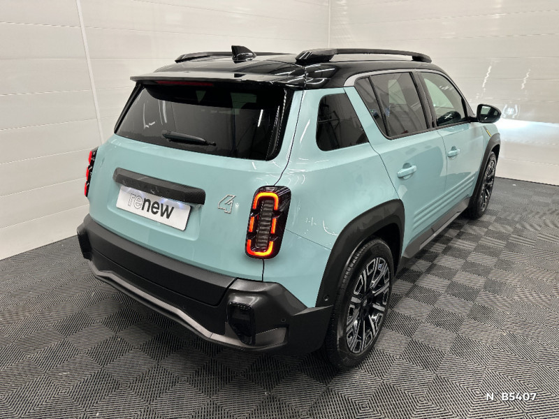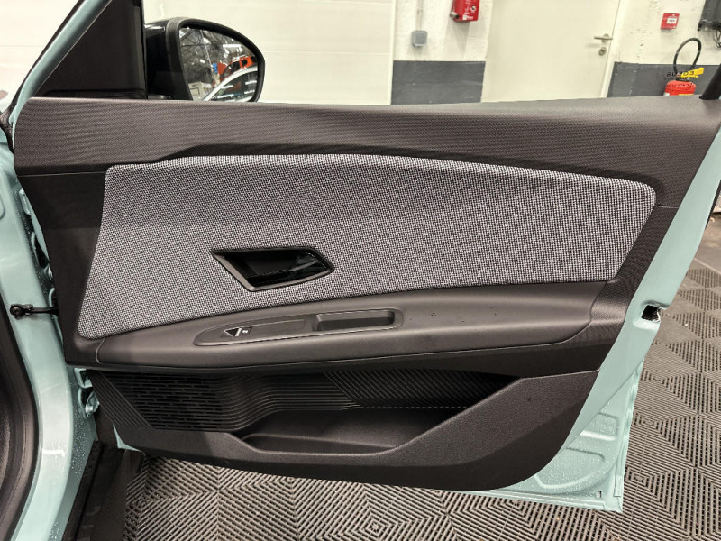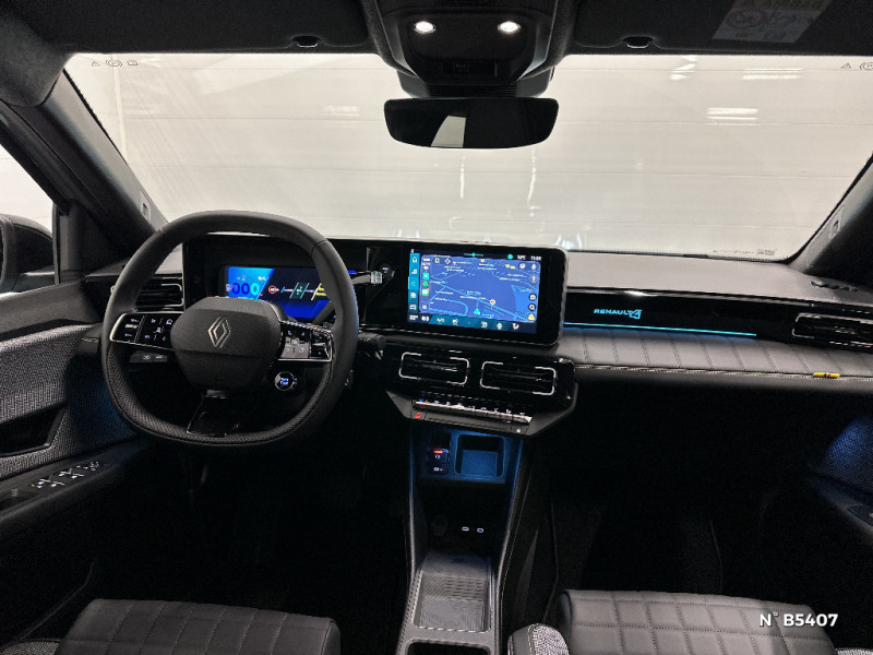 Avertisseur d'angle mort et détection AR avec correction trajectoire d'urgence / Avertisseur de sortie de stationnement en marche AR avec freinage d'urgence automatique / Avertisseur de sortie de voie et détection AV avec correction trajectoire d'urgence / Banquette AR 3 places avec dossiers rabattables 60/40 / Barres de toit fixes longitudinales noires en aluminium / Active driver assist : conduite semi-autonome (adaptation au trafic, centrage dans la voie) / Boîte de vitesse Automate à fonction continue / Câble pour borne de recharge (mode 3 type 2 triphasé, 11kW, 6.5m) / Capot couleur carrosserie / Charge AC 11 kW triphasé + DC 100 kW (pic) + compatible charge bidirectionnelle Vehicle-to-Grid / Console de rangement fixe avec accoudoir / Contrôle de la traction (TCS) / Décors de portes AV 4EVER / Détection mains-libres à 360° (ouverture et verrouillage) / Eclairage d'ambiance 4 zones / Eclairage intérieur par LED / Frein de parking électrique avec fonction Auto-Hold / Freinage automatique d'urgence avec fonction intersection / Freinage automatique d'urgence urbain, inter-urbain (avecdétection voitures, piétons, cyclistes) / Garnitures de portières et pavillon Iconic / Gestion automatique des feux et des essuie-glaces / Gestion d'intensité du freinage régénératif par palettes au volant / Régulateur de vitesse intelligent : gestion automatique de la vitesse et des courbes / Reno, l'avatar officiel Renault / Réplication smartphone / Régulateur de vitesse adaptatif Stop & Go (freinage et ré-accélération automatique dans le trafic) / Rétroviseur intérieur électrochrome avec mode jour/nuit automatique / Sellerie textile 100% recyclé pied-de-poule gris avec ruban jaune / textile refined noir matelassé / Siège conducteur avec réglage lombaire élec., sièges AV réglables 6 voies, passager rabattable / Siège passager AV + 2 sièges AR avec technologie isofix® / Système d'optimisation de la température batterie / Système multimédia openR link 10,1'' : navigation, Google intégré, précond. chargeDC, audio Arkamys Auditorium / Tableau de bord avec écran d'instrumentation 10'' / Témoin et alerte de non-bouclage de ceinture de sécurité / Volant chauffant / 2 feux de recul / Hayon motorisé main libre / Jantes alliage diamantées Noir 18'' parisienne / Jonc de toit métallisé satiné / Maintenance connectée, incluse pendant 8 ans / Mise à jour système (via firmware over the air FOTA), inclus pendant 5 ans / Mode confort, sport, éco et personnalisé / Multi-sense Personnalisation du mode de conduite / My Safety switch / Pack connected driving, inclus pendant 5 ans / Pack contrôle à distance (via l'application My Renault), inclus pendant 5 ans / Pack parking Aides au parking AV, AR et latéral, parking mains-libres / Pompe à chaleur / Adaptateur power to object (charge bidirectionnelle V2L) / Airbags frontaux (passager avec désactivation) et latéraux AV/AR / Alerte de distance de sécurité / Alerte de perte de vigilance / Alerte sortie sécurisée des occupants / Allumage automatique des phares avec commutation automatique des feux de route/ croisement / Antenne requin