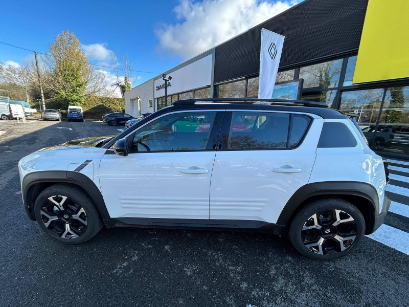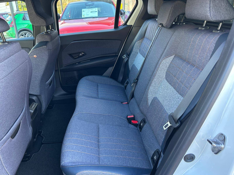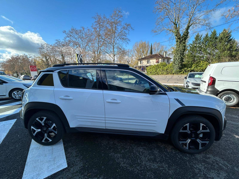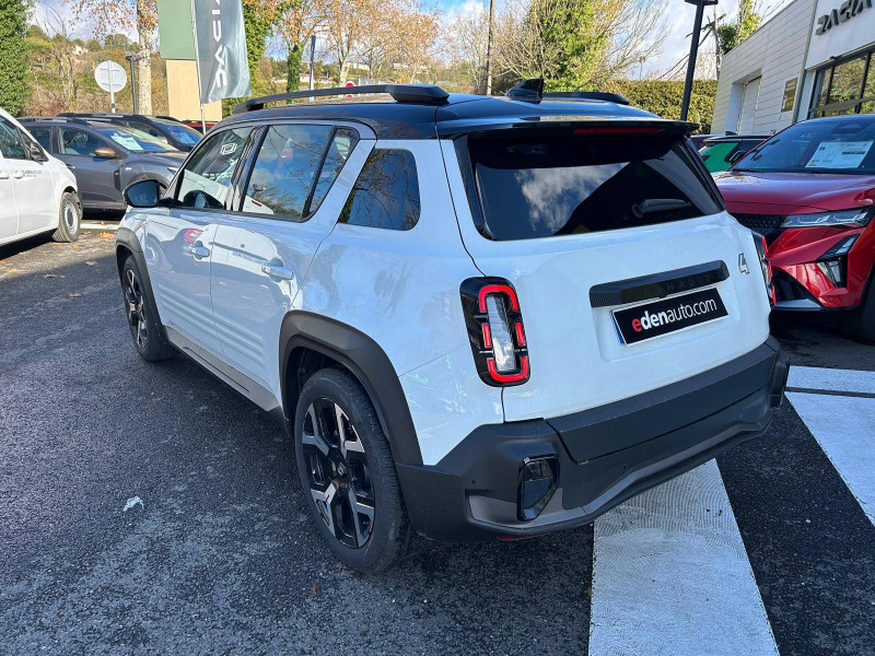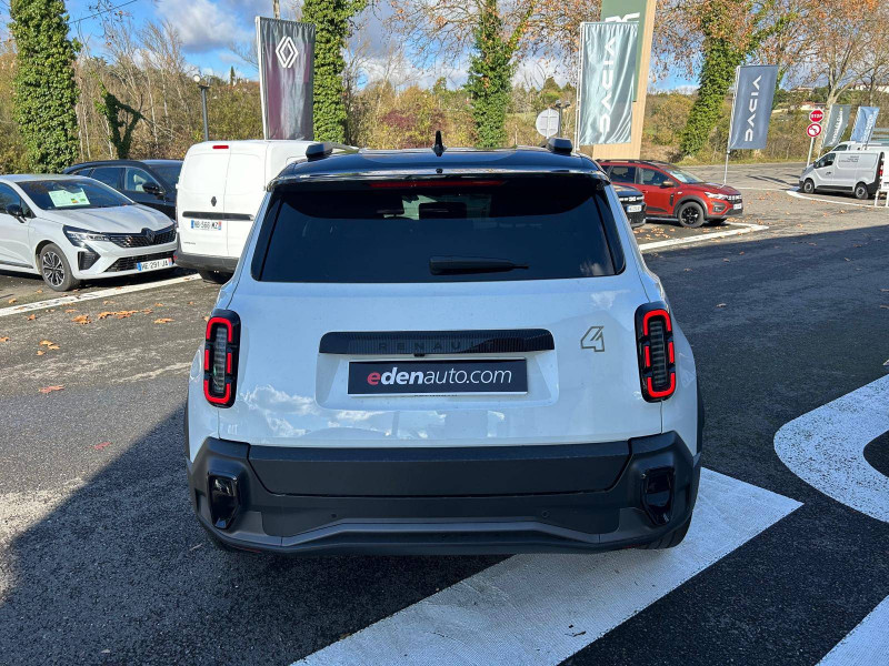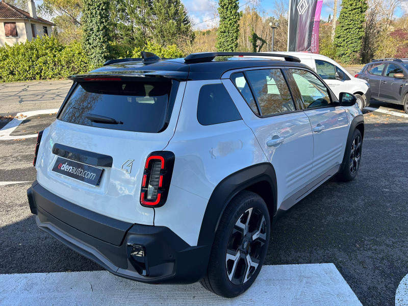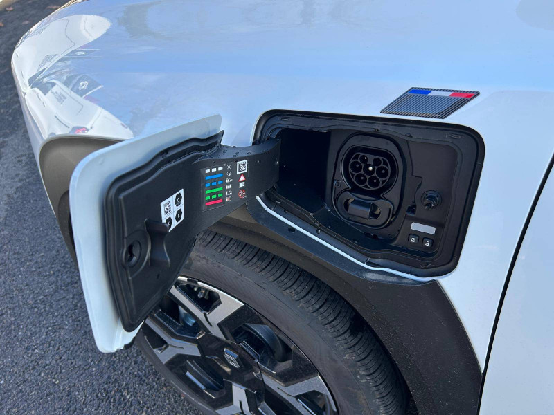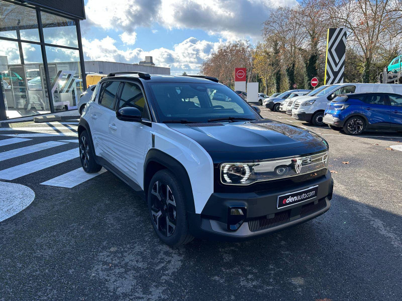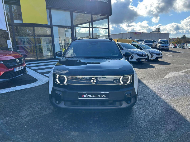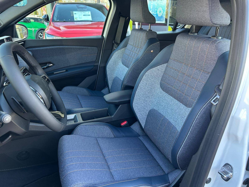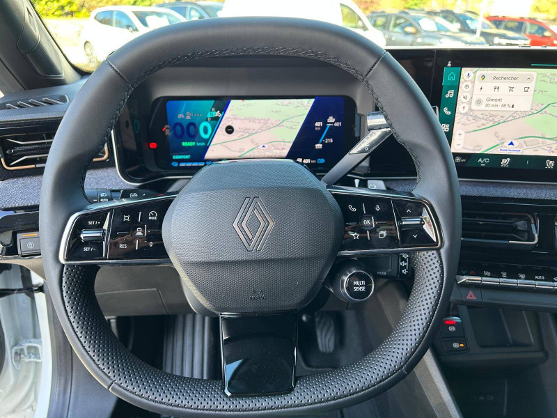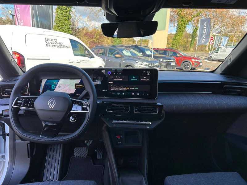2 feux de recul / Airbags frontaux (passager avec désactivation) et latéraux AV/AR / Alerte de distance de sécurité / Alerte de perte de vigilance / Allumage automatique des phares avec commutation automatique des feux de route/ croisement / Antenne requin / Avertisseur de sortie de voie et détection AV avec correction trajectoire d'urgence / Banquette AR 3 places avec dossiers rabattables 60/40 / Barres de toit fixes longitudinales noires en aluminium / Boîte de vitesse Automate à fonction continue / Câble pour borne de recharge (mode 3 type 2 triphasé, 11kW, 6.5m) / Capot couleur carrosserie / Charge AC 11 kW triphasé + DC 100 kW (pic) + compatible charge bidirectionnelle Vehicle-to-Grid / Compatible charge bidirectionnelle power to object (Vehicle-to-Load ou V2L) / Console de rangement fixe avec accoudoir / Contrôle de la traction (TCS) / Décors de portes AV 4EVER / Détection mains-libres à 360° (ouverture et verrouillage) / Eclairage d'ambiance 3 zones / Eclairage intérieur par LED / Freinage automatique d'urgence avec fonction intersection / Freinage automatique d'urgence urbain, inter-urbain (avecdétection voitures, piétons, cyclistes) / Frein de parking électrique avec fonction Auto-Hold / Garnitures de portières et pavillon Techno / Gestion automatique des feux et des essuie-glaces / Gestion d'intensité du freinage régénératif par palettes au volant / Jantes alliage diamantées Noir 18'' sixties / Jonc de toit noir brillant / Maintenance connectée, incluse pendant 8 ans / Mise à jour système (via firmware over the air FOTA), inclus pendant 5 ans / Mode confort, sport, éco et personnalisé / Multi-sense Personnalisation du mode de conduite / My Safety switch / Pack connected driving, inclus pendant 5 ans / Pack contrôle à distance (via l'application My Renault), inclus pendant 5 ans / Pompe à chaleur / Régulateur de vitesse adaptatif Stop & Go (freinage et ré-accélération automatique dans le trafic) / Reno, l'avatar officiel Renault / Réplication smartphone / Rétroviseur intérieur électrochrome avec mode jour/nuit automatique / Sellerie textile 100% recyclé "jean" matelassé avec surpiqûres cuivre / textile refined bleu foncé / Siège passager AV + 2 sièges AR avec technologie isofix® / Sièges AV manuels avec réglages 6 voies (prof/incl/haut) et siège passager rabattable / Système d'optimisation de la température batterie / Système multimédia openR link 10,1'' : navigation, Google intégré, précond. chargeDC, audio Arkamys Auditorium / Tableau de bord avec écran d'instrumentation 10'' / Témoin et alerte de non-bouclage de ceinture de sécurité