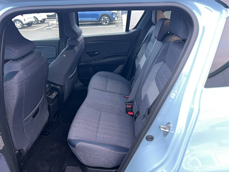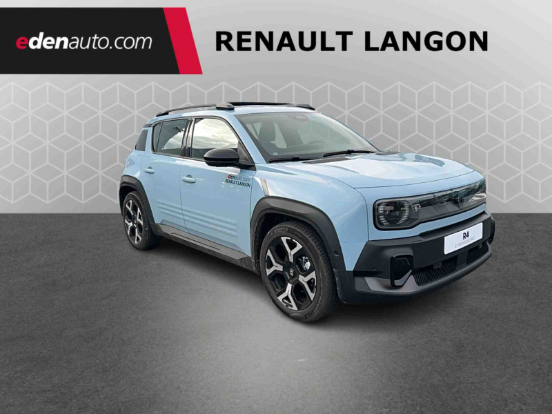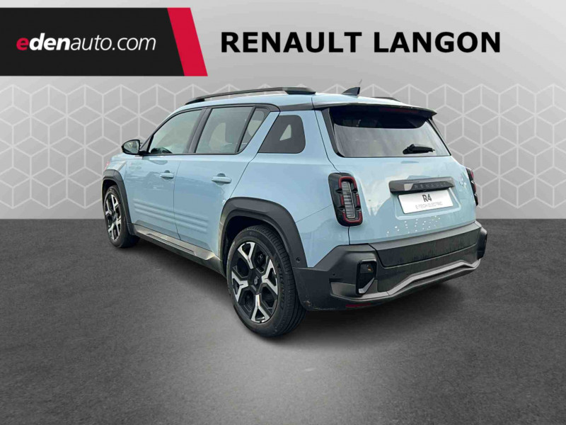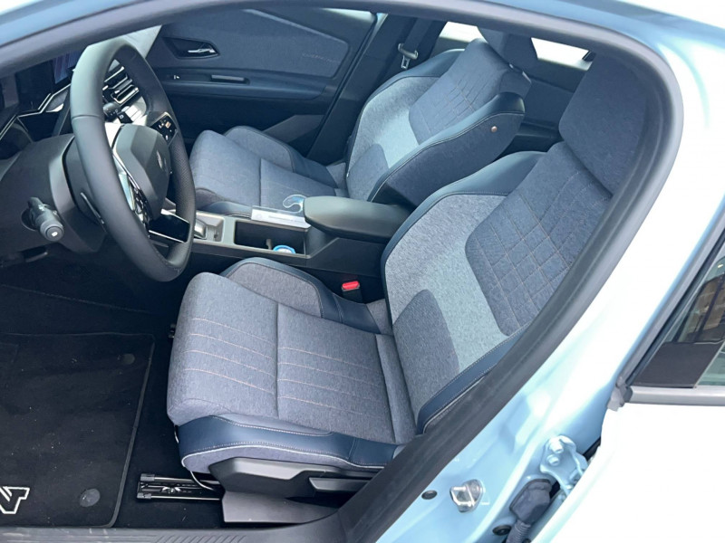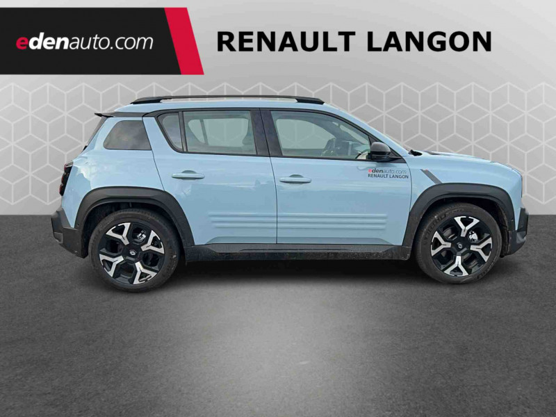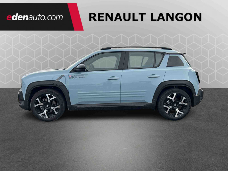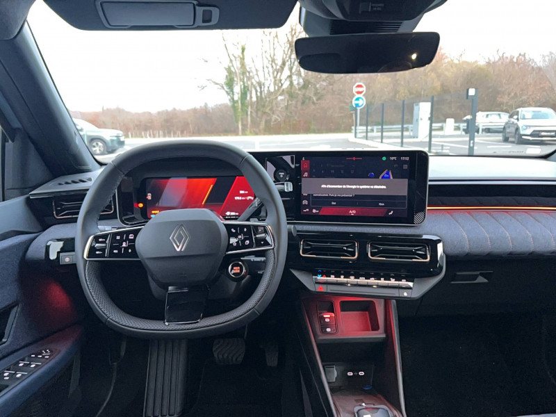 2 feux de recul / Airbags frontaux (passager avec désactivation) et latéraux AV/AR / Alerte de distance de sécurité / Alerte de perte de vigilance / Allumage automatique des phares avec commutation automatique des feux de route/ croisement / Antenne requin / Avertisseur de sortie de voie et détection AV avec correction trajectoire d'urgence / Banquette AR 3 places avec dossiers rabattables 60/40 / Barres de toit fixes longitudinales noires en aluminium / Boîte de vitesse Automate à fonction continue / Câble pour borne de recharge (mode 3 type 2 triphasé, 11kW, 6.5m) / Capot couleur carrosserie / Charge AC 11 kW triphasé + DC 100 kW (pic) + compatible charge bidirectionnelle Vehicle-to-Grid / Compatible charge bidirectionnelle power to object (Vehicle-to-Load ou V2L) / Console de rangement fixe avec accoudoir / Contrôle de la traction (TCS) / Décors de portes AV 4EVER / Détection mains-libres à 360° (ouverture et verrouillage) / Eclairage d'ambiance 3 zones / Eclairage intérieur par LED / Freinage automatique d'urgence avec fonction intersection / Freinage automatique d'urgence urbain, inter-urbain (avecdétection voitures, piétons, cyclistes) / Frein de parking électrique avec fonction Auto-Hold / Garnitures de portières et pavillon Techno / Gestion automatique des feux et des essuie-glaces / Gestion d'intensité du freinage régénératif par palettes au volant / Jantes alliage diamantées Noir 18'' sixties / Jonc de toit noir brillant / Maintenance connectée, incluse pendant 8 ans / Mise à jour système (via firmware over the air FOTA), inclus pendant 5 ans / Mode confort, sport, éco et personnalisé / Multi-sense Personnalisation du mode de conduite / My Safety switch / Pack connected driving, inclus pendant 5 ans / Pack contrôle à distance (via l'application My Renault), inclus pendant 5 ans / Pompe à chaleur / Régulateur de vitesse adaptatif Stop & Go (freinage et ré-accélération automatique dans le trafic) / Reno, l'avatar officiel Renault / Réplication smartphone / Rétroviseur intérieur électrochrome avec mode jour/nuit automatique / Sellerie textile 100% recyclé "jean" matelassé avec surpiqûres cuivre / textile refined bleu foncé / Siège passager AV + 2 sièges AR avec technologie isofix® / Sièges AV manuels avec réglages 6 voies (prof/incl/haut) et siège passager rabattable / Système multimédia openR link 10,1'' : navigation, Google intégré, précond. chargeDC, audio Arkamys Auditorium / Tableau de bord avec écran d'instrumentation 10'' / Témoin et alerte de non-bouclage de ceinture de sécurité