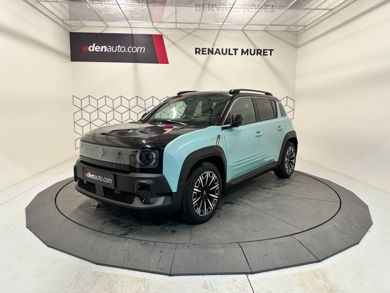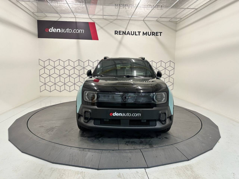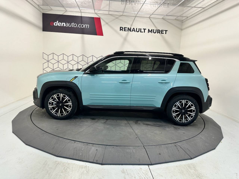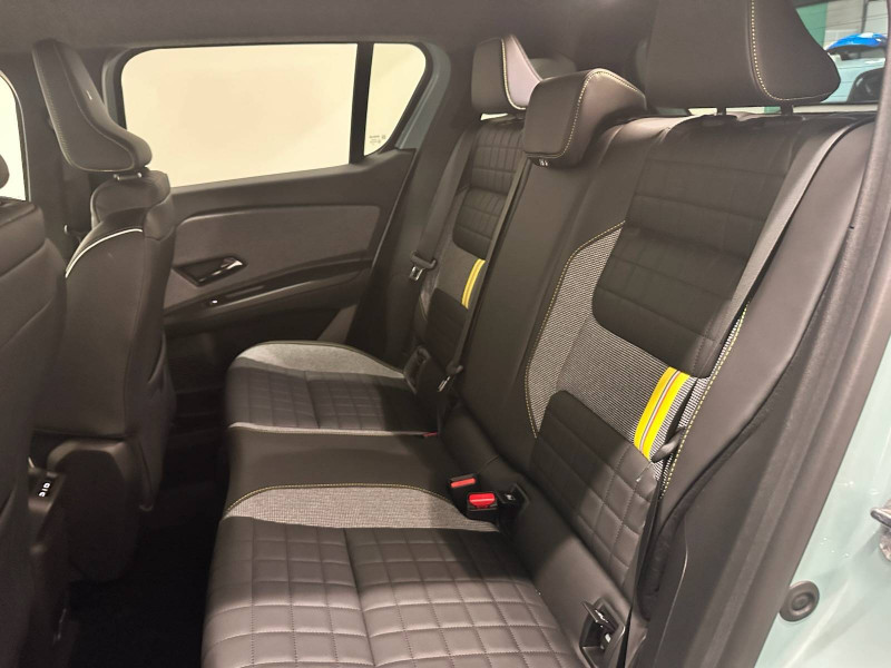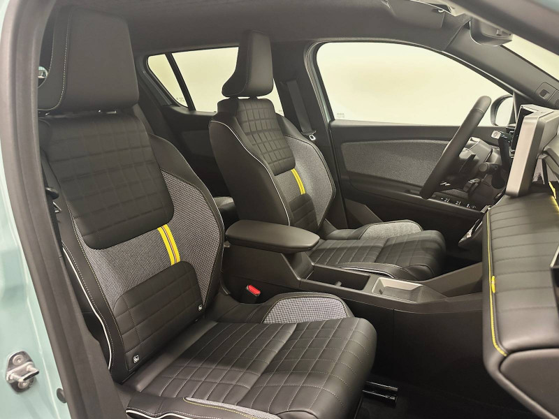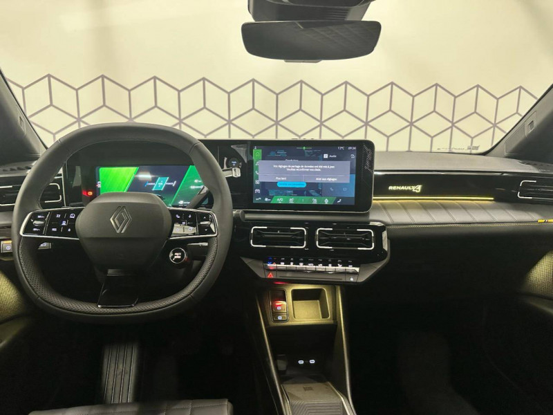 2 feux de recul / Active driver assist : conduite semi-autonome (adaptation au trafic, centrage dans la voie) / Adaptateur power to object (charge bidirectionnelle V2L) / Airbags frontaux (passager avec désactivation) et latéraux AV/AR / Alerte de distance de sécurité / Alerte sortie sécurisée des occupants / Allumage automatique des phares avec commutation automatique des feux de route/ croisement / Antenne requin / Avertisseur d'angle mort et détection AR avec correction trajectoire d'urgence / Avertisseur de sortie de stationnement en marche AR avec freinage d'urgence automatique / Avertisseur de sortie de voie et détection AV avec correction trajectoire d'urgence / Banquette AR 3 places avec dossiers rabattables 60/40 / Barres de toit fixes longitudinales noires en aluminium / Boîte de vitesse Automate à fonction continue / Câble pour borne de recharge (mode 3 type 2 triphasé, 11kW, 6.5m) / Capot couleur carrosserie / Charge AC 11 kW triphasé + DC 100 kW (pic) + compatible charge bidirectionnelle Vehicle-to-Grid / Console de rangement fixe avec accoudoir / Contrôle de la traction (TCS) / Décors de portes AV 4EVER / Détection mains-libres à 360° (ouverture et verrouillage) / Eclairage d'ambiance 4 zones / Eclairage intérieur par LED / Freinage automatique d'urgence avec fonction intersection / Freinage automatique d'urgence urbain, inter-urbain (avecdétection voitures, piétons, cyclistes) / Frein de parking électrique avec fonction Auto-Hold / Garnitures de portières et pavillon Iconic / Gestion automatique des feux et des essuie-glaces / Gestion d'intensité du freinage régénératif par palettes au volant / Hayon motorisé mains libres / Jantes alliage diamantées Noir 18'' parisienne / Jonc de toit métallisé satiné / Maintenance connectée, incluse pendant 8 ans / Mise à jour système (via firmware over the air FOTA), inclus pendant 5 ans / Mode confort, sport, éco et personnalisé / Multi-sense Personnalisation du mode de conduite / My Safety switch / Pack connected driving, inclus pendant 5 ans / Pack contrôle à distance (via l'application My Renault), inclus pendant 5 ans / Pack parking Aides au parking AV, AR et latéral, parking mains-libres / Pompe à chaleur / Régulateur de vitesse intelligent : gestion automatique de la vitesse et des courbes / Reno, l'avatar officiel Renault / Réplication smartphone / Rétroviseur intérieur électrochrome avec mode jour/nuit automatique / Sellerie textile 100% recyclé pied-de-poule gris avec ruban jaune / textile refined noir matelassé / Siège conducteur avec réglage lombaire élec., sièges AV réglables 6 voies, passager rabattable / Siège passager AV + 2 sièges AR avec technologie isofix® / Système multimédia openR link 10,1'': navigation, Google intégré, précond. charge DC, audio Arkamys Auditorium / Tableau de bord avec écran d'instrumentation 10'' / Témoin et alerte de non-bouclage de ceinture de sécurité / Volant chauffant