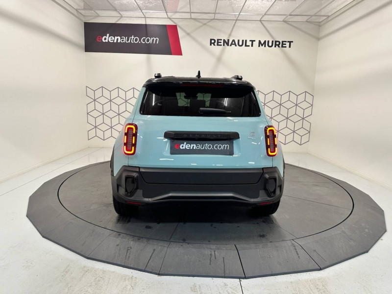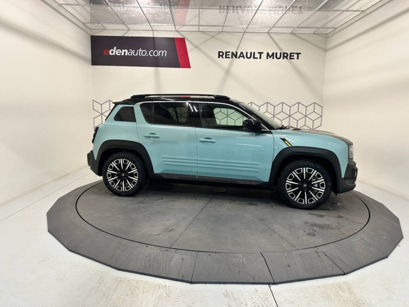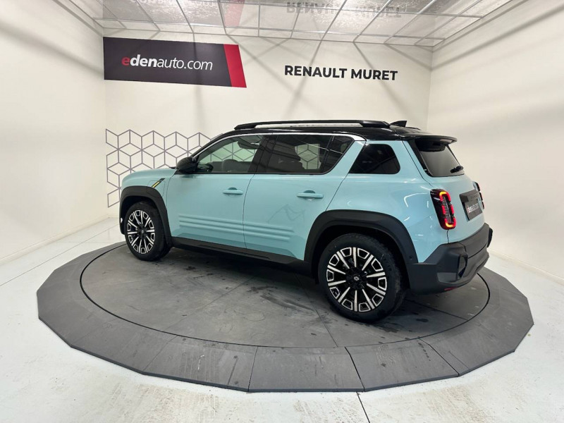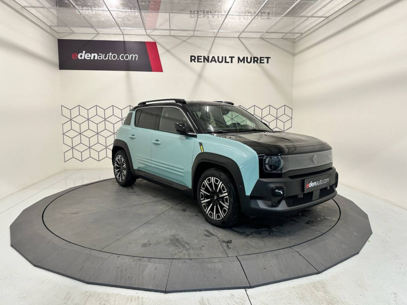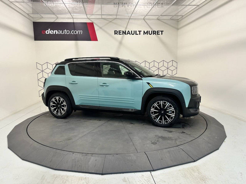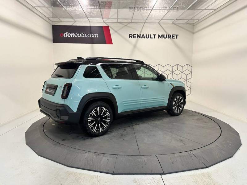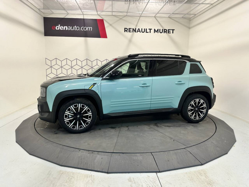2 feux de recul / Active driver assist : conduite semi-autonome (adaptation au trafic, centrage dans la voie) / Adaptateur power to object (charge bidirectionnelle V2L) / Airbags frontaux (passager avec désactivation) et latéraux AV/AR / Alerte de distance de sécurité / Alerte sortie sécurisée des occupants / Allumage automatique des phares avec commutation automatique des feux de route/ croisement / Antenne requin / Avertisseur d'angle mort et détection AR avec correction trajectoire d'urgence / Avertisseur de sortie de stationnement en marche AR avec freinage d'urgence automatique / Avertisseur de sortie de voie et détection AV avec correction trajectoire d'urgence / Banquette AR 3 places avec dossiers rabattables 60/40 / Barres de toit fixes longitudinales noires en aluminium / Boîte de vitesse Automate à fonction continue / Câble pour borne de recharge (mode 3 type 2 triphasé, 11kW, 6.5m) / Capot couleur carrosserie / Charge AC 11 kW triphasé + DC 100 kW (pic) + compatible charge bidirectionnelle Vehicle-to-Grid / Console de rangement fixe avec accoudoir / Contrôle de la traction (TCS) / Décors de portes AV 4EVER / Détection mains-libres à 360° (ouverture et verrouillage) / Eclairage d'ambiance 4 zones / Eclairage intérieur par LED / Freinage automatique d'urgence avec fonction intersection / Freinage automatique d'urgence urbain, inter-urbain (avecdétection voitures, piétons, cyclistes) / Frein de parking électrique avec fonction Auto-Hold / Garnitures de portières et pavillon Iconic / Gestion automatique des feux et des essuie-glaces / Gestion d'intensité du freinage régénératif par palettes au volant / Hayon motorisé mains libres / Jantes alliage diamantées Noir 18'' parisienne / Jonc de toit métallisé satiné / Maintenance connectée, incluse pendant 8 ans / Mise à jour système (via firmware over the air FOTA), inclus pendant 5 ans / Mode confort, sport, éco et personnalisé / Multi-sense Personnalisation du mode de conduite / My Safety switch / Pack connected driving, inclus pendant 5 ans / Pack contrôle à distance (via l'application My Renault), inclus pendant 5 ans / Pack parking Aides au parking AV, AR et latéral, parking mains-libres / Pompe à chaleur / Régulateur de vitesse intelligent : gestion automatique de la vitesse et des courbes / Reno, l'avatar officiel Renault / Réplication smartphone / Rétroviseur intérieur électrochrome avec mode jour/nuit automatique / Sellerie textile 100% recyclé pied-de-poule gris avec ruban jaune / textile refined noir matelassé / Siège conducteur avec réglage lombaire élec., sièges AV réglables 6 voies, passager rabattable / Siège passager AV + 2 sièges AR avec technologie isofix® / Système multimédia openR link 10,1'': navigation, Google intégré, précond. charge DC, audio Arkamys Auditorium / Tableau de bord avec écran d'instrumentation 10'' / Témoin et alerte de non-bouclage de ceinture de sécurité / Volant chauffant