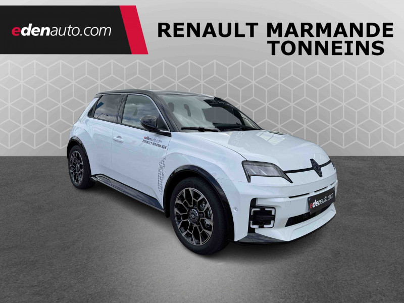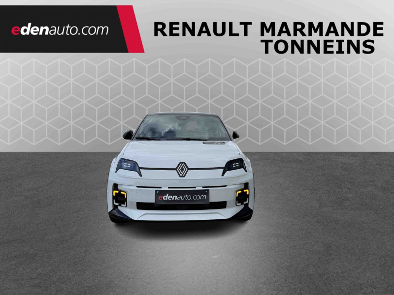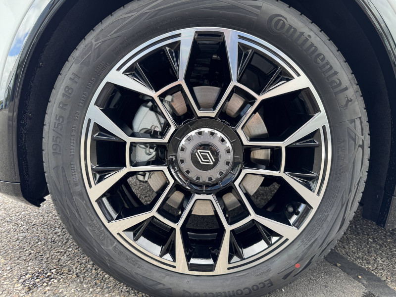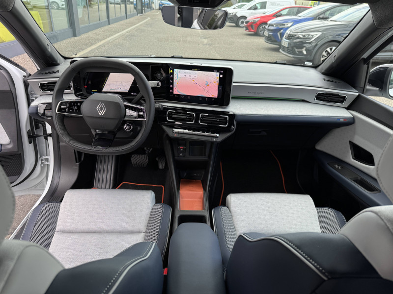 2 feux de recul / Active driver assist : conduite semi-autonome (adaptation au trafic, centrage dans la voie) / Adaptateur power to object (charge bidirectionnelle V2L) / Alerte de perte de vigilance / Alerte sortie sécurisée des occupants / Antenne requin / Avertisseur d'angle mort et détection AR avec correction trajectoire d'urgence / Avertisseur de distance de sécurité / Avertisseur de sortie de stationnement en marche AR avec freinage d'urgence automatique / Boîte de vitesse automatisée à variation continue / Câble pour borne de recharge (mode 3 type 2 triphasé, 11kW, 6.5m) / Charge AC 11 kW triphasé + DC 100 kW (pic) + compatible charge bidirectionnelle Vehicle-to-Grid / Commutation automatique des feux de route/croisement / Console de rangement fixe avec accoudoir / Contrôle de la traction (TCS) / Déconnexion manuelle airbag passager / Décor de portes AV Roland-Garros / Détection intelligente des limitations de vitesse et prévention survitesse / Détection mains-libres à 360° (ouverture et verrouillage) / Eclairage d'ambiance 4 zones / Eclairage intérieur LED tactile AV et AR / Filtre à pollen / Freinage automatique d'urgence en ville pour deux roues et piétons / Freinage régénératif avec mode B / Frein de parking électrique avec fonction Auto-Hold / Garnitures et ciel de toit gris anthracite / Gestion automatique des feux et des essuie-glaces / Indicateur de recharge sur le capot / Jantes alliage diamantées noir 18'' electro / Jonc de toit argent / Maintenance connectée, incluse pendant 8 ans / Mise à jour système (via firmware over the air FOTA), incluspendant 5 ans / Mode confort, sport, éco et personnalisé / Multi-sense : choix du mode de conduite / My Safety switch (raccourci vers configuration personnalisée des aides à la conduite) / Notice d'utilisation digitale embarqué dans le système multimédia du véhicule / Pack connected driving, inclus pendant 5 ans / Pack contrôle à distance (via l'application My Renault), inclus pendant 5 ans / Pack parking Aides au parking AV, AR et latéral, parking mains-libres / Pompe à chaleur / Régulateur de vitesse adaptatif Stop & Go (freinage et ré-accélération automatique dans le trafic) / Régulateur de vitesse intelligent : gestion automatique de la vitesse et des courbes / Reno, l'avatar officiel Renault / Réplication smartphone / Rétroviseur intérieur électrochrome avec mode jour/nuit automatique / Sellerie mixte textile recyclé gris avec tissage graphique/ textile refined bleu / Siège passager AV + 2 sièges AR avec technologie isofix / Sièges AV manuels avec réglage en hauteur et réglage lombaire électrique conducteur / Signature lumineuse à LED / Son d'alerte piétons / Système d'optimisation de la température batterie / Tableau de bord avec écran d'instrumentation 10'' / Témoin et alerte de non-bouclage de ceinture de sécurité / Volant chauffant / Volant textile enduit grainé