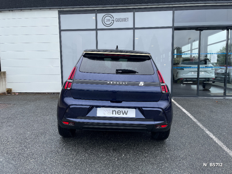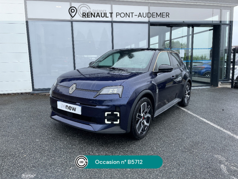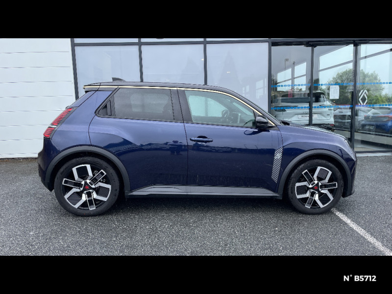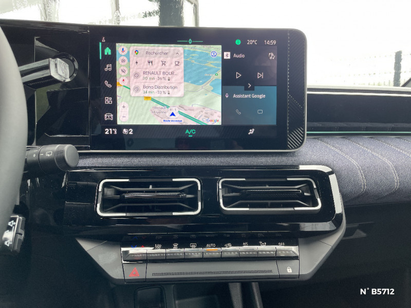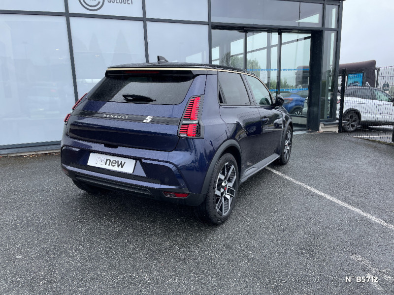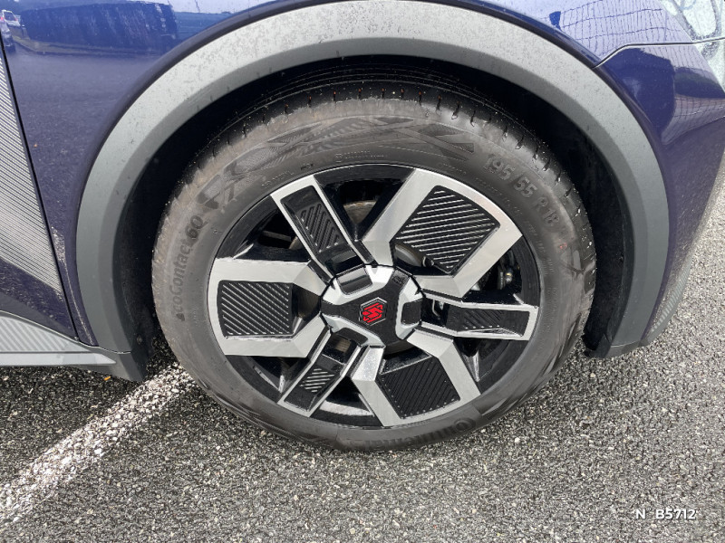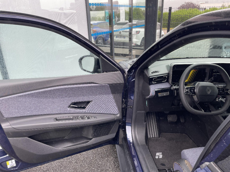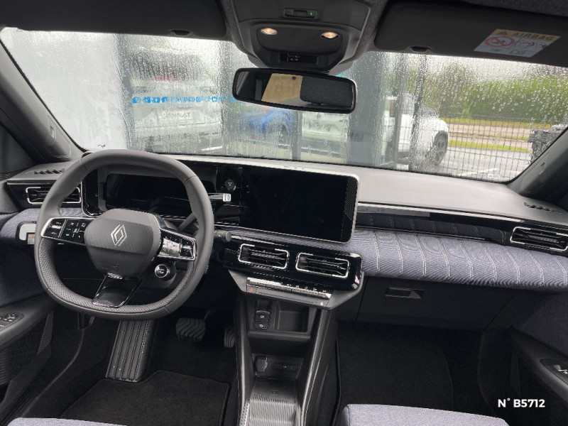 Filtre à pollen / Frein de parking électrique avec fonction Auto-Hold / Sellerie textile 100% recyclé "jean", double surpiqûre grise / ocre et textile refined noir / Siège passager AV + 2 sièges AR avec technologie isofix / Sièges AV manuels avec réglage 4 voies (prof/incl) + hauteur (siège conducteur uniquement) / Signature lumineuse à LED / Son d'alerte piétons / Système d'optimisation de la température batterie / Système multimédia openR link 10,1'' : navigation, Google intégré, précond. chargeDC, audio Arkamys Auditorium / Tableau de bord avec écran d'instrumentation 10'' / Témoin et alerte de non-bouclage de ceinture de sécurité / Volant textile enduit grainé / 2 feux de recul / Multi-sense : choix du mode de conduite / My Safety switch (raccourci vers configuration personnalisée des aides à la conduite) / Jantes alliage diamantées bicolores 18'' techno / Jonc de toit noir / Freinage automatique d'urgence en ville pour deux roues et piétons / Freinage régénératif avec mode B / Garnitures et ciel de toit gris anthracite / Gestion automatique des feux et des essuie-glaces / Indicateur de recharge sur le capot / Détection intelligente des limitations de vitesse et prévention survitesse / Détection mains-libres à 360° (ouverture et verrouillage) / Eclairage d'ambiance 3 zones / Maintenance connectée, incluse pendant 8 ans / Mise à jour système (via firmware over the air FOTA), inclus pendant 5 ans / Mode confort, sport, éco et personnalisé / Alerte de perte de vigilance / Antenne requin / Avertisseur de distance de sécurité / Boîte de vitesse automatisée à variation continue / Câble pour borne de recharge (mode 3 type 2 triphasé, 11kW, 6.5m) / Charge AC 11 kW triphasé + DC 100 kW (pic) + compatible charge bidirectionnelle Vehicle-to-Grid / Commutation automatique des feux de route/croisement / Compatible charge bidirectionnelle power to object (Vehicle-to-Load ou V2L) / Console de rangement fixe avec accoudoir / Contrôle de la traction (TCS) / Déconnexion manuelle airbag passager / Décor de portes AV numbeR5 blanc techno / Notice d'utilisation digitale embarqué dans le système multimédia du véhicule / Pack connected driving, inclus pendant 5 ans / Pack contrôle à distance (via l'application My Renault), inclus pendant 5 ans / Pompe à chaleur / Régulateur de vitesse adaptatif Stop & Go (freinage et ré-accélération automatique dans le trafic) / Reno, l'avatar officiel Renault / Réplication smartphone
