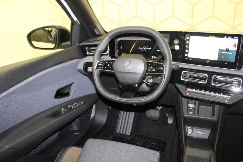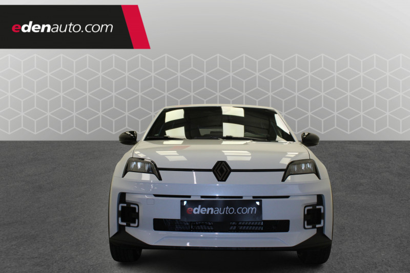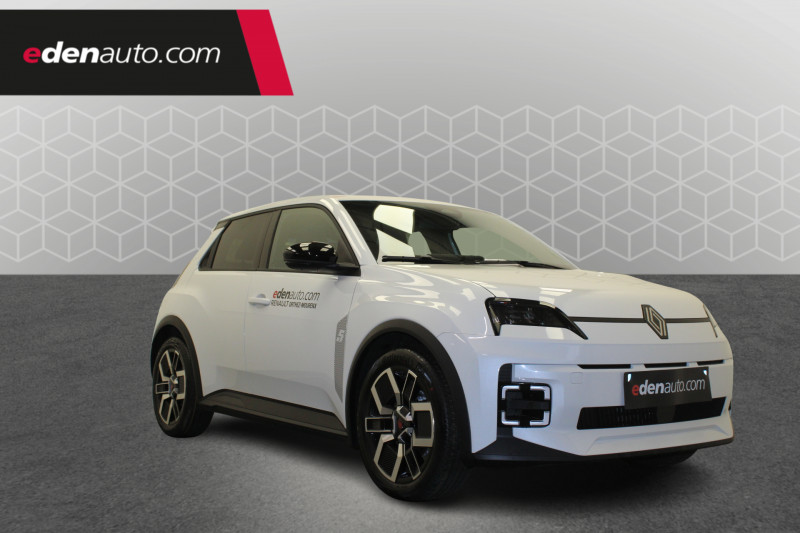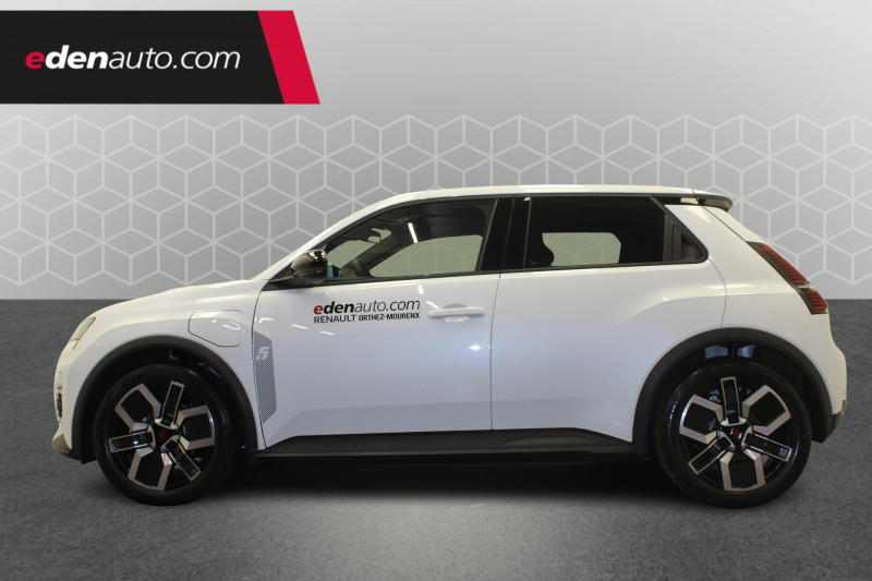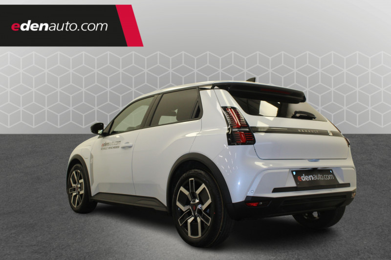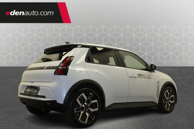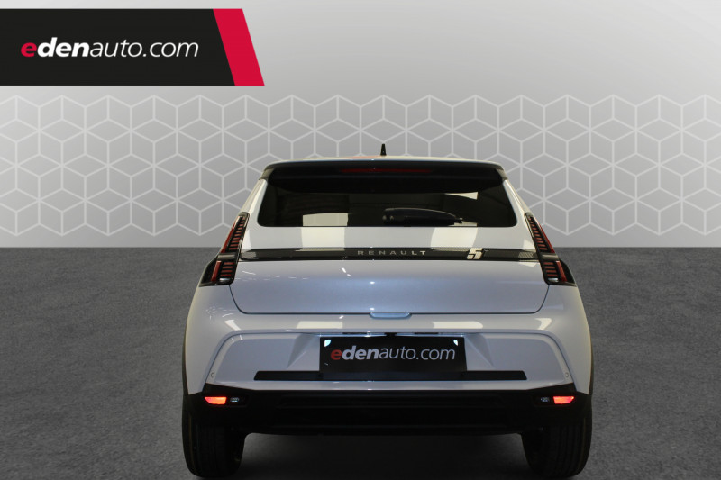2 feux de recul / Alerte de perte de vigilance / Antenne requin / Avertisseur de distance de sécurité / Boîte de vitesse automatisée à variation continue / Câble pour borne de recharge (mode 3 type 2 triphasé, 11kW, 6.5m) / Charge AC 11 kW triphasé + DC 100 kW (pic) + compatible charge bidirectionnelle Vehicle-to-Grid / Commutation automatique des feux de route/croisement / Compatible charge bidirectionnelle power to object (Vehicle-to-Load ou V2L) / Console de rangement fixe avec accoudoir / Contrôle de la traction (TCS) / Déconnexion manuelle airbag passager / Décor de portes AV numbeR5 blanc techno / Détection intelligente des limitations de vitesse et prévention survitesse / Détection mains-libres à 360° (ouverture et verrouillage) / Eclairage d'ambiance 3 zones / Filtre à pollen / Freinage automatique d'urgence en ville pour deux roues et piétons / Freinage régénératif avec mode B / Frein de parking électrique avec fonction Auto-Hold / Garnitures et ciel de toit gris anthracite / Gestion automatique des feux et des essuie-glaces / Indicateur de recharge sur le capot / Jantes alliage diamantées bicolores 18'' techno / Jonc de toit noir / Maintenance connectée, incluse pendant 8 ans / Mise à jour système (via firmware over the air FOTA), inclus pendant 5 ans / Mode confort, sport, éco et personnalisé / Multi-sense : choix du mode de conduite / My Safety switch (raccourci vers configuration personnalisée des aides à la conduite) / Notice d'utilisation digitale embarqué dans le système multimédia du véhicule / Pack connected driving, inclus pendant 5 ans / Pack contrôle à distance (via l'application My Renault), inclus pendant 5 ans / Pompe à chaleur / Régulateur de vitesse adaptatif Stop & Go (freinage et ré-accélération automatique dans le trafic) / Reno, l'avatar officiel Renault / Réplication smartphone / Sellerie textile 100% recyclé "jean", double surpiqûre grise / ocre et textile refined noir / Siège passager AV + 2 sièges AR avec technologie isofix / Sièges AV manuels avec réglage 4 voies (prof/incl) + hauteur (siège conducteur uniquement) / Signature lumineuse à LED / Son d'alerte piétons / Système d'optimisation de la température batterie / Système multimédia openR link 10,1'' : navigation, Google intégré, précond. chargeDC, audio Arkamys Auditorium / Tableau de bord avec écran d'instrumentation 10'' / Témoin et alerte de non-bouclage de ceinture de sécurité / Volant textile enduit grainé