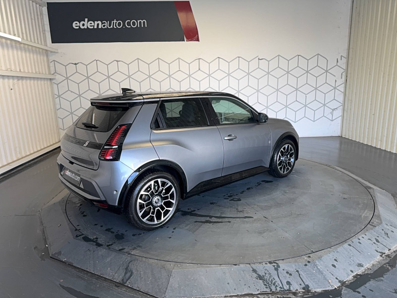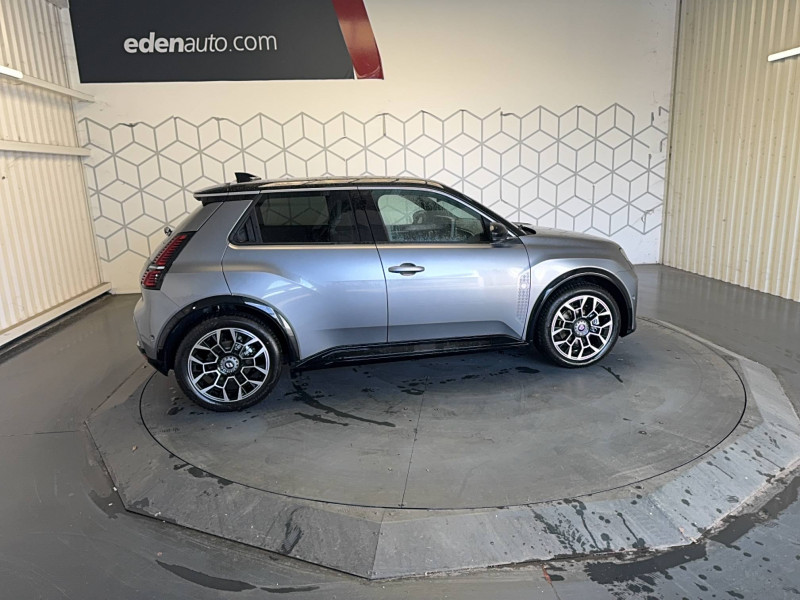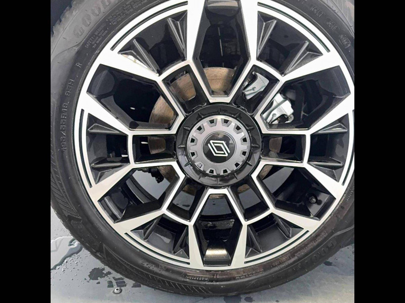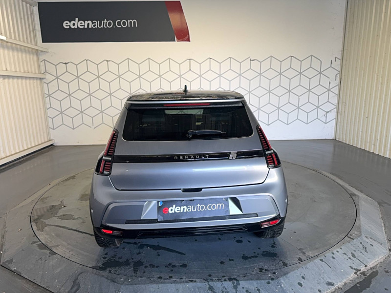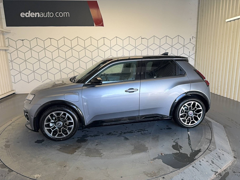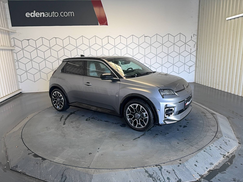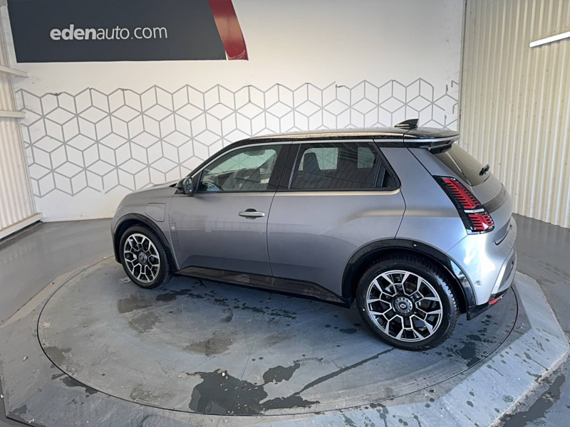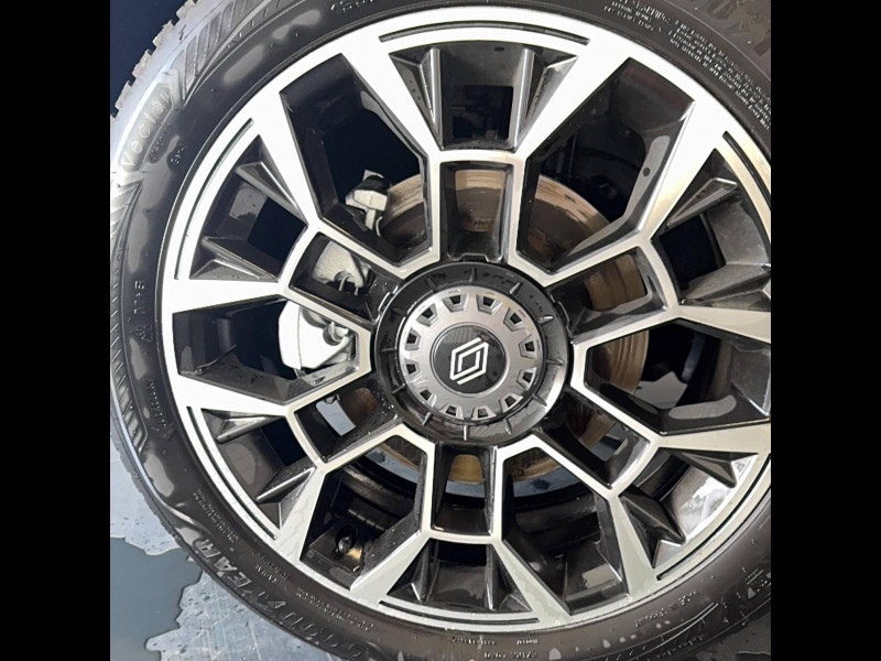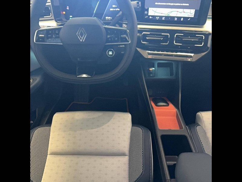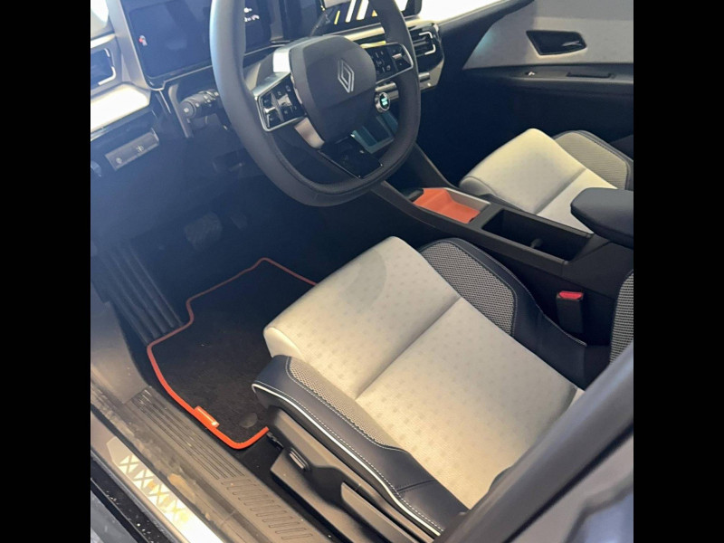 2 feux de recul / Active driver assist : conduite semi-autonome (adaptation au trafic, centrage dans la voie) / Adaptateur power to object (charge bidirectionnelle V2L) / Alerte de perte de vigilance / Alerte sortie sécurisée des occupants / Antenne requin / Avertisseur d'angle mort et détection AR avec correction trajectoire d'urgence / Avertisseur de distance de sécurité / Avertisseur de sortie de stationnement en marche AR avec freinage d'urgence automatique / Boîte de vitesse automatisée à variation continue / Câble pour borne de recharge (mode 3 type 2 triphasé, 11kW, 6.5m) / Charge AC 11 kW triphasé + DC 100 kW (pic) + compatible charge bidirectionnelle Vehicle-to-Grid / Charge rapide (DC) / Commutation automatique des feux de route/croisement / Console de rangement fixe avec accoudoir / Contrôle de la traction (TCS) / Déconnexion manuelle airbag passager / Décor de portes AV Roland-Garros / Détection intelligente des limitations de vitesse et prévention survitesse / Détection mains-libres à 360° (ouverture et verrouillage) / Eclairage d'ambiance 4 zones / Eclairage intérieur LED tactile AV et AR / Filtre à pollen / Freinage automatique d'urgence en ville pour deux roues et piétons / Freinage régénératif avec mode B / Frein de parking électrique avec fonction Auto-Hold / Garnitures et ciel de toit gris anthracite / Gestion automatique des feux et des essuie-glaces / Indicateur de recharge sur le capot / Jantes alliage diamantées noir 18'' electro / Jonc de toit argent / Maintenance connectée, incluse pendant 8 ans / Mise à jour système (via firmware over the air FOTA), inclus pendant 5 ans / Mode confort, sport, éco et personnalisé / Multi-sense : choix du mode de conduite / My Safety switch (raccourci vers configuration personnalisée des aides à la conduite) / Notice d'utilisation digitale embarqué dans le système multimédia du véhicule / Pack connected driving, inclus pendant 5 ans / Pack contrôle à distance (via l'application My Renault), inclus pendant 5 ans / Pack parking Aides au parking AV, AR et latéral, parking mains-libres / Pompe à chaleur / Régulateur de vitesse adaptatif Stop & Go (freinage et ré-accélération automatique dans le trafic) / Régulateur de vitesse intelligent : gestion automatique de la vitesse et des courbes / Reno, l'avatar officiel Renault / Réplication smartphone / Rétroviseur intérieur électrochrome avec mode jour/nuit automatique / Sellerie mixte textile recyclé gris avec tissage graphique/ textile refined bleu / Siège passager AV + 2 sièges AR avec technologie isofix / Sièges AV manuels avec réglage en hauteur et réglage lombaire électrique conducteur / Signature lumineuse à LED / Son d'alerte piétons / Système d'optimisation de la température batterie / Système multimédia openR link 10,1'' : navigation, Google intégré, précond. chargeDC, audio Arkamys Auditorium / Tableau de bord avec écran d'instrumentation 10'' / Témoin et alerte de non-bouclage de ceinture de sécurité / Volant chauffant / Volant textile enduit grainé
