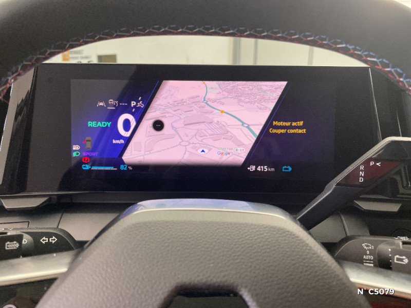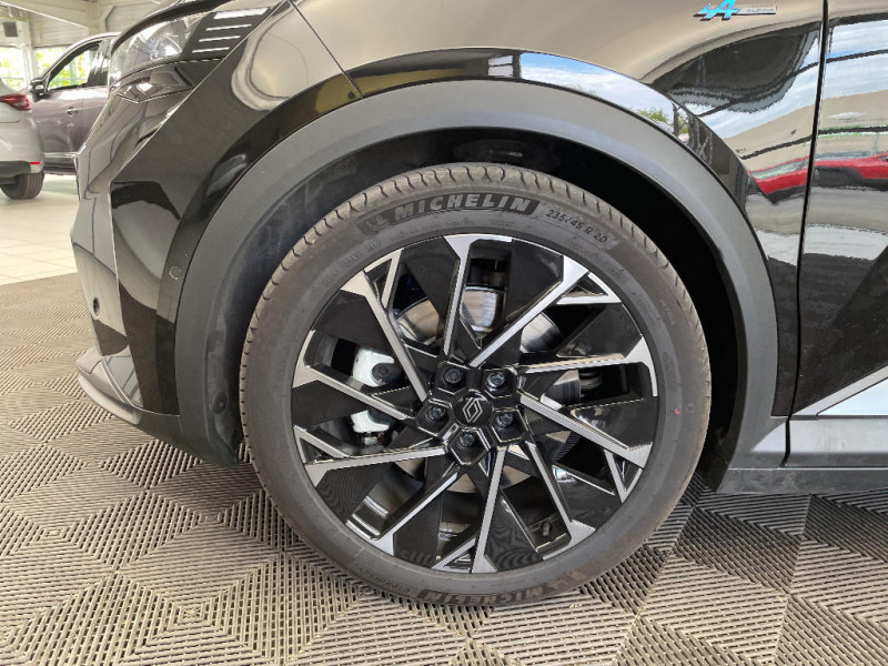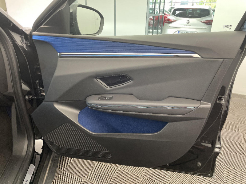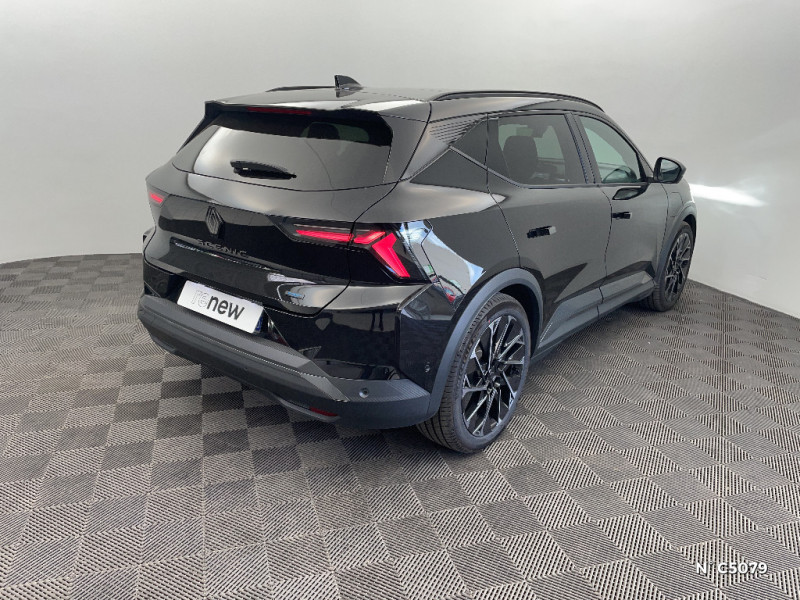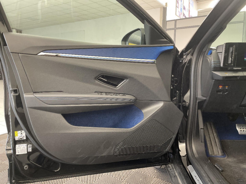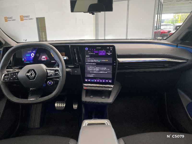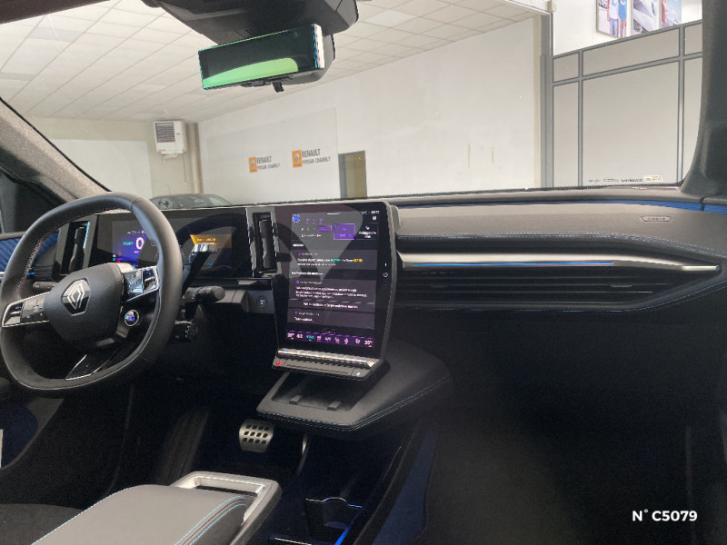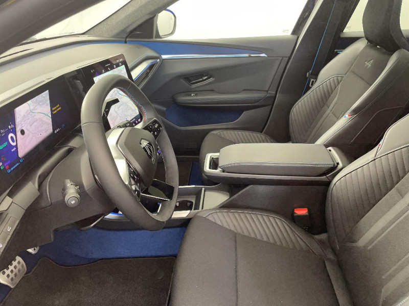 Sellerie maille embossée recyclée / textile refined matelassé noir titane et surpiqûres bleu Alpine / Sièges AV chauffants et volant chauffant / Sièges AV électriques avec réglage lombaire + siège conducteur massant / Design esprit Alpine extérieur / Alerte détection de fatigue / Alerte d'oubli de ceinture de sécurité / Alerte et prévention sortie de voie (dont urgence) / Antenne Requin / Avertisseur de distance de sécurité / Boîte de vitesse Automate à fonction continue / Bouclier AV sport avec lame F1 / Câble pour borne de recharge (mode 3 type 2 triphasé, 5m) / Caméra de recul digitale haute définition / Carte Renault accès et démarrage mains libres / Changement d'intensité du freinage régénératif par palettes / Chargeur AC 11 kW triphasé / Clignotants défilants / Commutation automatique des feux de route/croisement / Console de rangement haute avec accoudoir central coulissant / Contrôle de la traction (TCS) / Sièges avec système ISOFIX + Tether / Sièges typés sport, volant Alpine, planche de bord spécifique, pièces décor bleues / Signature lumineuse AV / Système de reconnaissance du conducteur / Système d'optimisation de la température batterie (charge rapide DC) / Tapis spécifique bleu / Volant chauffant / Volant en textile refined biosourcé / 2 feux de recul / Système Multimédia openR link 12" : Google intégré, préconditionnement batterie pour charge DC, audio Arkamys Auditorium / Tableau de bord full numérique / Freinage automatique d'urgence en ville pour deux roues et piétons / Gestion automatique des feux diurnes et des essuie-glaces / Hayon motorisé / Jantes alliage diamantées en noir verni fumé 20" speedway / Kit de gonflage / Multi-sense / Option esprit Alpine (sièges AV et volant chauffant, décors esprit Alpine, jantes spécifiques 20') / Pavillon et montants / Pompe à chaleur / Prédisposition éthylotest / Projecteurs full LED directionnels avec fonction antibrouillard / Réplication smartphone / Rétroviseur jour/nuit automatique