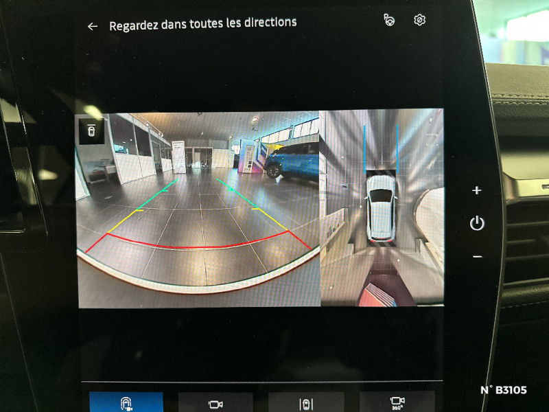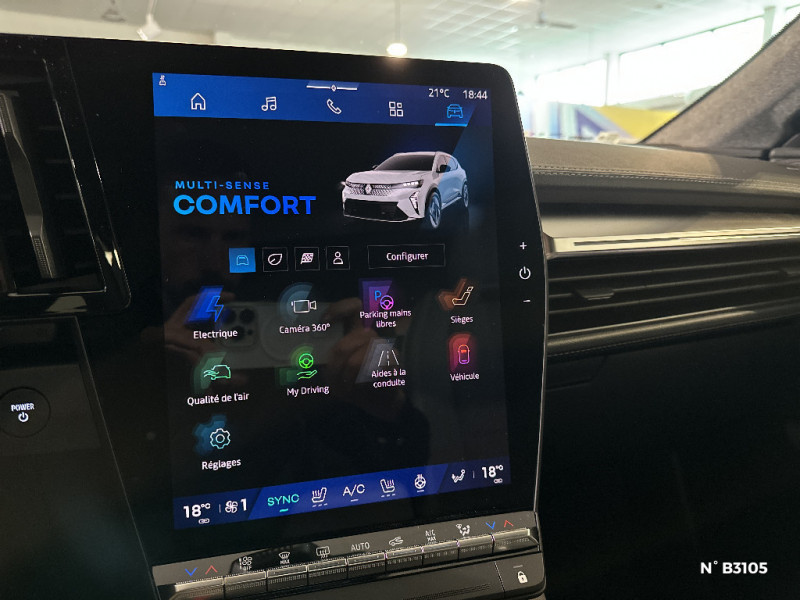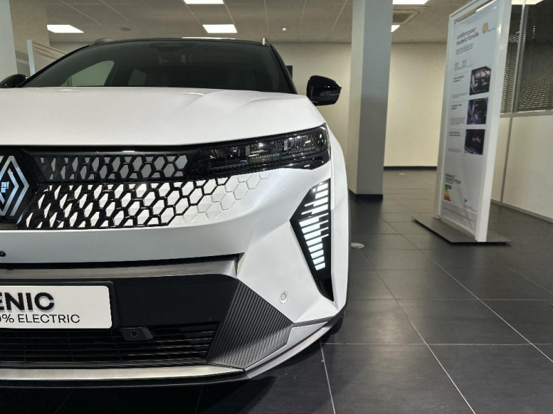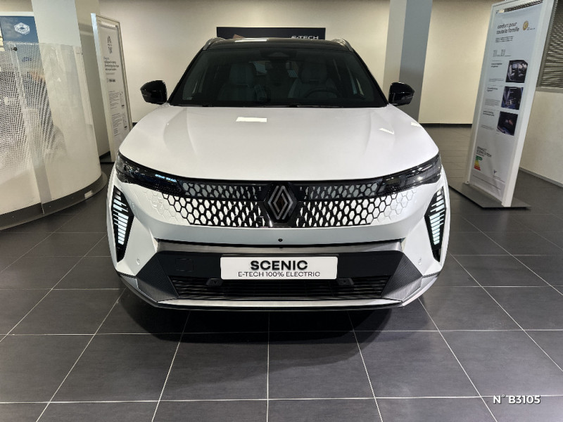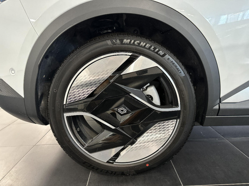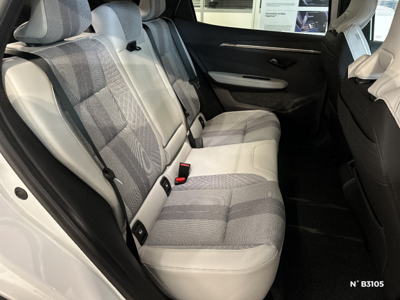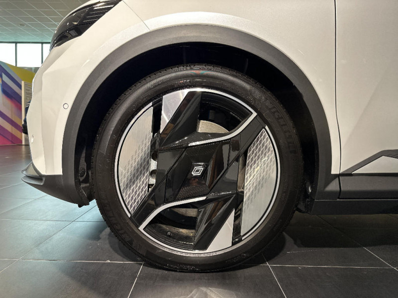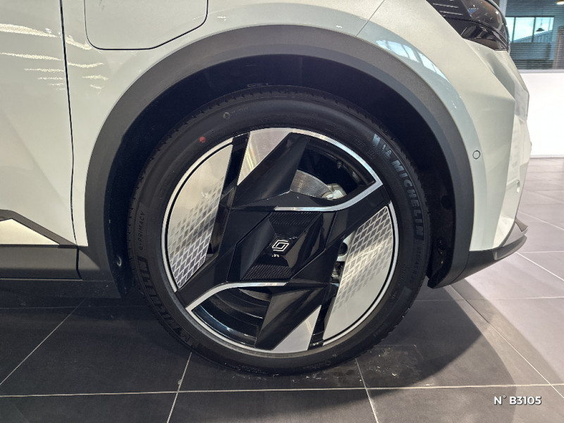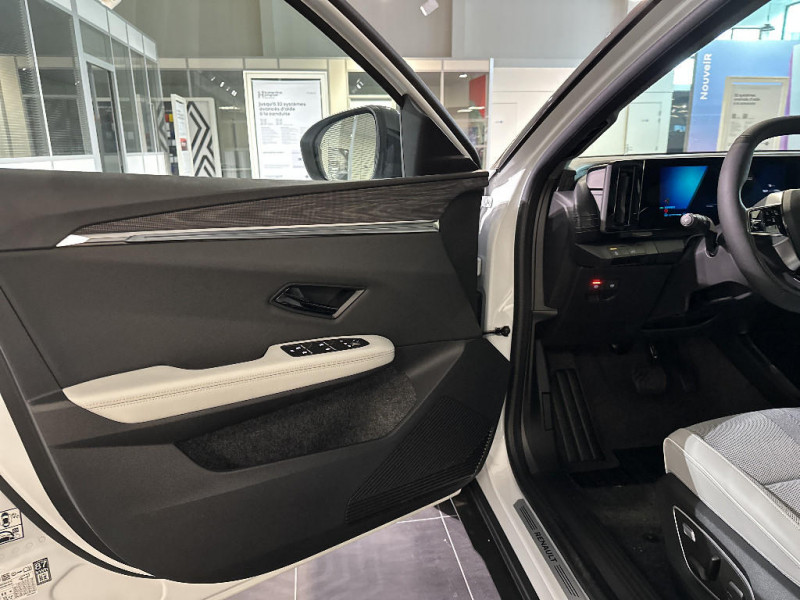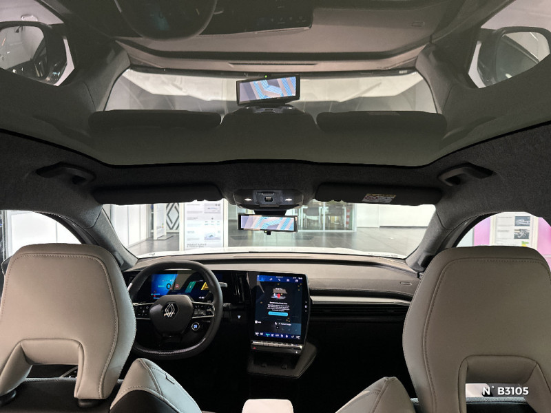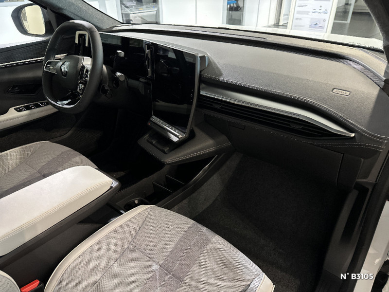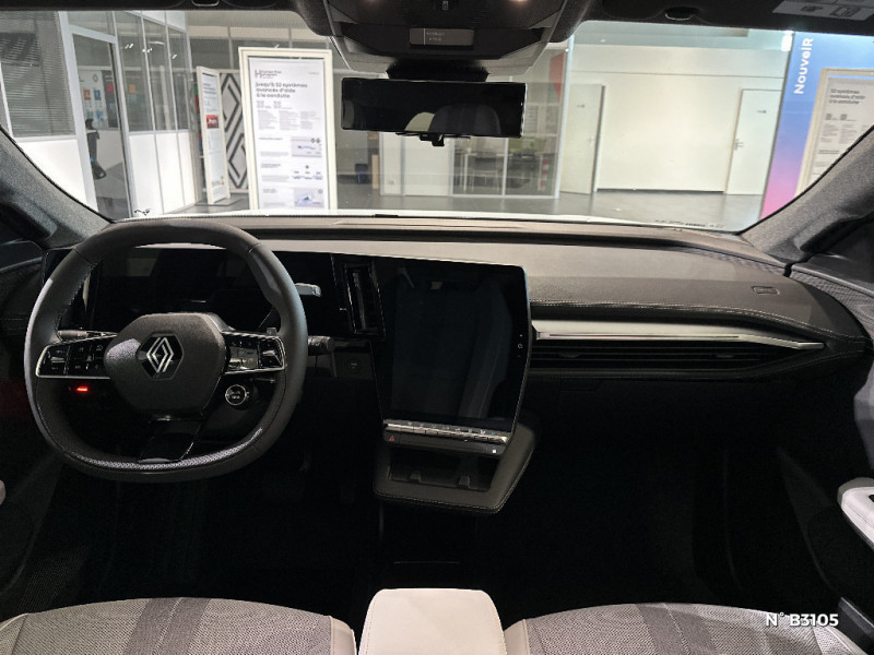 Sellerie en textile refined biosourcé noir titane et surpiqûres jaunes / Sièges AV chauffants et volant chauffant / Sièges AV électriques à mémoire avec réglage lombaire + siège conducteur massant / Sièges avec système ISOFIX + Tether / Signature lumineuse AV / Système audio premium Harman Kardon / Système de reconnaissance du conducteur / Option Iconic (sièges AV et volant chauffant, siège conducteur à réglage électrique et massant, sellerie spécifique claire, solarbay, jantes spécifiques 20", caméra 360 et full auto-park, radars AV, AR et latéraux, rétroviseur intérieur avec fonction caméra numérique, active driver assist, système audio premium Harman Kardon) / Pack contrôle à distance (via l'application My Renault), inclus pendant 5 ans / Parking mains-libres (inclus aides au parking AV, AR et latérale) / Planche de bord en textile refined biosourcé noir titane et inserts décoratifs en Alcantara / Pompe à chaleur / Prédisposition éthylotest / Tableau de bord full numérique / Toit en verre fixe panoramique opacifiant solarbay / Volant chauffant / Volant en textile refined biosourcé / 2 feux de recul / Multi-sense / Système Multimédia openR link 12" : Google intégré, préconditionnement batterie pour charge DC, audio premium Harman Kardon / Système d'optimisation de la température batterie (charge rapide DC) / Mise à jour système (via firmware over the air FOTA), inclus pendant 5 ans / Projecteurs full LED directionnels avec fonction antibrouillard / Notice d'utilisation digitale embarqué dans le système multimédia du véhicule / Active driver assist : régulateur de vitesse adaptatif contextuel + centrage dans la voie / Active driver assist régulateur de vitesse adaptatif intelligent + centrage dans la voie / Adaptateur power to object (charge bidirectionnelle V2L) / Airbags latéraux, milieu AV et rideaux / Alerte détection de fatigue / Alerte d'oubli de ceinture de sécurité / Alerte et prévention sortie de voie (dont urgence) / Alerte sortie sécurisée des occupants / Antenne Requin / Avertisseur d'angle mort et détection AR avec correction trajectoire d'urgence / Avertisseur de distance de sécurité / Avertisseur de sortie de stationnement en marche AR avec freinage d'urgence automatique / Boîte de vitesse Automate à fonction continue / Bouclier AV sport avec lame F1 / Câble pour borne de recharge (mode 3 type 2 triphasé, 5m) / Caméra 3D vision 360° / Carte Renault accès et démarrage mains libres / Changement d'intensité du freinage régénératif par palettes / Chargeur AC 11 kW triphasé / Clignotants défilants / Commutation automatique des feux de route/croisement / Console de rangement haute avec accoudoir central coulissant / Contrôle de la traction (TCS) / Freinage automatique d'urgence en ville pour deux roues et piétons / Gestion automatique des feux diurnes et des essuie-glaces / Hayon motorisé / Jantes alliage diamantées en noir brillant 20" oracle / Kit de gonflage / Maintenance connectée, incluse pendant 8 ans / Réplication smartphone / Rétroviseur intérieur avec fonction caméra numérique