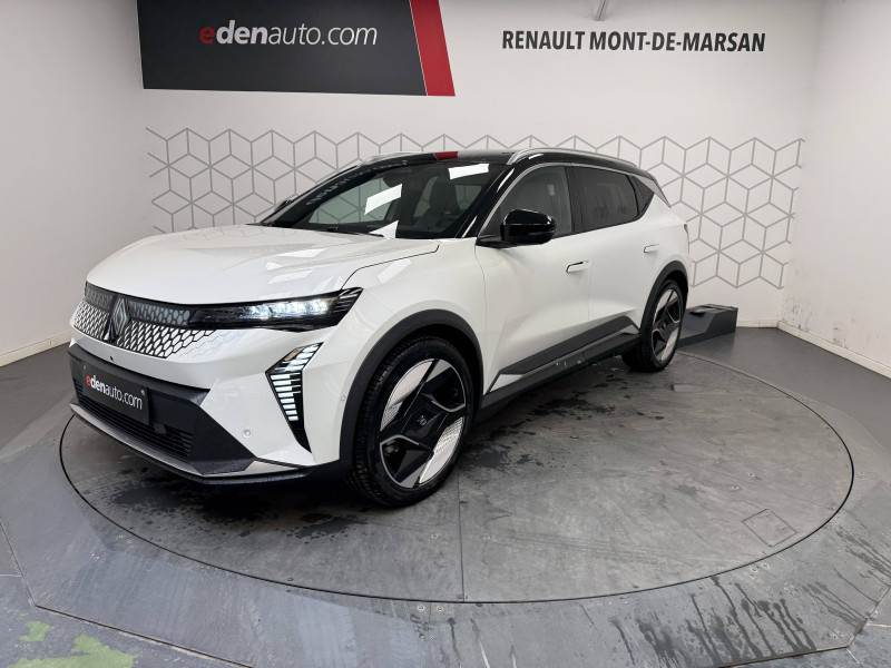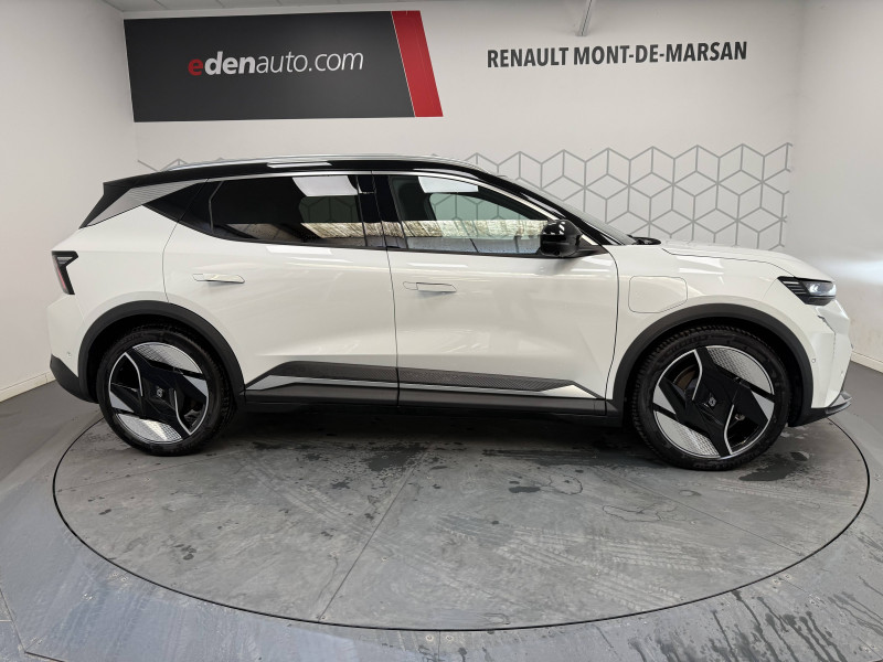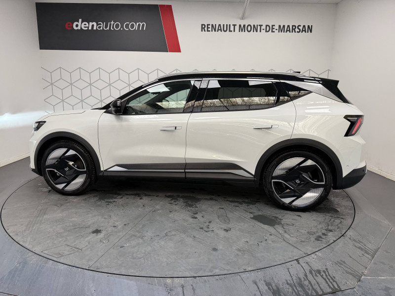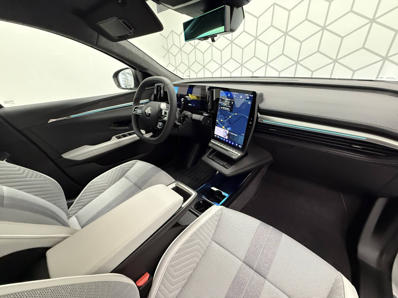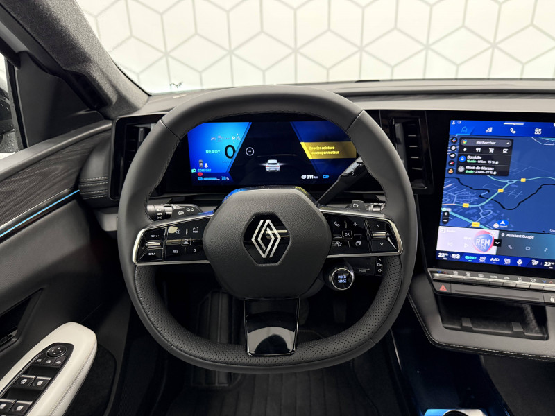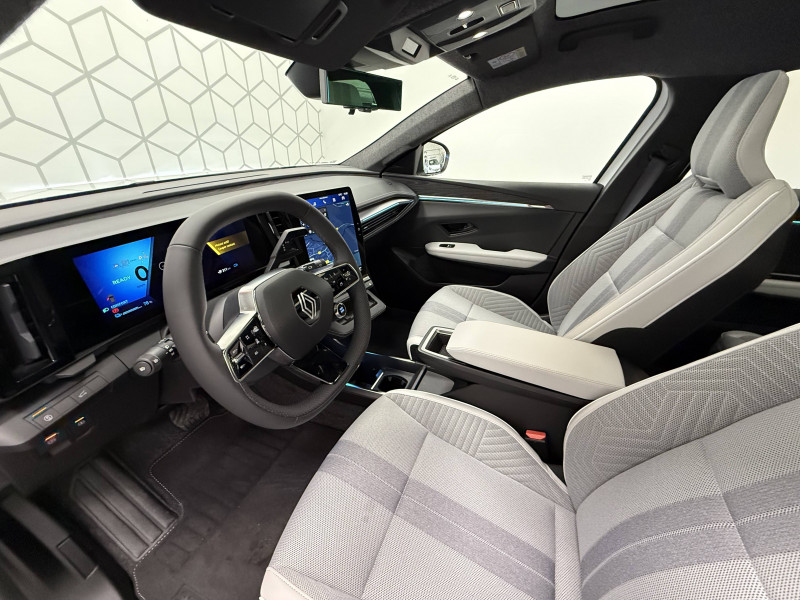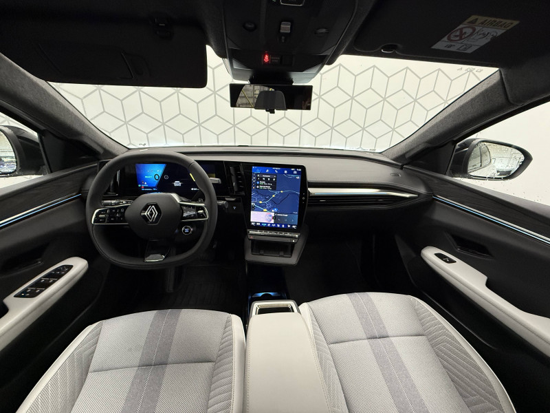 2 feux de recul / Active driver assist régulateur de vitesse adaptatif intelligent + centrage dans la voie / Airbags latéraux, milieu AV et rideaux / Alerte détection de fatigue / Alerte d'oubli de ceinture de sécurité / Alerte et prévention sortie de voie (dont urgence) / Alerte sortie sécurisée des occupants / Antenne Requin / Avertisseur d'angle mort et détection AR avec correction trajectoire d'urgence / Avertisseur de distance de sécurité AV / Avertisseur de sortie de stationnement en marche AR avec freinage d'urgence automatique / Boîte de vitesse Automate à fonction continue / Bouclier AV sport avec lame F1 / Câble pour borne de recharge (mode 3 type 2 monophasé, 5m) / Caméra 3D vision 360° / Carte Renault accès et démarrage mains libres / Changement d'intensité du freinage régénératif par palettes / Charge AC 7kW + DC 130 kW (autonomie confort) ou DC 150 kW / Clignotants défilants / Commutation automatique des feux de route/croisement / Console de rangement haute avec accoudoir central coulissant / Contrôle de la traction (TCS) / Freinage automatique d'urgence en ville pour deux roues et piétons / Gestion automatique des feux diurnes et des essuie-glaces / Hayon motorisé / Jantes alliage diamantées 20" oracle / Kit de gonflage / Maille recyclée claire embossée / textile enduit grain fin recyclé clair / surpiqûres gold / Multi-sense / Option Iconic (sièges AV et volant chauffant, siège conducteur à réglage électrique et massant, sellerie spécifique claire, solarbay, jantes spécifiques 20", caméra 360 et full auto-park, radars AV, AR et latéraux, rétroviseur intérieur avec fonction caméra numérique, active driver assist, système audio premium Harman Kardon) / Parking mains-libres (inclus aides au parking AV, AR et latérale) / Pavillon et montants / Pompe à chaleur / Prédisposition éthylotest / Prise rang 1+2+3 / Projecteurs full LED directionnels avec fonction antibrouillard / Purificateur d'air / Régulateur de vitesse adaptatif + centrage dans la voie (incl. volant chauffant) / Réplication smartphone / Rétroviseur intérieur avec fonction caméra numérique / Siège conducteur AV électrique avec fonction lombaire électrique massant + siège passager manuel / Sièges AV chauffants (incl. volant chauffant) / Sièges avec système ISOFIX + Tether / Signature lumineuse AV / Système d'optimisation de la température batterie (charge rapide DC) / Système Multimédia openR link 12" : Google intégré, précond. charge DC, audio premium Harman Kardon / Tableau de bord full numérique / Toit en verre fixe panoramique opacifiant solarbay / Volant chauffant / Volant enduit grainé