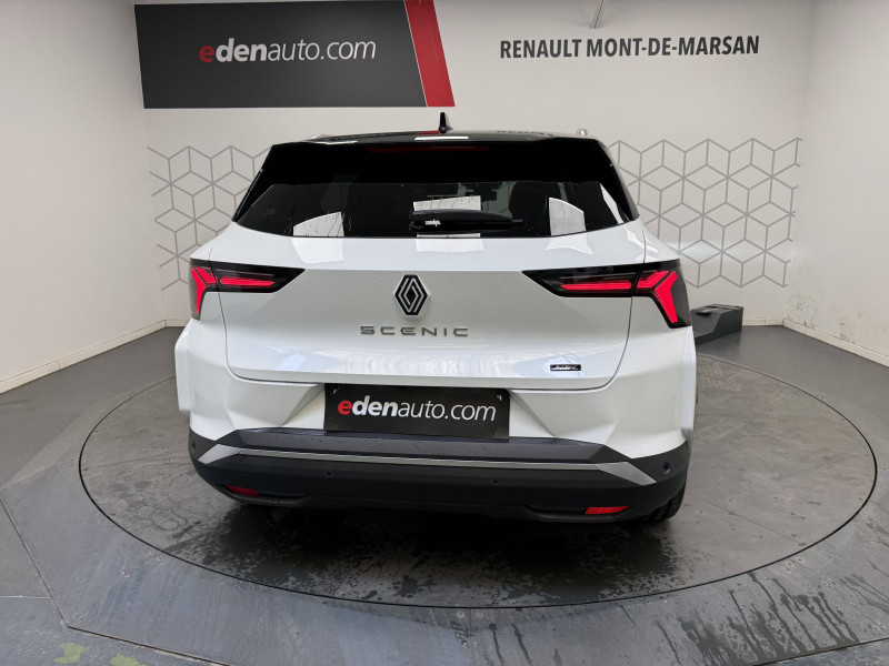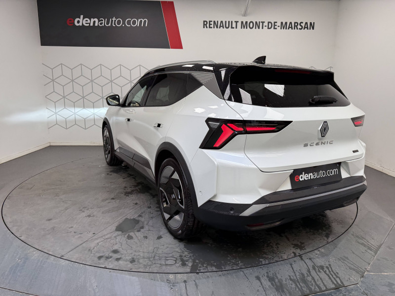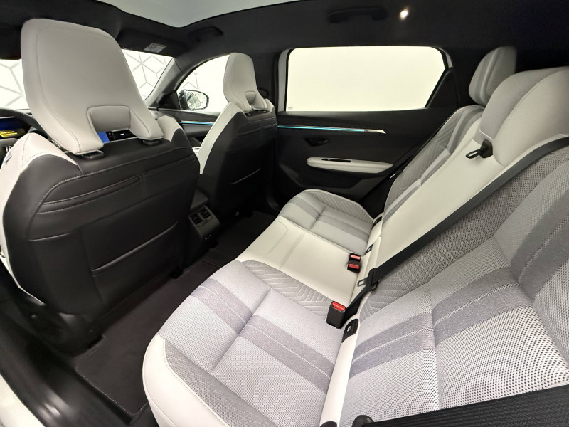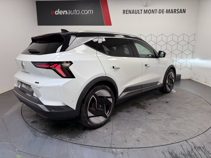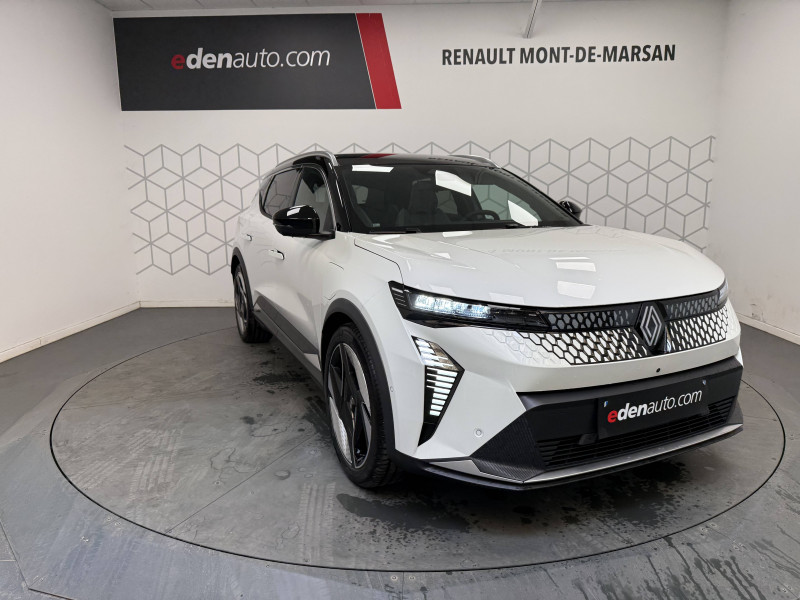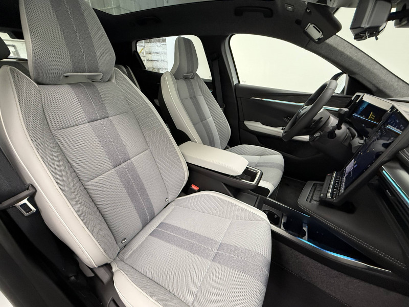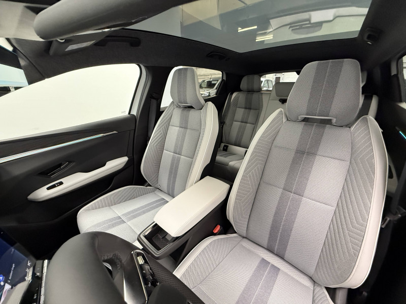 2 feux de recul / Active driver assist régulateur de vitesse adaptatif intelligent + centrage dans la voie / Airbags latéraux, milieu AV et rideaux / Alerte détection de fatigue / Alerte d'oubli de ceinture de sécurité / Alerte et prévention sortie de voie (dont urgence) / Alerte sortie sécurisée des occupants / Antenne Requin / Avertisseur d'angle mort et détection AR avec correction trajectoire d'urgence / Avertisseur de distance de sécurité AV / Avertisseur de sortie de stationnement en marche AR avec freinage d'urgence automatique / Boîte de vitesse Automate à fonction continue / Bouclier AV sport avec lame F1 / Câble pour borne de recharge (mode 3 type 2 monophasé, 5m) / Caméra 3D vision 360° / Carte Renault accès et démarrage mains libres / Changement d'intensité du freinage régénératif par palettes / Charge AC 7kW + DC 130 kW (autonomie confort) ou DC 150 kW / Clignotants défilants / Commutation automatique des feux de route/croisement / Console de rangement haute avec accoudoir central coulissant / Contrôle de la traction (TCS) / Freinage automatique d'urgence en ville pour deux roues et piétons / Gestion automatique des feux diurnes et des essuie-glaces / Hayon motorisé / Jantes alliage diamantées 20" oracle / Kit de gonflage / Maille recyclée claire embossée / textile enduit grain fin recyclé clair / surpiqûres gold / Multi-sense / Option Iconic (sièges AV et volant chauffant, siège conducteur à réglage électrique et massant, sellerie spécifique claire, solarbay, jantes spécifiques 20", caméra 360 et full auto-park, radars AV, AR et latéraux, rétroviseur intérieur avec fonction caméra numérique, active driver assist, système audio premium Harman Kardon) / Parking mains-libres (inclus aides au parking AV, AR et latérale) / Pavillon et montants / Pompe à chaleur / Prédisposition éthylotest / Prise rang 1+2+3 / Projecteurs full LED directionnels avec fonction antibrouillard / Purificateur d'air / Régulateur de vitesse adaptatif + centrage dans la voie (incl. volant chauffant) / Réplication smartphone / Rétroviseur intérieur avec fonction caméra numérique / Siège conducteur AV électrique avec fonction lombaire électrique massant + siège passager manuel / Sièges AV chauffants (incl. volant chauffant) / Sièges avec système ISOFIX + Tether / Signature lumineuse AV / Système d'optimisation de la température batterie (charge rapide DC) / Système Multimédia openR link 12" : Google intégré, précond. charge DC, audio premium Harman Kardon / Tableau de bord full numérique / Toit en verre fixe panoramique opacifiant solarbay / Volant chauffant / Volant enduit grainé