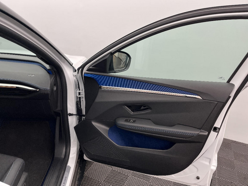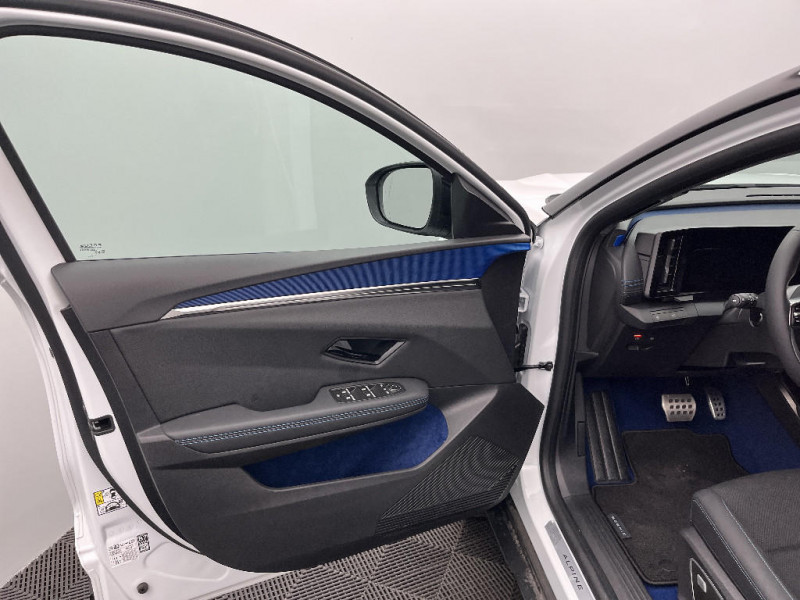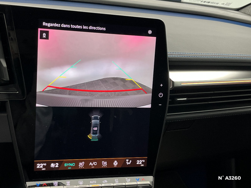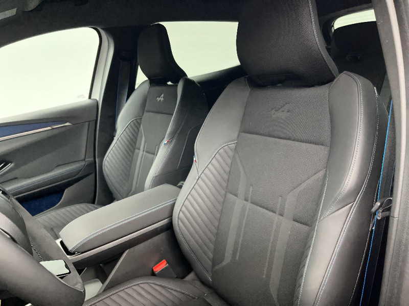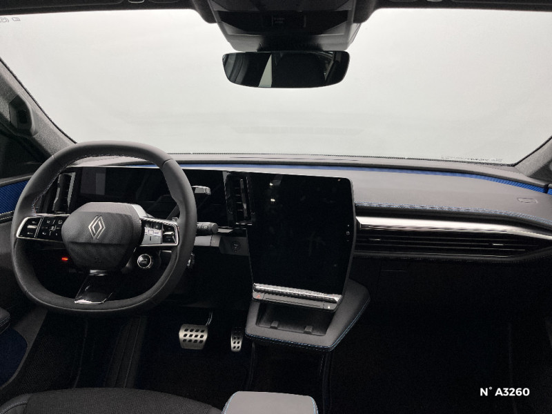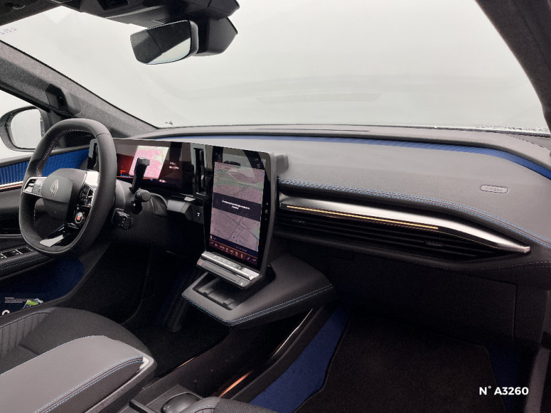 Multi-sense / Option esprit Alpine (sièges AV et volant chauffant, décors esprit Alpine, jantes spécifiques 20') / Pavillon et montants / Pompe à chaleur / Prédisposition éthylotest / Projecteurs full LED directionnels avec fonction antibrouillard / Réplication smartphone / Rétroviseur jour/nuit automatique / Sellerie maille embossée recyclée / textile refined matelassé noir titane et surpiqûres bleu Alpine / Sièges AV chauffants et volant chauffant / Sièges AV électriques avec réglage lombaire + siège conducteur massant / Sièges avec système ISOFIX + Tether / Sièges typés sport, volant Alpine, planche de bord spécifique, pièces décor bleues / Signature lumineuse AV / Système de reconnaissance du conducteur / Système d'optimisation de la température batterie (charge rapide DC) / Tapis spécifique bleu / Volant chauffant / Volant en textile refined biosourcé / 2 feux de recul / Système Multimédia openR link 12" : Google intégré, préconditionnement batterie pour charge DC, audio Arkamys Auditorium / Tableau de bord full numérique / Alerte et prévention sortie de voie (dont urgence) / Antenne Requin / Avertisseur de distance de sécurité / Boîte de vitesse Automate à fonction continue / Bouclier AV sport avec lame F1 / Câble pour borne de recharge (mode 3 type 2 triphasé, 5m) / Caméra de recul digitale haute définition / Carte Renault accès et démarrage mains libres / Changement d'intensité du freinage régénératif par palettes / Chargeur AC 11 kW triphasé / Clignotants défilants / Commutation automatique des feux de route/croisement / Console de rangement haute avec accoudoir central coulissant / Contrôle de la traction (TCS) / Airbags latéraux, milieu AV et rideaux / Design esprit Alpine extérieur / Alerte détection de fatigue / Alerte d'oubli de ceinture de sécurité / Freinage automatique d'urgence en ville pour deux roues et piétons / Gestion automatique des feux diurnes et des essuie-glaces / Hayon motorisé / Jantes alliage diamantées en noir verni fumé 20" speedway / Kit de gonflage