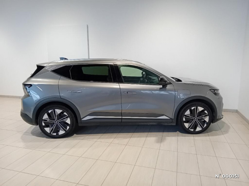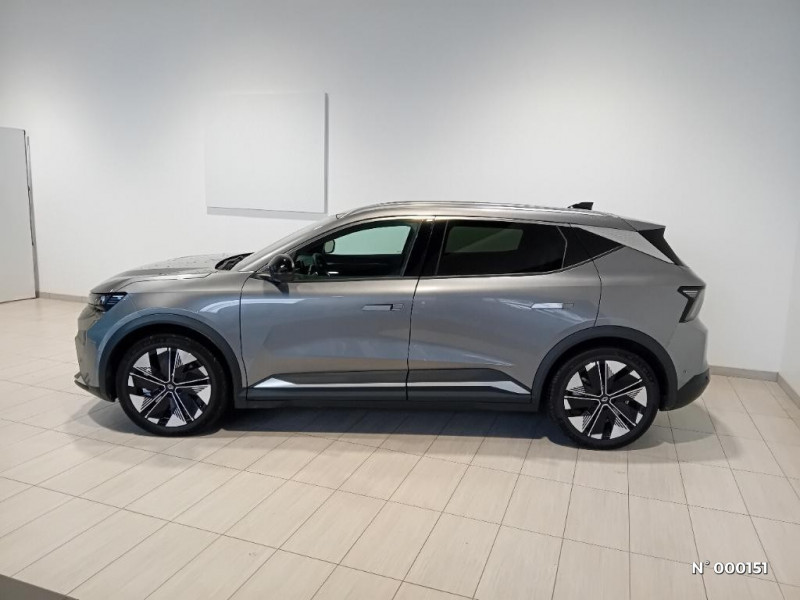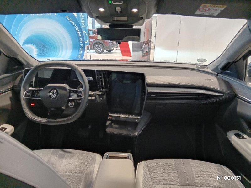 Active driver assist : régulateur de vitesse adaptatif contextuel + centrage dans la voie / Freinage automatique d'urgence en ville pour deux roues et piétons / Gestion automatique des feux diurnes et des essuie-glaces / Hayon motorisé / Jantes alliage diamantées en noir brillant 20" oracle / Kit de gonflage / Maintenance connectée, incluse pendant 8 ans / Câble pour borne de recharge (mode 3 type 2 triphasé, 5m) / Caméra 3D vision 360° / Carte Renault accès et démarrage mains libres / Changement d'intensité du freinage régénératif par palettes / Chargeur AC 11 kW triphasé / Clignotants défilants / Commutation automatique des feux de route/croisement / Console de rangement haute avec accoudoir central coulissant / Contrôle de la traction (TCS) / Tableau de bord full numérique / Toit en verre fixe panoramique opacifiant solarbay / Volant chauffant / Volant en textile refined biosourcé / 2 feux de recul / Sièges AV chauffants et volant chauffant / Sièges AV électriques à mémoire avec réglage lombaire + siège conducteur massant / Sièges avec système ISOFIX + Tether / Signature lumineuse AV / Système audio premium Harman Kardon / Système de reconnaissance du conducteur / Système d'optimisation de la température batterie (charge rapide DC) / Système Multimédia openR link 12" : Google intégré, préconditionnement batterie pour charge DC, audio premium Harman Kardon / Mise à jour système (via firmware over the air FOTA), inclus pendant 5 ans / Multi-sense / Notice d'utilisation digitale embarqué dans le système multimédia du véhicule / Option Iconic (sièges AV et volant chauffant, siège conducteur à réglage électrique et massant, sellerie spécifique claire, solarbay, jantes spécifiques 20", caméra 360 et full auto-park, radars AV, AR et latéraux, rétroviseur intérieur avec fonction caméra numérique, active driver assist, système audio premium Harman Kardon) / Pack contrôle à distance (via l'application My Renault), inclus pendant 5 ans / Parking mains-libres (inclus aides au parking AV, AR et latérale) / Planche de bord en textile refined biosourcé noir titane et inserts décoratifs en Alcantara / Pompe à chaleur / Prédisposition éthylotest / Projecteurs full LED directionnels avec fonction antibrouillard / Réplication smartphone / Rétroviseur intérieur avec fonction caméra numérique / Sellerie en textile refined biosourcé noir titane et surpiqûres jaunes / Active driver assist régulateur de vitesse adaptatif intelligent + centrage dans la voie / Adaptateur power to object (charge bidirectionnelle V2L) / Airbags latéraux, milieu AV et rideaux / Alerte détection de fatigue / Alerte d'oubli de ceinture de sécurité / Alerte et prévention sortie de voie (dont urgence) / Alerte sortie sécurisée des occupants / Antenne Requin / Avertisseur d'angle mort et détection AR avec correction trajectoire d'urgence / Avertisseur de distance de sécurité / Avertisseur de sortie de stationnement en marche AR avec freinage d'urgence automatique / Boîte de vitesse Automate à fonction continue / Bouclier AV sport avec lame F1