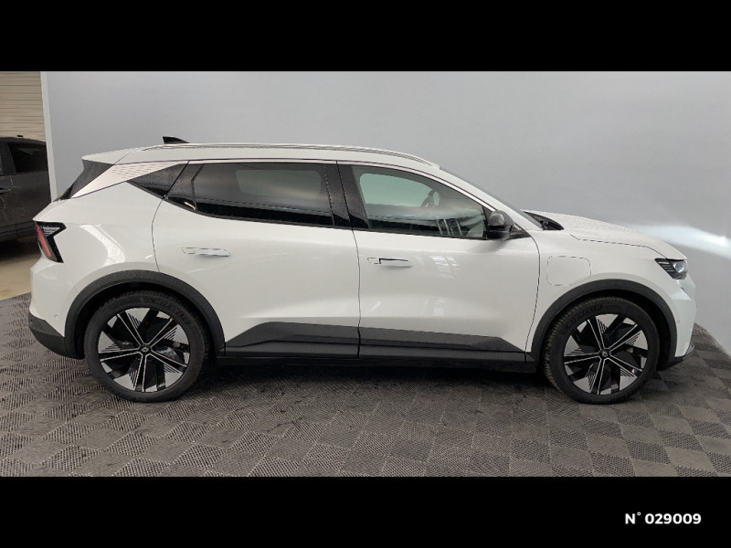 Hayon motorisé / Alerte et prévention sortie de voie (dont urgence) / Système d'optimisation de la température batterie (charge rapide DC) / Gestion automatique des feux diurnes et des essuie-glaces / Volant enduit grainé / Changement d'intensité du freinage régénératif par palettes / Sellerie tissu recyclé gris chiné/textile enduit grainé recyclé noir titane/surpiqures jaunes / Clignotants défilants / Commutation automatique des feux de route/croisement / Pompe à chaleur / Câble pour borne de recharge (mode 3 type 2 monophasé, 5m) / Volant en textile refined biosourcé / Caméra de recul digitale haute définition / Chargeur AC 11 kW triphasé / Câble pour borne de recharge (mode 3 type 2 triphasé, 5m) / Système Multimédia openR link 12" : Google intégré, préconditionnement batterie pour charge DC, audio Arkamys Auditorium / Contrôle de la traction (TCS) / Boîte de vitesse Automate à fonction continue / Jantes alliage diamantées en noir brillant 19" streamline / Sellerie tissu recyclé gris chiné/textile refined noir titane et surpiqures jaunes / Réplication smartphone / Sièges avec système ISOFIX + Tether / Avertisseur de distance de sécurité AV / Console de rangement haute avec accoudoir central coulissant / Alerte détection de fatigue / Charge AC 7kW + DC 130 kW (autonomie confort) ou DC 150 kW / Prédisposition éthylotest / Freinage automatique d'urgence en ville pour deux roues et piétons / Sièges AV manuels avec réglable en hauteur conducteur / Jantes alliage diamantées 19" streamline / Pavillon et montants / 2 feux de recul / Prise rang 1+2+3 / Rétroviseur jour/nuit automatique / Multi-sense / Tableau de bord full numérique / Carte Renault accès et démarrage mains libres / Purificateur d'air / Antenne Requin / Bouclier AV sport avec lame F1 / Projecteurs full LED directionnels avec fonction antibrouillard / Signature lumineuse AV / Airbags latéraux, milieu AV et rideaux / Alerte d'oubli de ceinture de sécurité / Kit de gonflage