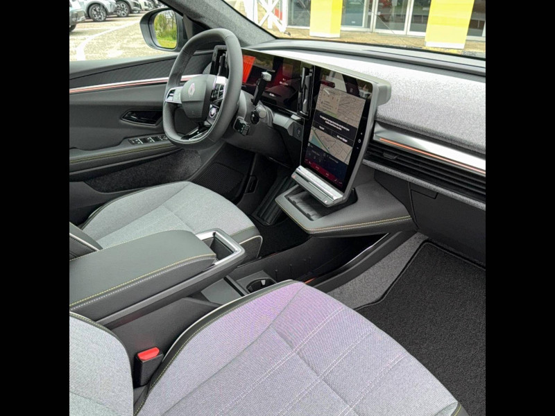 2 feux de recul / Airbags latéraux, milieu AV et rideaux / Alerte détection de fatigue / Alerte d'oubli de ceinture de sécurité / Alerte et prévention sortie de voie (dont urgence) / Antenne Requin / Avertisseur de distance de sécurité / Boîte de vitesse Automate à fonction continue / Bouclier AV sport avec lame F1 / Câble pour borne de recharge (mode 3 type 2 triphasé, 22 kW, 5m) / Caméra de recul digitale haute définition / Carte Renault accès et démarrage mains libres / Changement d'intensité du freinage régénératif par palettes / Chargeur AC 11 kW triphasé / Clignotants défilants / Commutation automatique des feux de route/croisement / Console de rangement haute avec accoudoir central coulissant / Contrôle de la traction (TCS) / Freinage automatique d'urgence en ville pour deux roues et piétons / Gestion automatique des feux diurnes et des essuie-glaces / Hayon motorisé / Jantes alliage diamantées en noir brillant 19" streamline / Kit de gonflage / Maintenance connectée, incluse pendant 8 ans / Mise à jour système (via firmware over the air FOTA), inclus pendant 5 ans / Multi-sense / Notice d'utilisation digitale embarqué dans le système multimédia du véhicule / Pack contrôle à distance (via l'application My Renault), inclus pendant 5 ans / Pavillon et montants / Pompe à chaleur / Prédisposition éthylotest / Projecteurs full LED directionnels avec fonction antibrouillard / Réplication smartphone / Rétroviseur jour/nuit automatique / Sellerie tissu recyclé gris chiné/textile refined noir titane et surpiqûres jaunes / Sièges avec système ISOFIX + Tether / Sièges AV manuels avec réglable en hauteur conducteur / Signature lumineuse AV / Système d'optimisation de la température batterie (charge rapide DC) / Système Multimédia openR link 12" : Google intégré, préconditionnement batterie pour charge DC, audio Arkamys Auditorium / Tableau de bord full numérique / Volant en textile refined biosourcé
