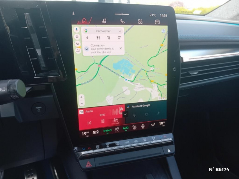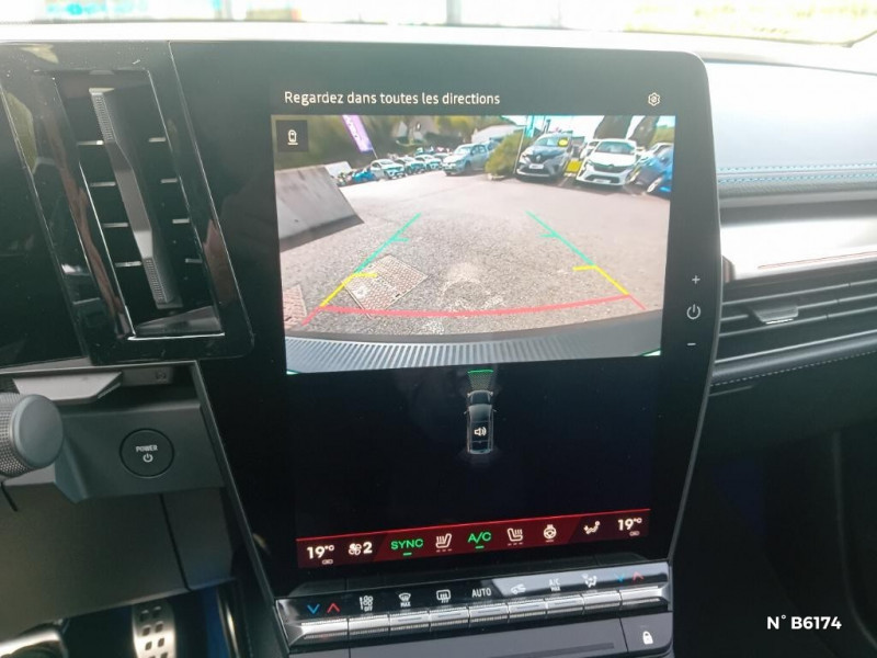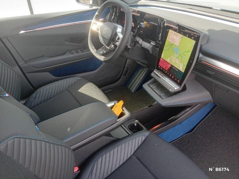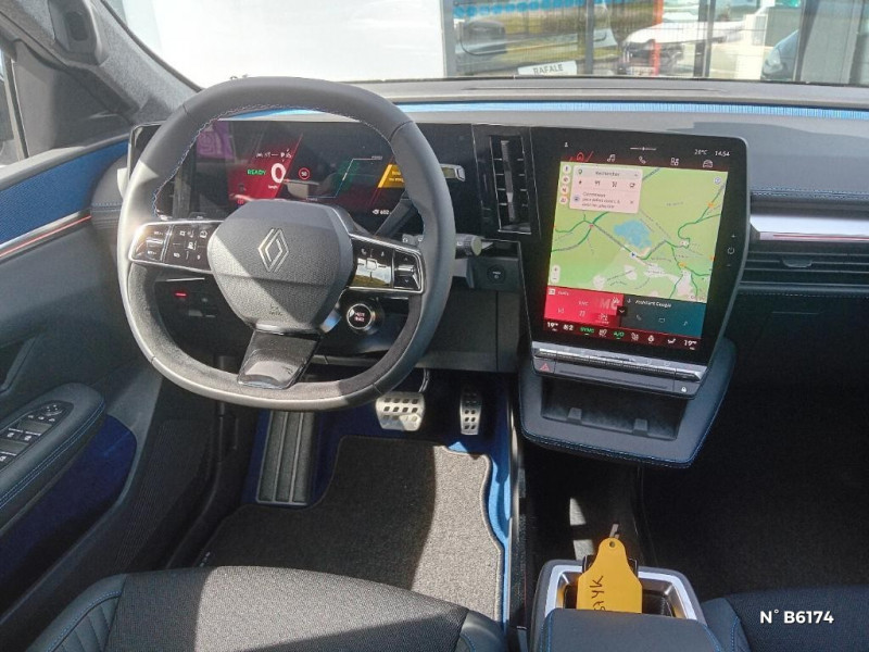 Système de reconnaissance du conducteur / Système d'optimisation de la température batterie (charge rapide DC) / Système Multimédia openR link 12" : Google intégré, préconditionnement batterie pour charge DC, audio Arkamys Auditorium / Tableau de bord full numérique / Tapis spécifique bleu / Volant chauffant / Volant en textile refined biosourcé / 2 feux de recul / Rétroviseur jour/nuit automatique / Airbags latéraux, milieu AV et rideaux / Alerte détection de fatigue / Alerte d'oubli de ceinture de sécurité / Alerte et prévention sortie de voie (dont urgence) / Antenne Requin / Avertisseur de distance de sécurité / Batterie européenne - éligibilité coup de pouce bonifié / Boîte de vitesse Automate à fonction continue / Bouclier AV sport avec lame F1 / Câble pour borne de recharge (mode 3 type 2 triphasé, 22 kW, 5m) / Caméra de recul digitale haute définition / Carte Renault accès et démarrage mains libres / Changement d'intensité du freinage régénératif par palettes / Chargeur AC 11 kW triphasé / Clignotants défilants / Commutation automatique des feux de route/croisement / Console de rangement haute avec accoudoir central coulissant / Contrôle de la traction (TCS) / Design esprit Alpine extérieur / Freinage automatique d'urgence en ville pour deux roues et piétons / Gestion automatique des feux diurnes et des essuie-glaces / Hayon motorisé / Jantes alliage diamantées en noir verni fumé 20" speedway / Kit de gonflage / Maintenance connectée, incluse pendant 8 ans / Mise à jour système (via firmware over the air FOTA), inclus pendant 5 ans / Multi-sense / Notice d'utilisation digitale embarqué dans le système multimédia du véhicule / Option esprit Alpine (sièges AV et volant chauffant, décors esprit Alpine, jantes spécifiques 20') / Pack connectivité avancée / Pack connectivité standard, via l'app My Renault / Pack contrôle à distance (via l¿application My Renault), inclus pendant 5 ans / Pavillon et montants / Pompe à chaleur / Prédisposition éthylotest / Projecteurs full LED directionnels avec fonction antibrouillard / Réplication smartphone / Sellerie maille embossée recyclée / textile refined matelassé noir titane et surpiqûres bleu Alpine / Sièges AV chauffants et volant chauffant / Sièges AV électriques à mémoire avec réglage et massage lombaire siège conducteur / Sièges avec système ISOFIX + Tether / Sièges typés sport, volant Alpine, planche de bord spécifique, pièces décor bleues / Signature lumineuse AV